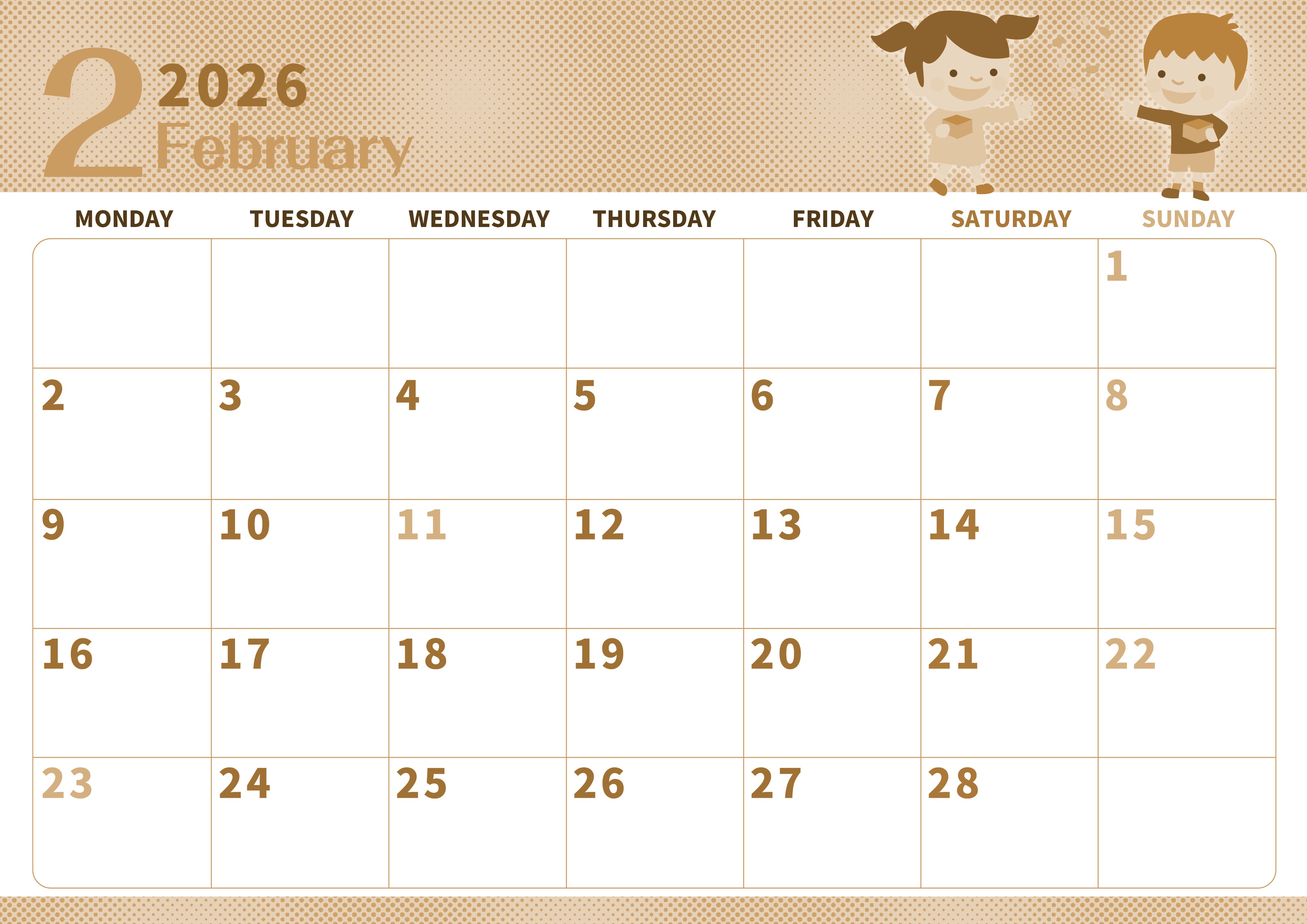 2026年2月横型レトロな月曜始まり 子供たちがかわいいイラストA4無料セピア調カレンダー(2026-00620201)