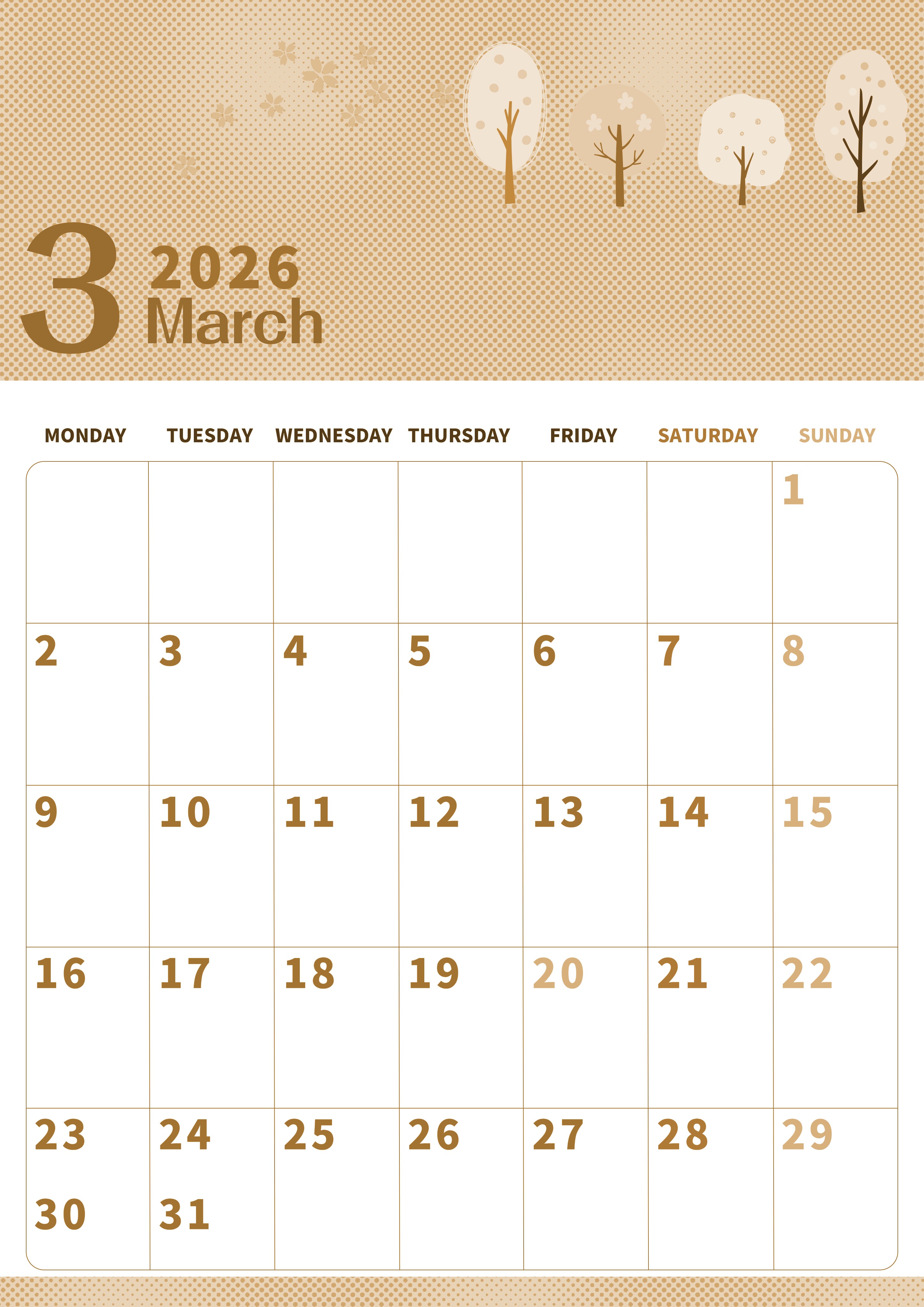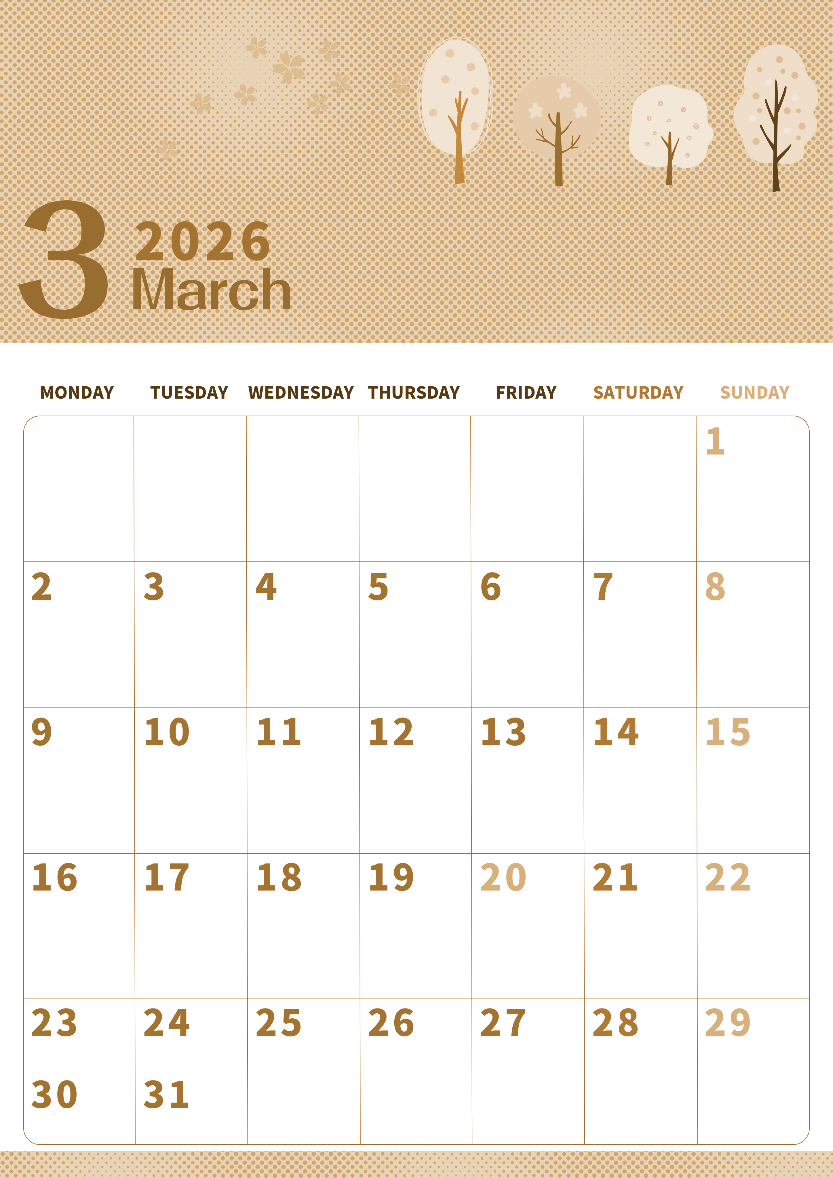 2026年3月縦型レトロな月曜始まりの無料テンプレートセピア調カレンダーです。桜の木が並んで仲良く立っているかわいいイラストセピア調カレンダーです。月曜始まりなので勉強や仕事のタスク管理を書き込みするのにぴったりです。(2026-00620311)