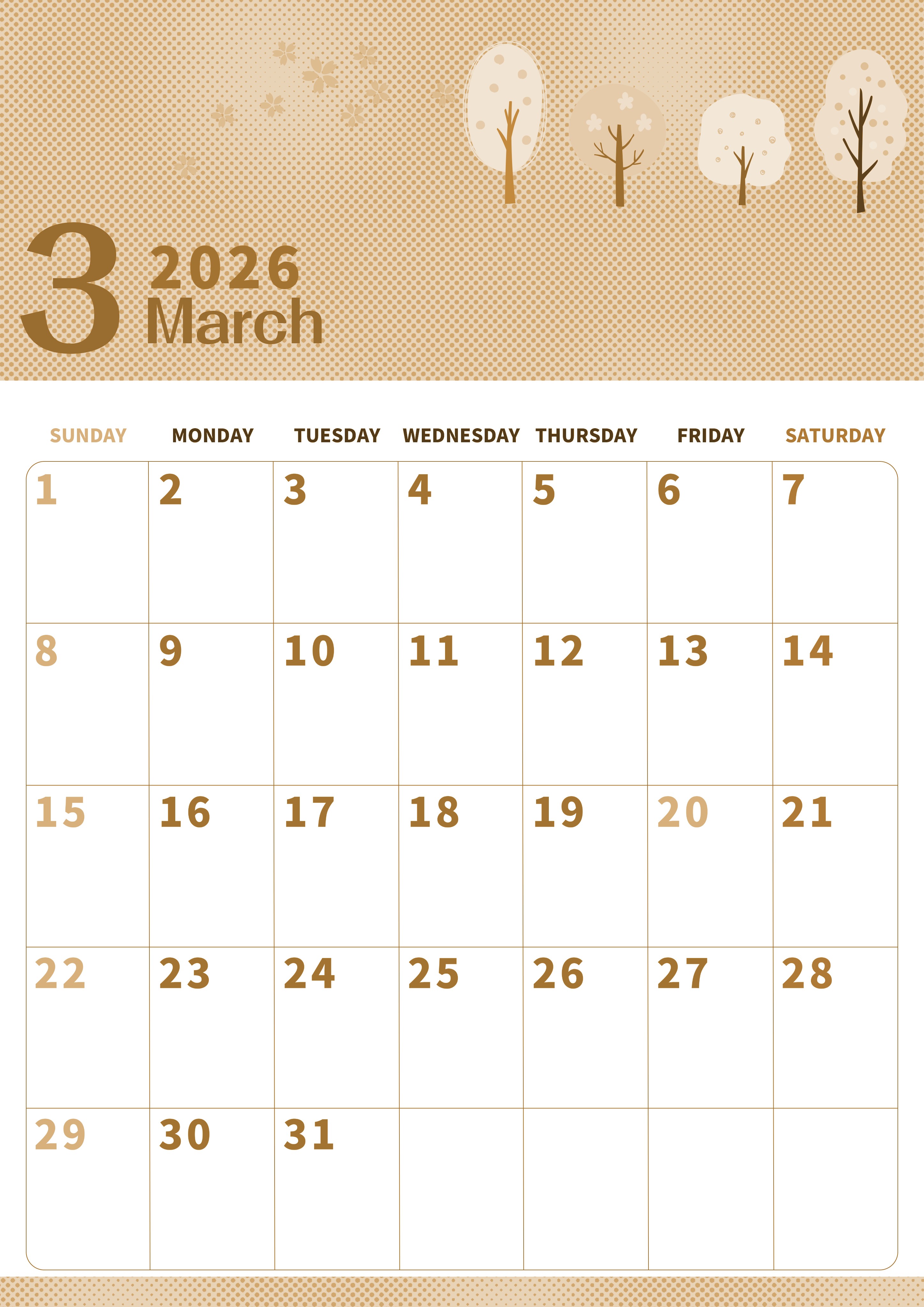 2026年3月縦型レトロな日曜始まりの無料テンプレートセピア調カレンダーです。4本の桜の木のイラストが目を引くかわいいデザインのセピア調カレンダーです。A4サイズの白紙に印刷をするだけですぐに使える無料イラストテンプレートです。(2026-00620310)