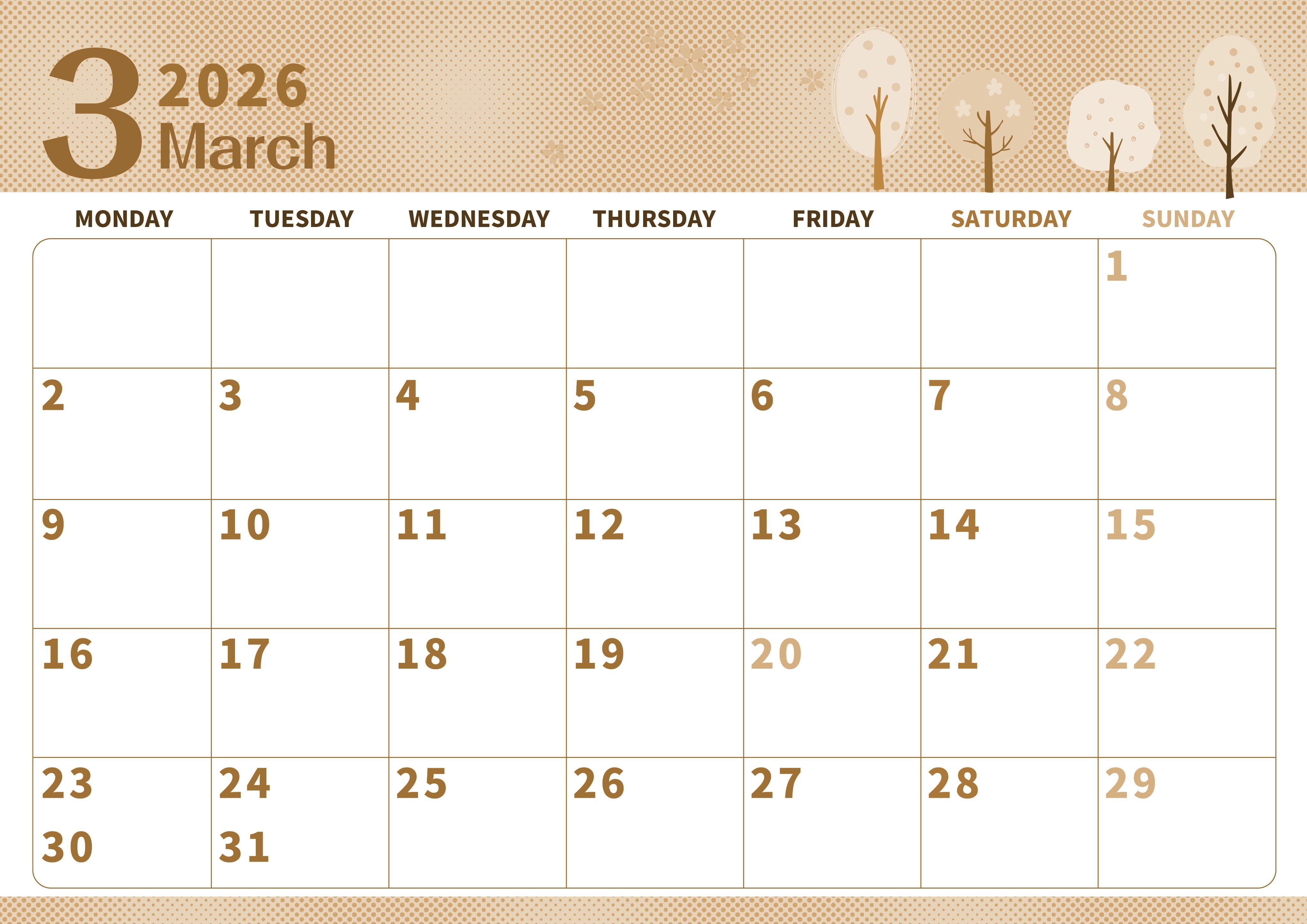 2026年3月横型レトロな月曜始まりの無料テンプレートセピア調カレンダーです。桜の木のイラストがポップでかわいいセピア調カレンダーのフリー素材です。文字が大きいので見やすい実用的なフォーマットとなっています。(2026-00620301)