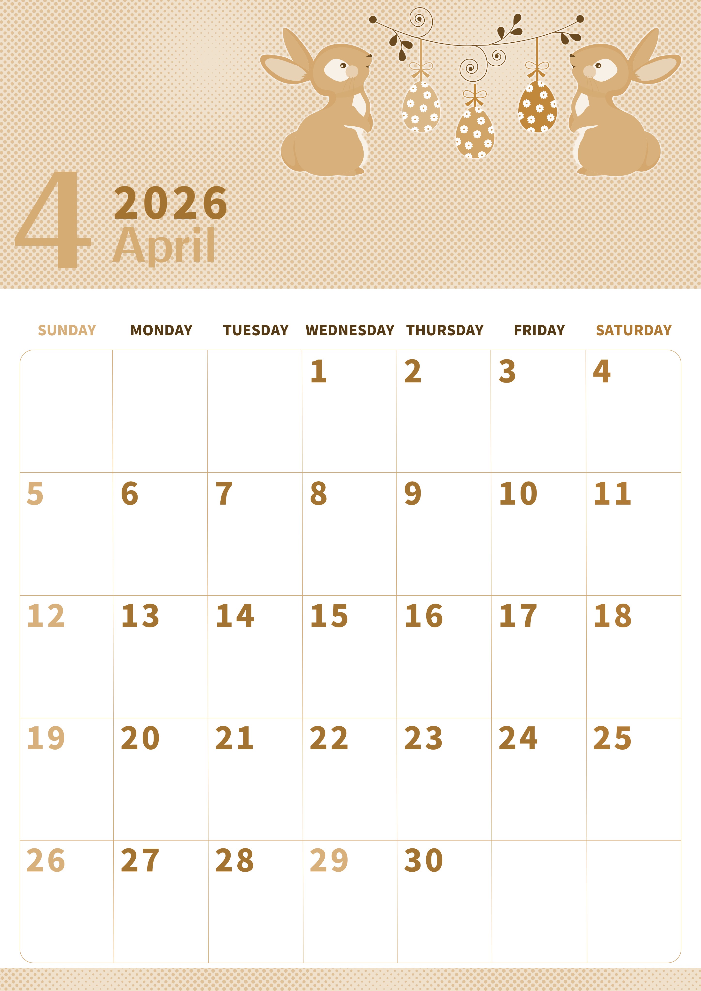 2026年4月縦型レトロな日曜始まりの無料テンプレートセピア調カレンダーです。もふもふのウサギのペアがかわいいイラストがついているセピア調カレンダーです。罫線もあるので1日1日のタスク管理にぴったりです。(2026-00620410)