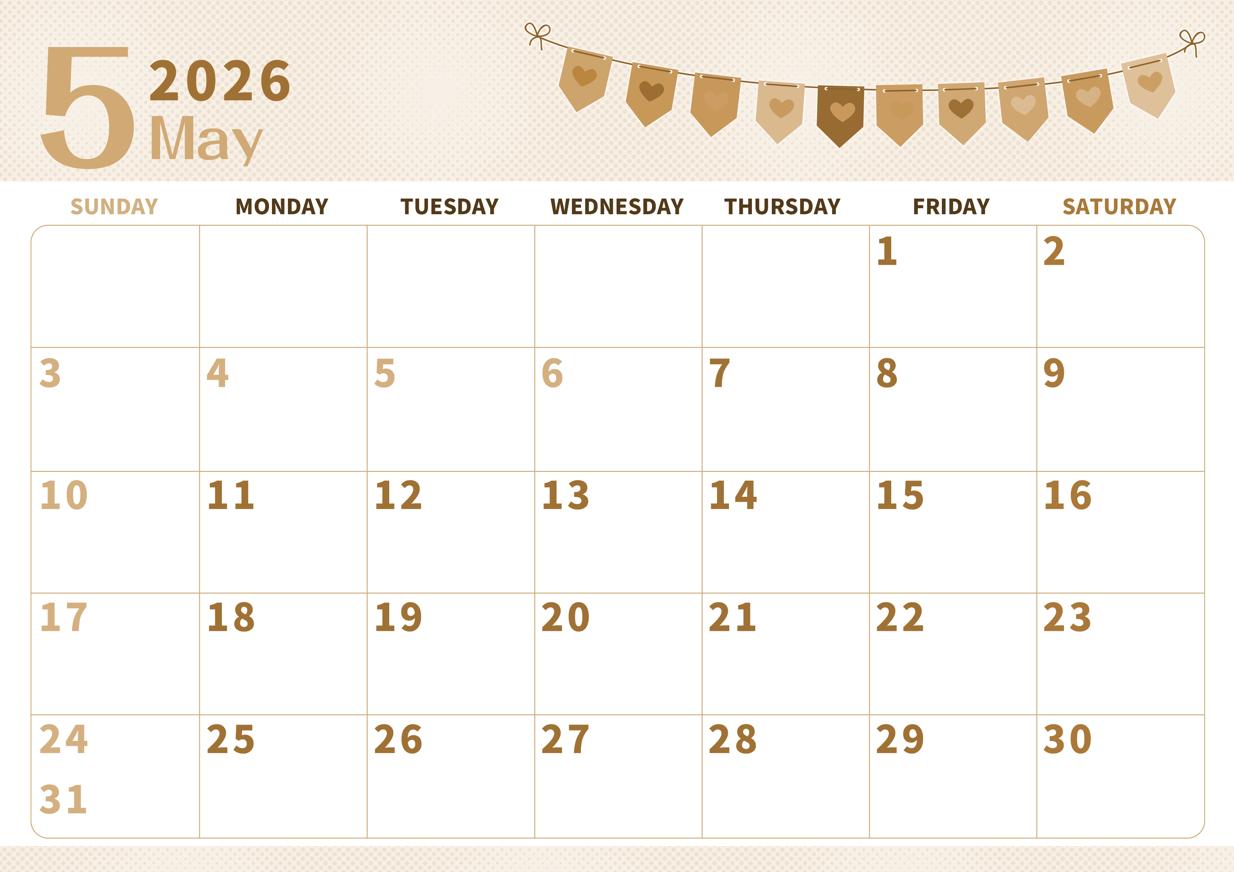 2026年5月横型レトロな日曜始まりの無料テンプレートセピア調カレンダーです。旗が掲げられていてフェスティバル感が溢れ出ている背景のかわいいイラストセピア調カレンダーは字が大きいので使いやすいです。(2026-00620500)
