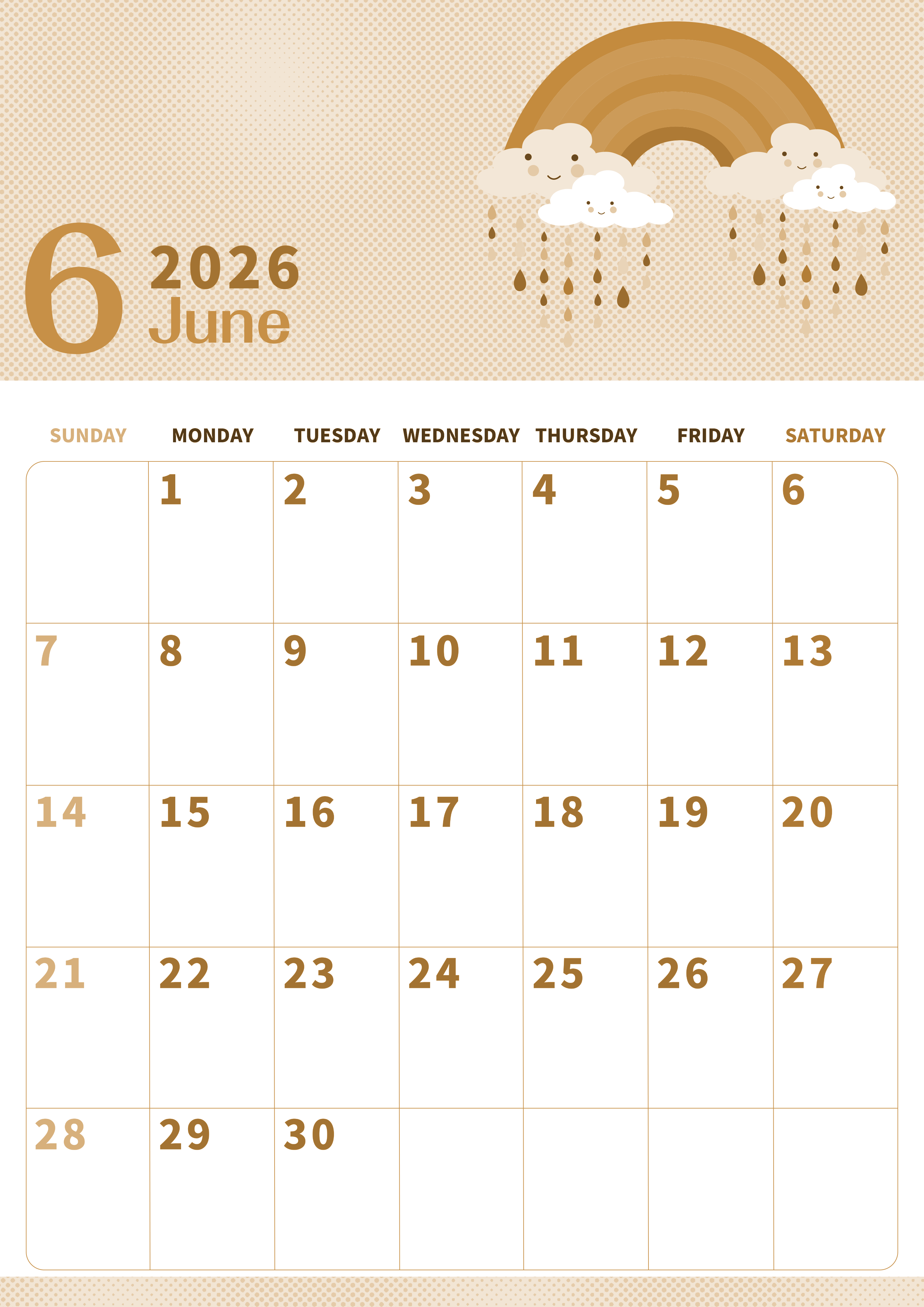 2026年6月縦型レトロな日曜始まりの無料テンプレートセピア調カレンダーです。真っ白な雨雲がにっこりと笑っているイラストがキュートでかわいいセピア調カレンダーです。縦向きのセピア調カレンダーをお探しの方にダウンロードをおすすめします。(2026-00620610)