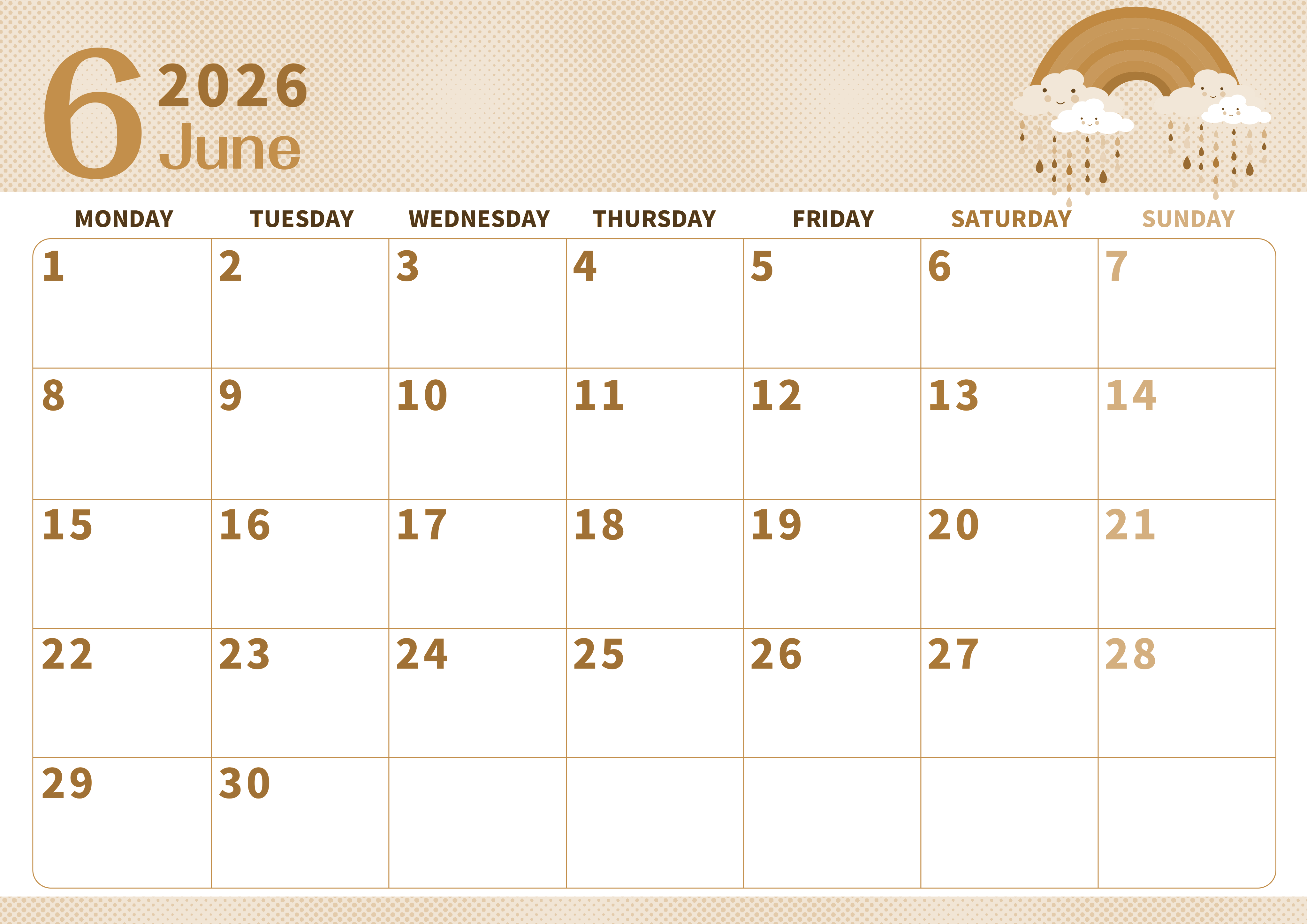 2026年6月横型レトロな月曜始まりの無料テンプレートセピア調カレンダーです。月曜始まりでイラストがかわいいセピア調カレンダーです。雨雲からカラフルな雨がぽつぽつと降り注いでいる様子が宝石みたいで綺麗です。(2026-00620601)