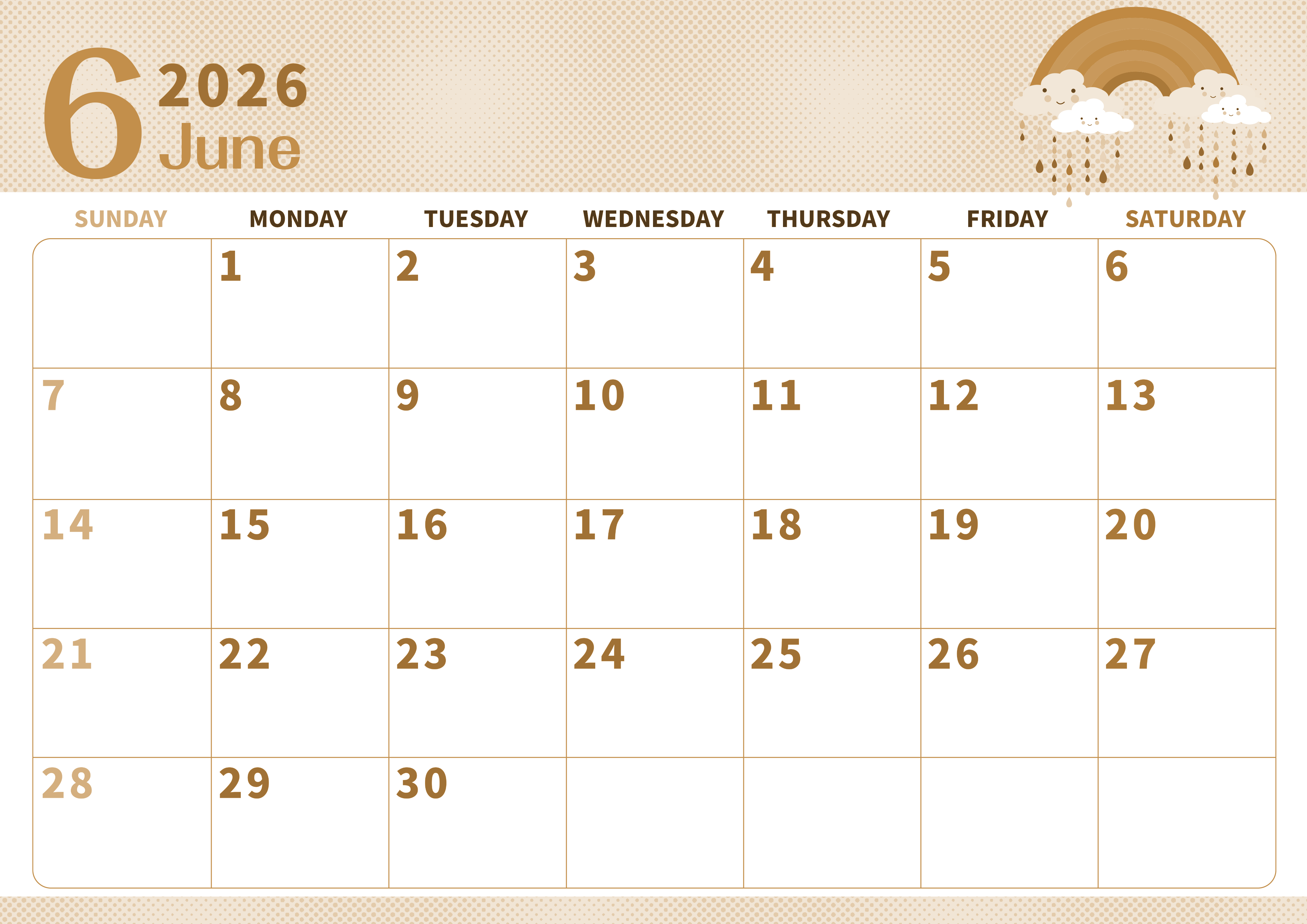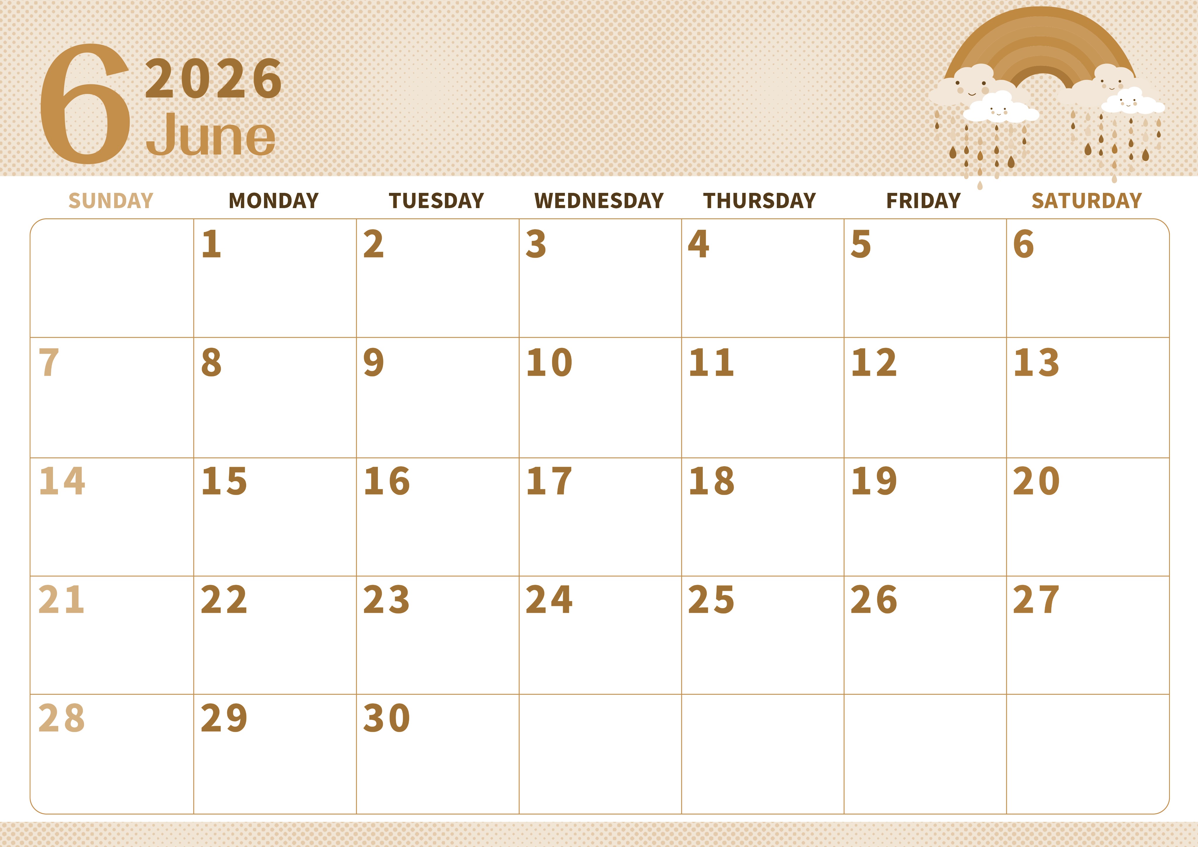 2026年6月横型レトロな日曜始まりの無料テンプレートセピア調カレンダーです。虹を支えている雨雲カップルのイラストがとてもかわいい使いたくなる気持ちをくすぐるようなフォーマットのA4無料セピア調カレンダーです。(2026-00620600)