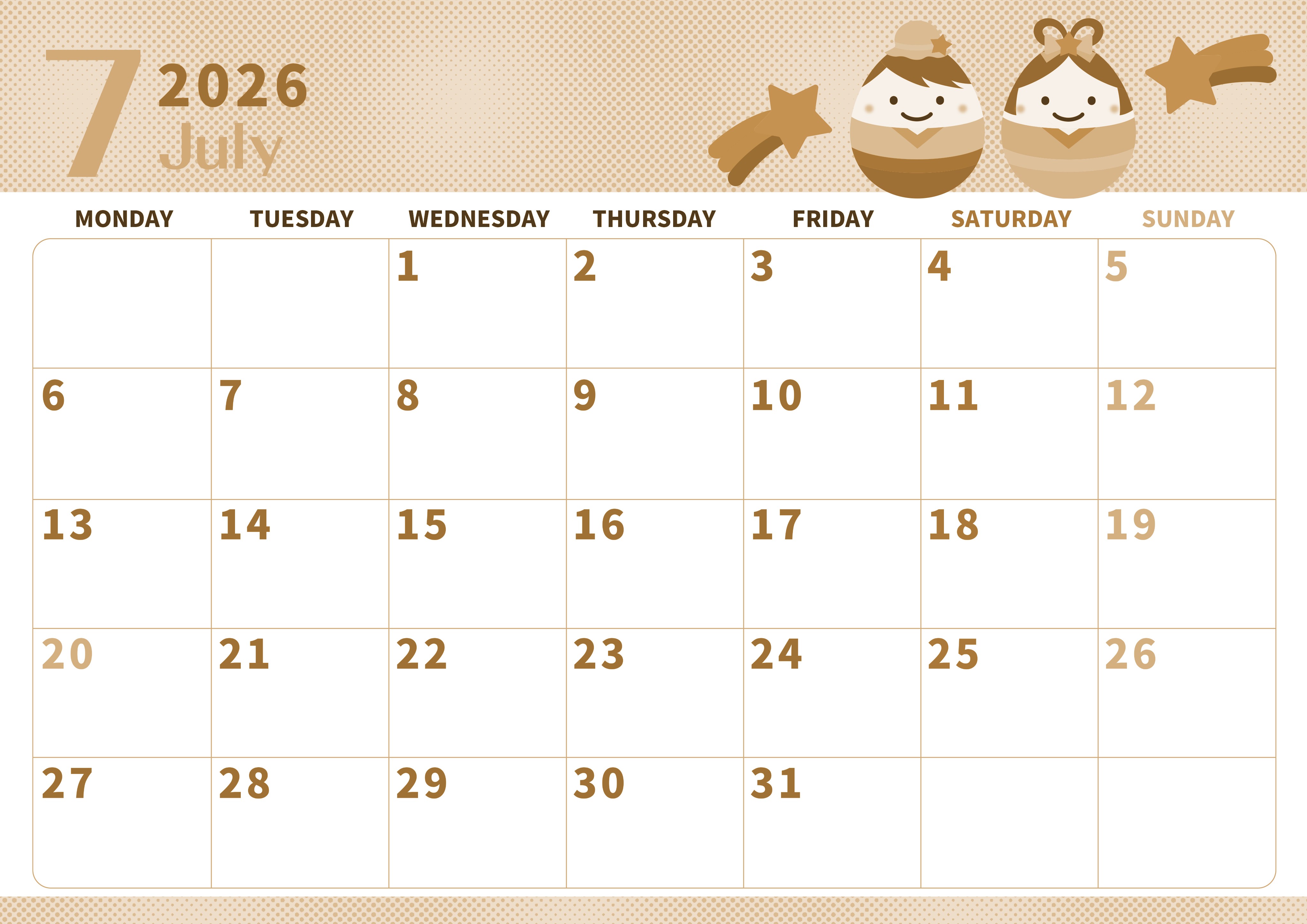 2026年7月横型レトロな月曜始まりの無料テンプレートセピア調カレンダーです。季節の行事をテーマにしたセピア調カレンダーは月曜始まりなのでタスク管理に向いています。コロコロとした織姫と彦星がポップでかわいい細部までしっかりと描かれたイラストです。(2026-00620701)