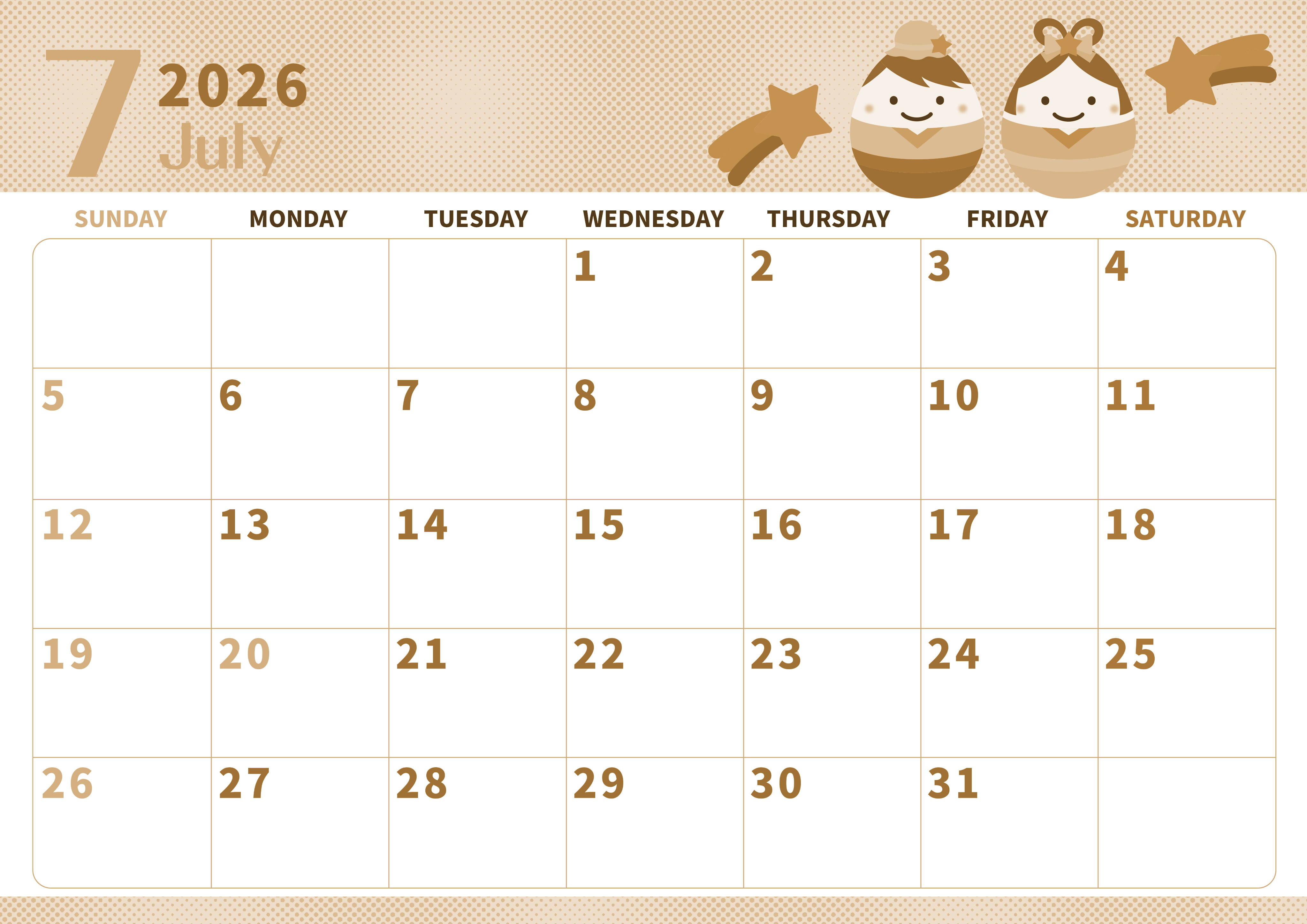 2026年・無料のカレンダーテンプレート 2026年7月横型レトロな日曜始まり 季節の行事のかわいいイラストA4無料セピア調カレンダー(2026-00620700) 素材状デザイン王 2025年4月2日 2026年7月横型レトロな日曜始まりの無料テンプレートセピア調カレンダーです。コロンとした卵型レトロな織姫と彦星のイラストがとてもかわいい季節の行事をテーマにしたイラストセピア調カレンダーです。(2026-00620700) 7月 横型のカレンダー 日曜始まり セピア カレンダーデザイン-0062