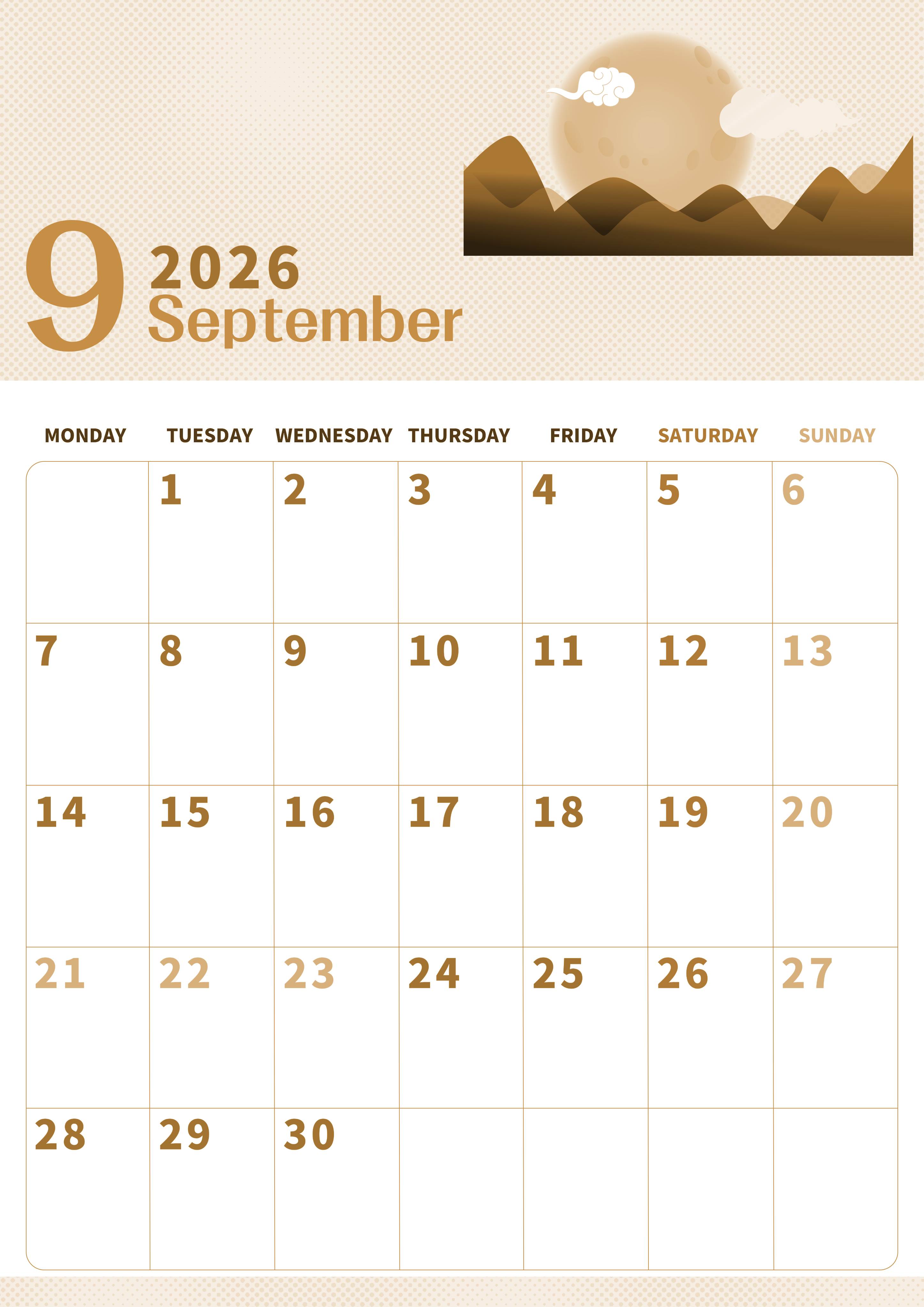 2026年9月縦型レトロな月曜始まりの無料テンプレートセピア調カレンダーです。季節感のあるイラストが特徴のかわいいセピア調カレンダーです。月曜始まりなので家族や子供や夫婦のスケジュールを整理整頓するのに適しています。(2026-00620911)