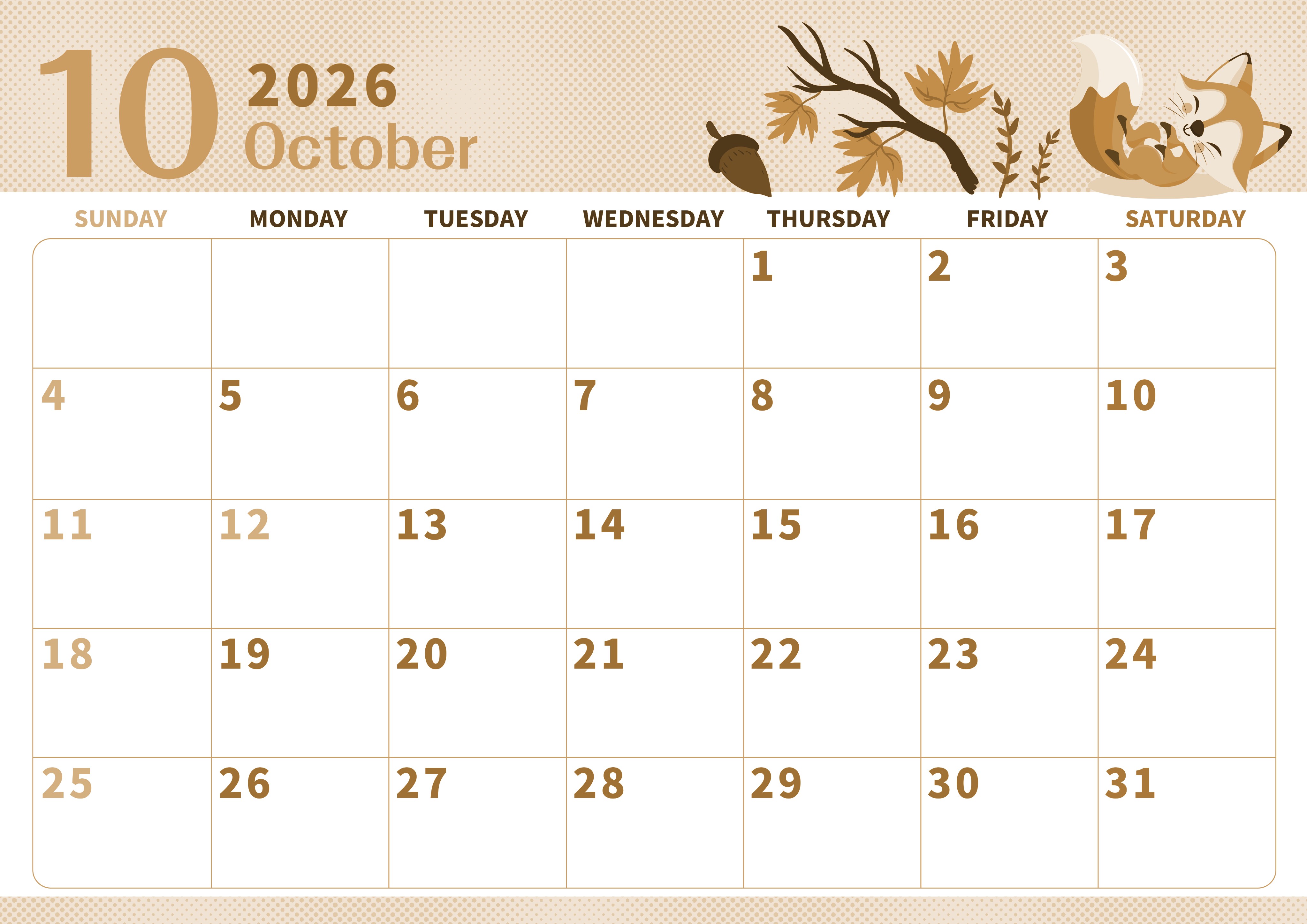 2026年10月横型レトロな日曜始まりの無料テンプレートセピア調カレンダーです。キツネが笑い転げているイラストがかわいいだけでなく癒し系でもあるので秋の孤独感や焦燥感を和らげてくれるようなフリー素材となります。(2026-00621000)