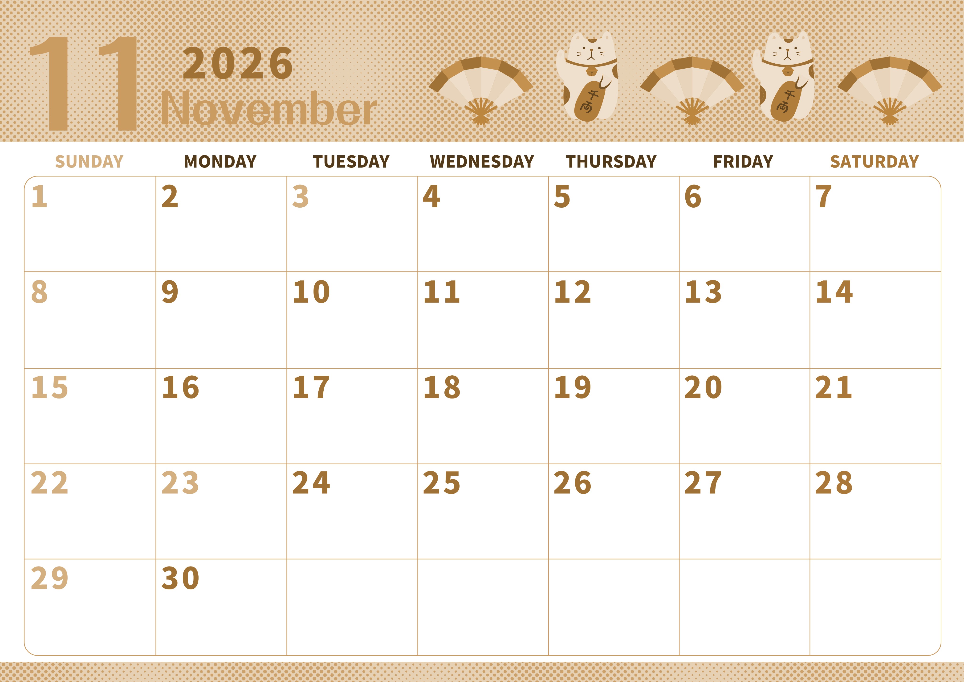 2026年11月横型レトロな日曜始まりの無料テンプレートセピア調カレンダーです。招き猫と扇子を交互に描き上げたシンプルでありながらもかわいいイラストです。余白が充分にあるので忙しい人にも使い勝手が良いです。(2026-00621100)