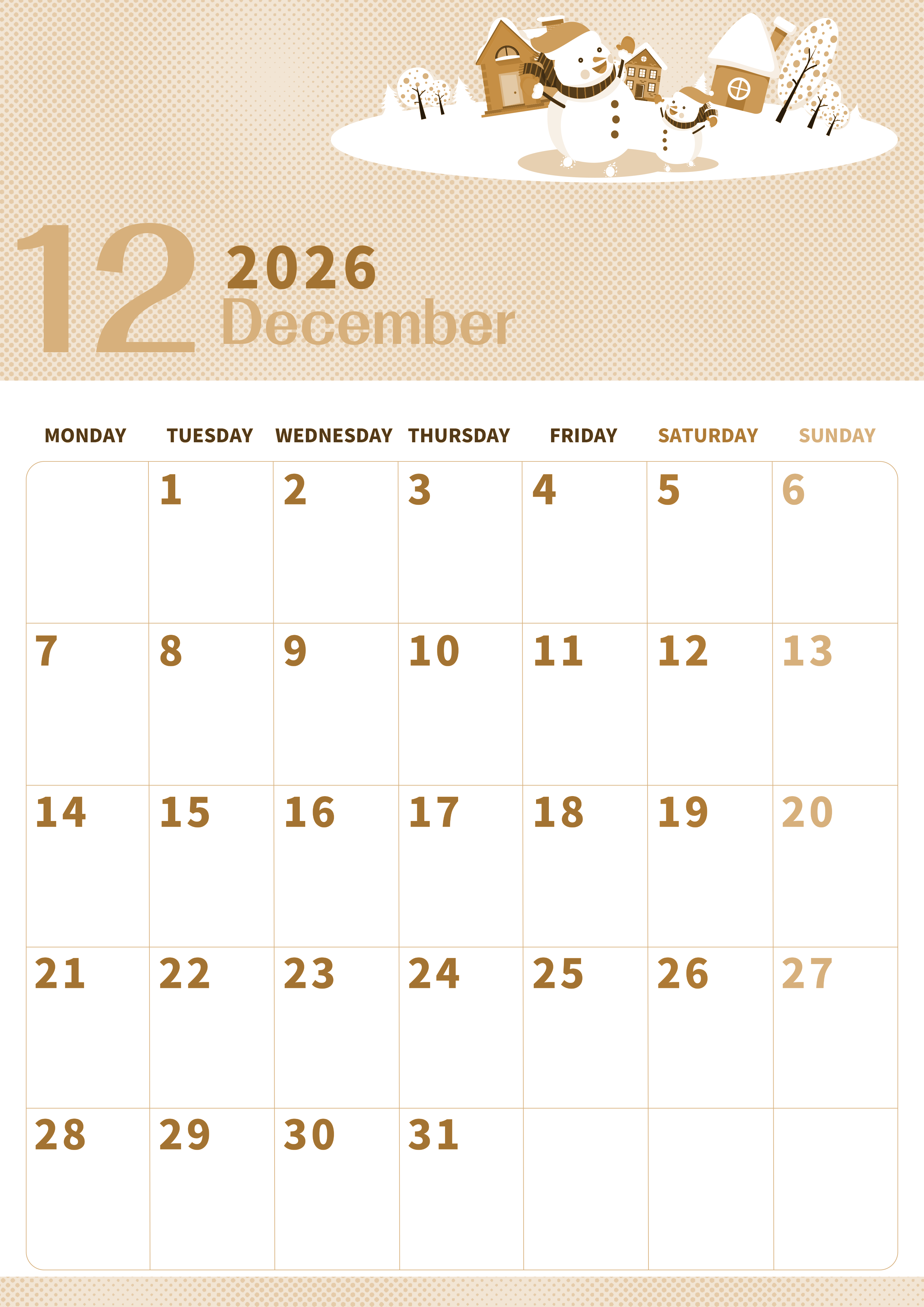 2026年12月縦型レトロな月曜始まりの無料テンプレートセピア調カレンダーです。月曜始まりなので計画の把握や振り返りがやりやすいです。雪景色のイラストもワンポイントになっていてとてもかわいいです。(2026-00621211)