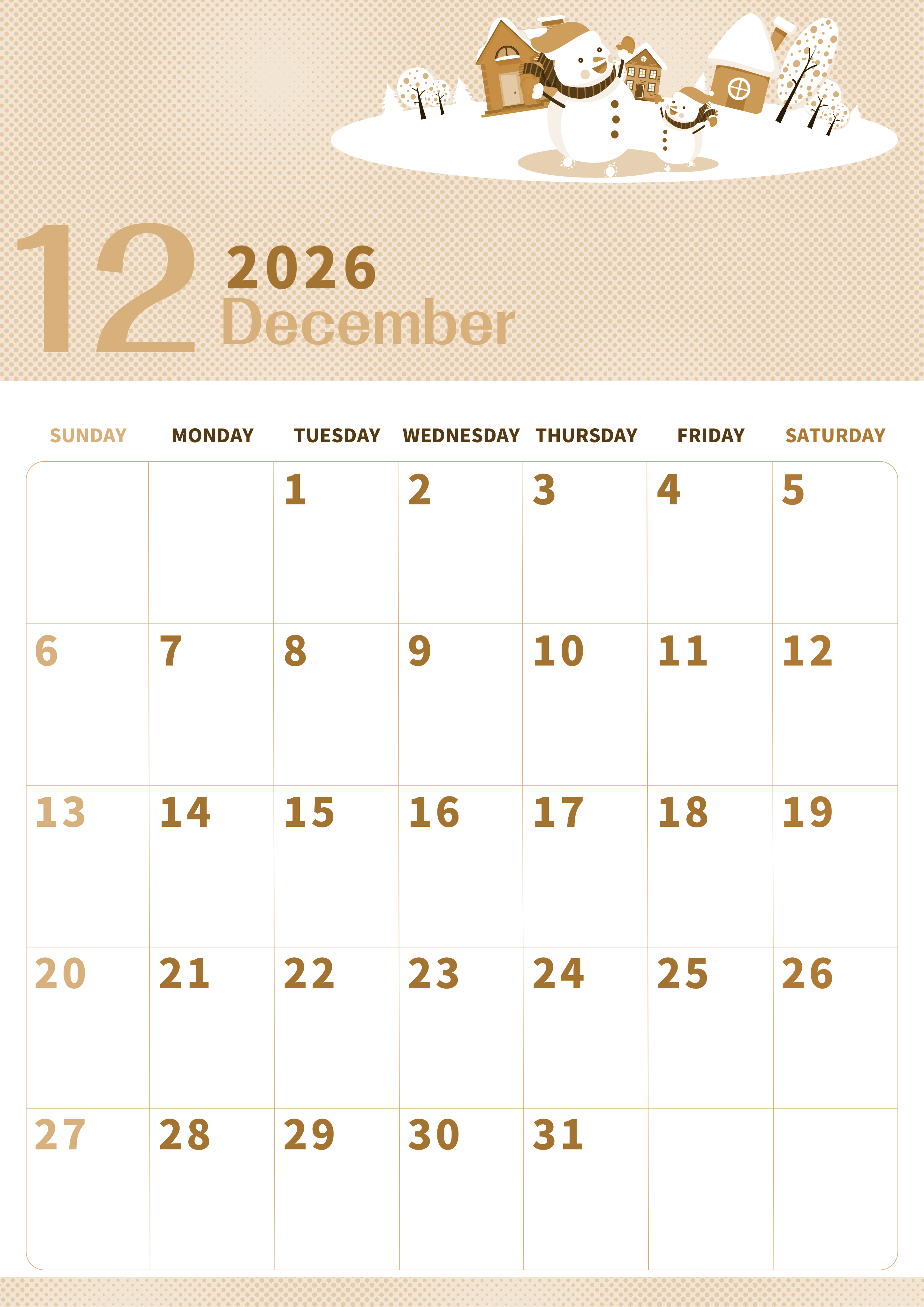 2026年12月縦型レトロな日曜始まりの無料テンプレートセピア調カレンダーです。ニコニコと笑顔で元気なかわいい雪だるまたちが雪景色に溶け込んでいる様子をイラストにしました。曜日ごとに文字の色分けもされています。(2026-00621210)