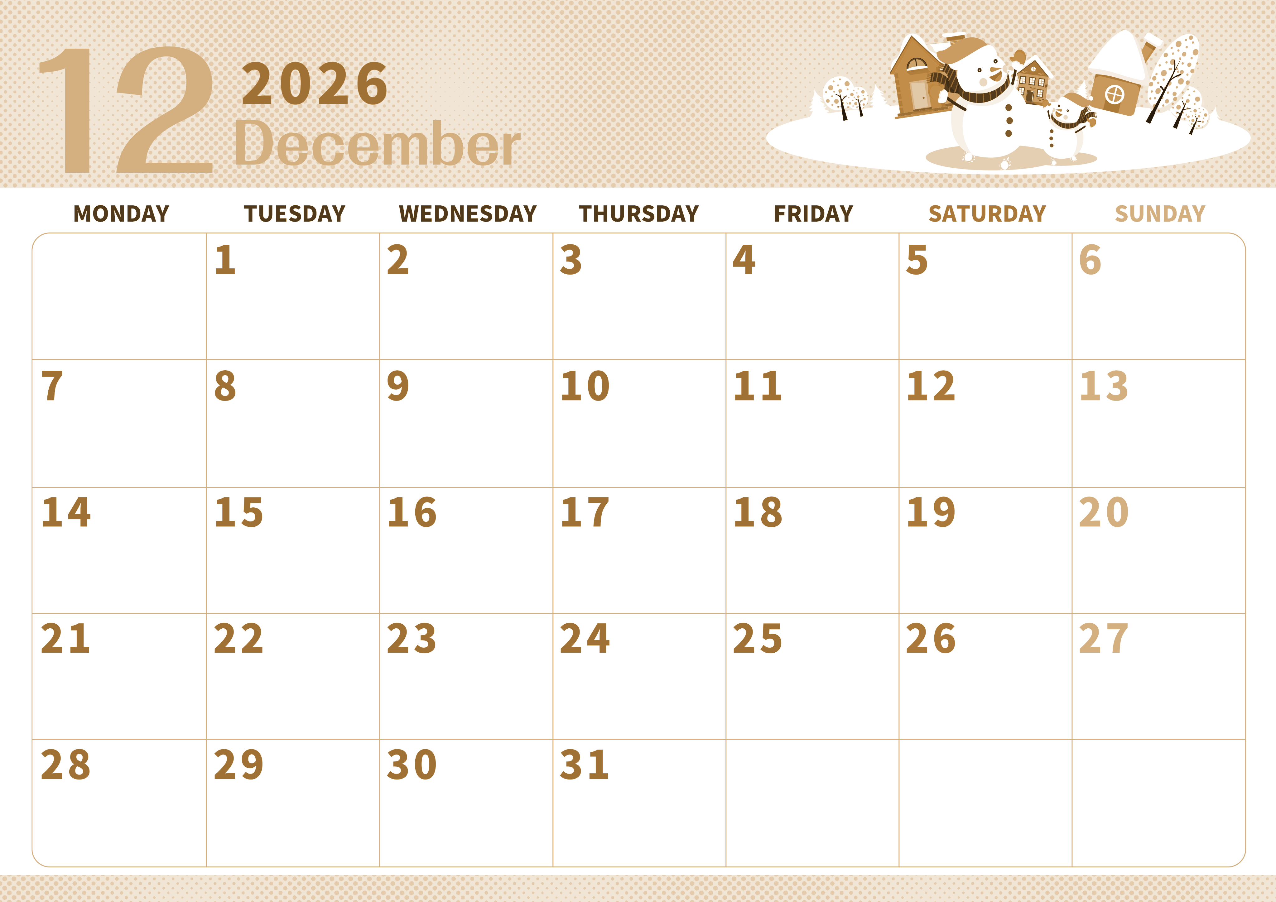 2026年12月横型レトロな月曜始まりの無料テンプレートセピア調カレンダーです。真っ白な雪景色をかわいいテイストで描きました。イラストだけでなくセピア調カレンダーの罫線やレイアウトも利便性を考慮して作成しました。(2026-00621201)