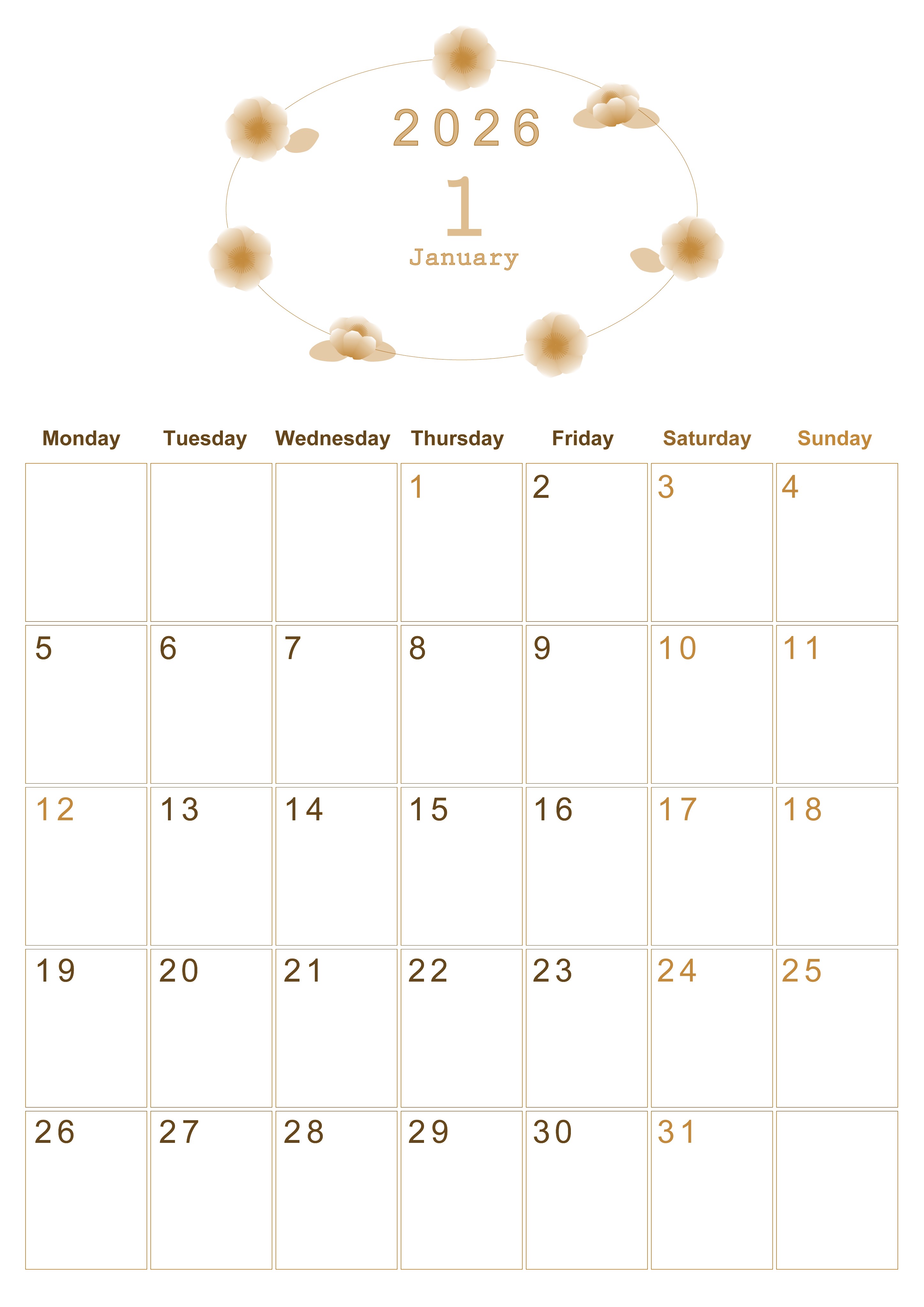 2026年1月縦型レトロな月曜始まり 花々のイラストのかわいいA4無料セピア調カレンダー(2026-00630111)