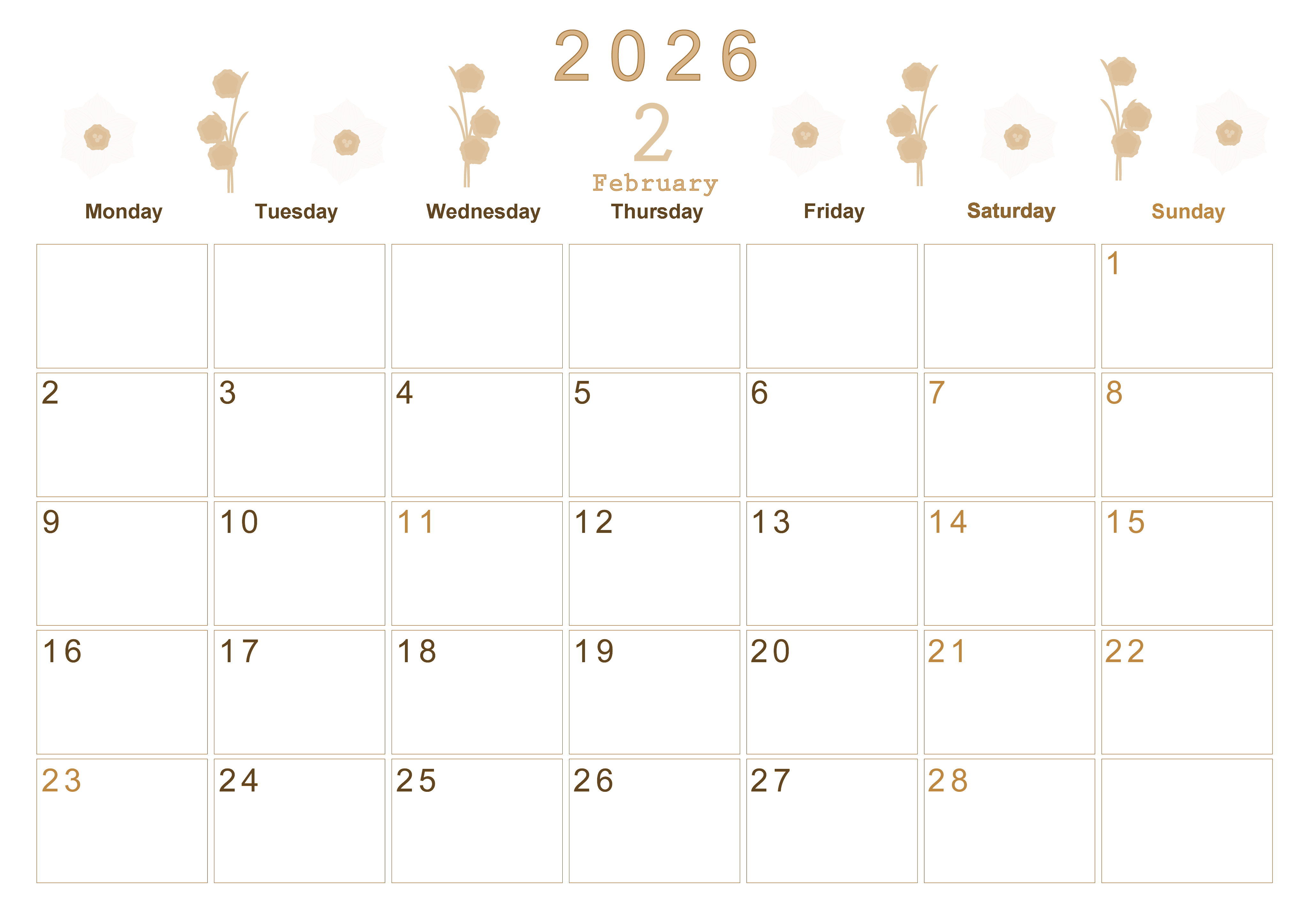 2026年2月横型レトロな月曜始まりの無料テンプレートセピア調カレンダーです。罫線で明確に区切られているので見やすい月曜始まりのセピア調カレンダーでフォーマットも実用性が高いものとなっております。草花のイラストもかわいいのがポイントです。(2026-00630201)
