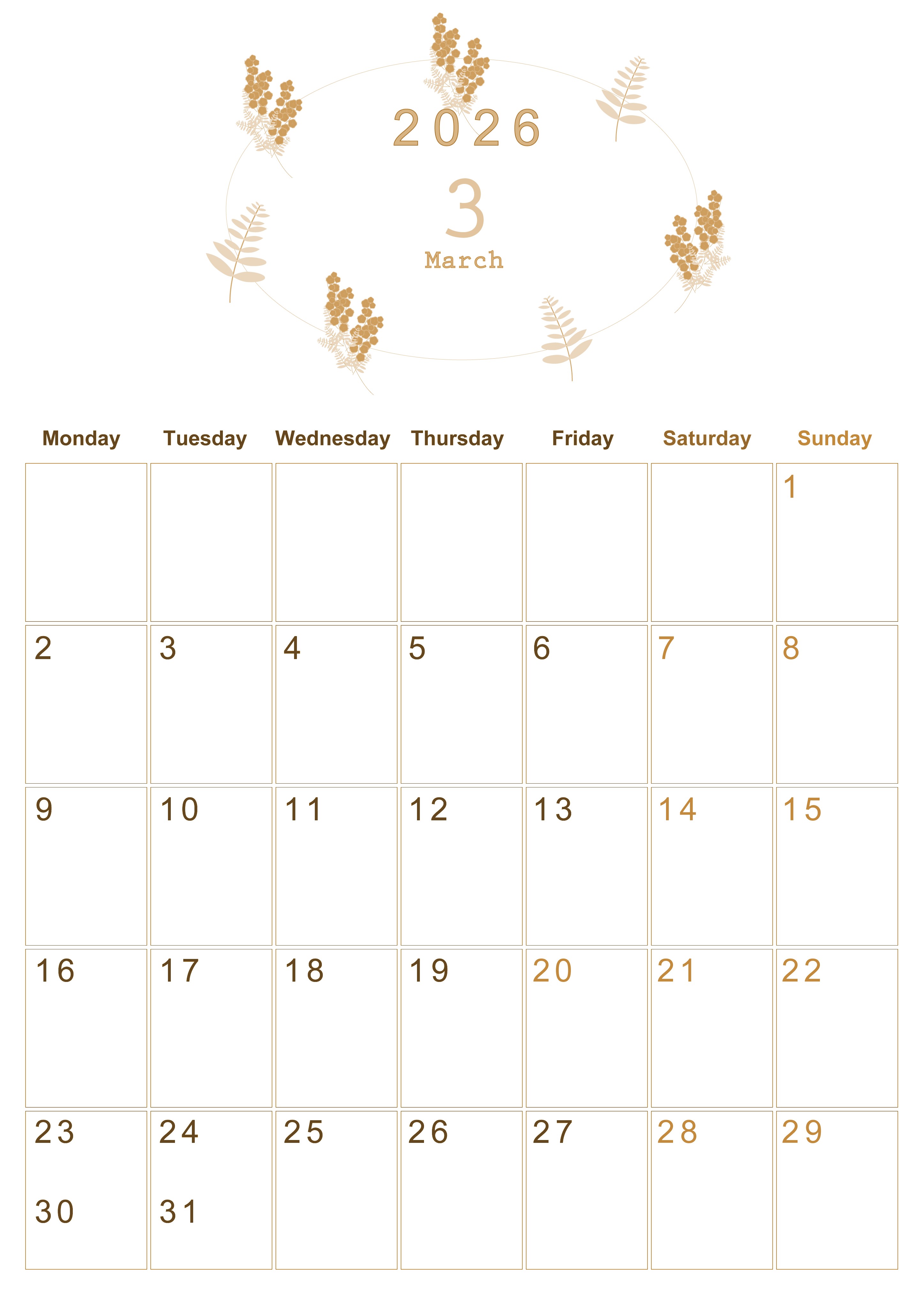 2026年3月縦型レトロな月曜始まりの無料テンプレートセピア調カレンダーです。フラワーイラストが上品でかわいいセピア調カレンダーは月曜始まりで休みの予定や仕事の予定を把握するのに向いているフリー素材となっています。(2026-00630311)
