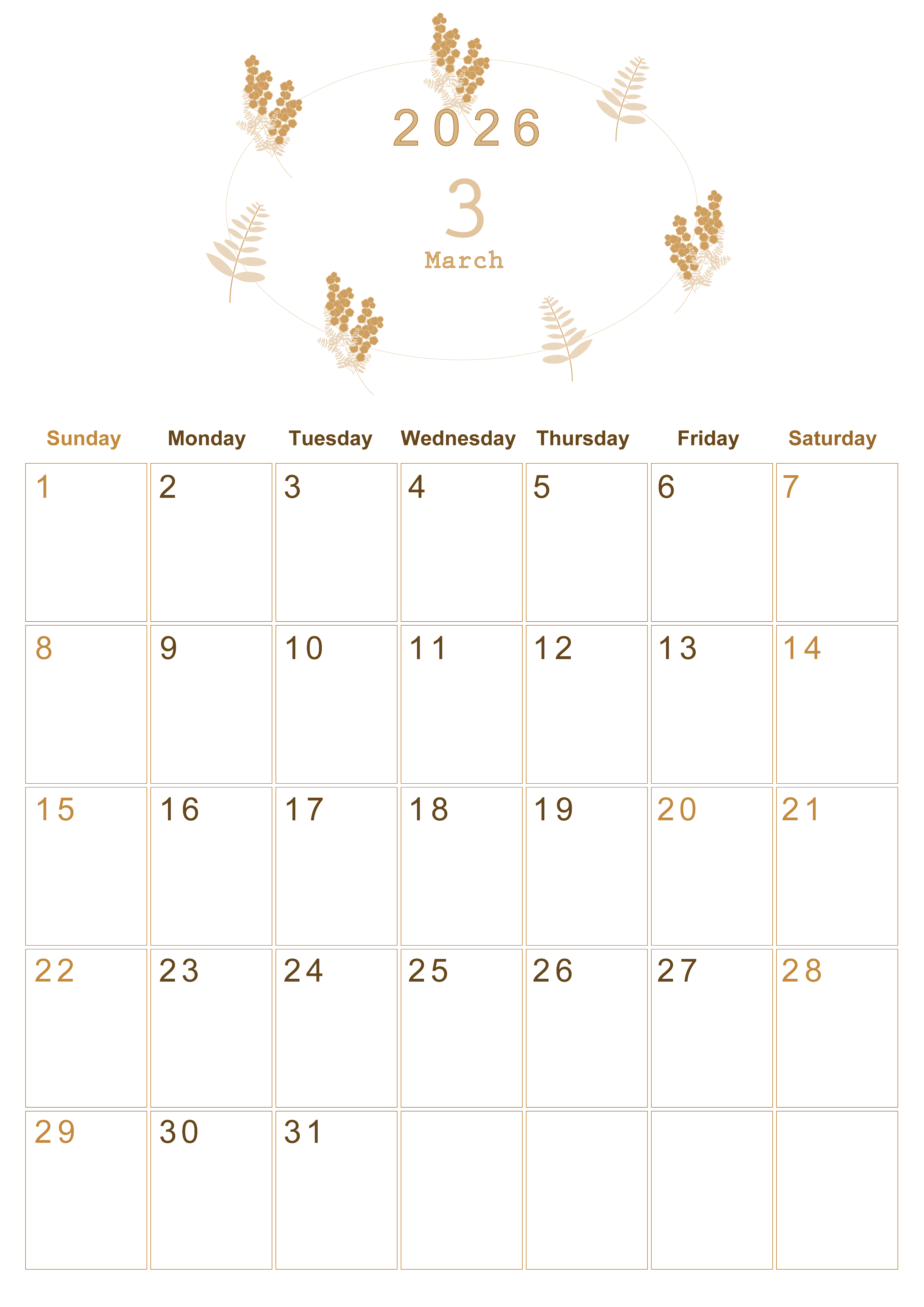 2026年3月縦型レトロな日曜始まりの無料テンプレートセピア調カレンダーです。イエローのフラワーがちりばめられているかわいいイラストがほどこされた罫線がくっきりしている使い勝手の良いセピア調カレンダー無料テンプレートです。(2026-00630310)