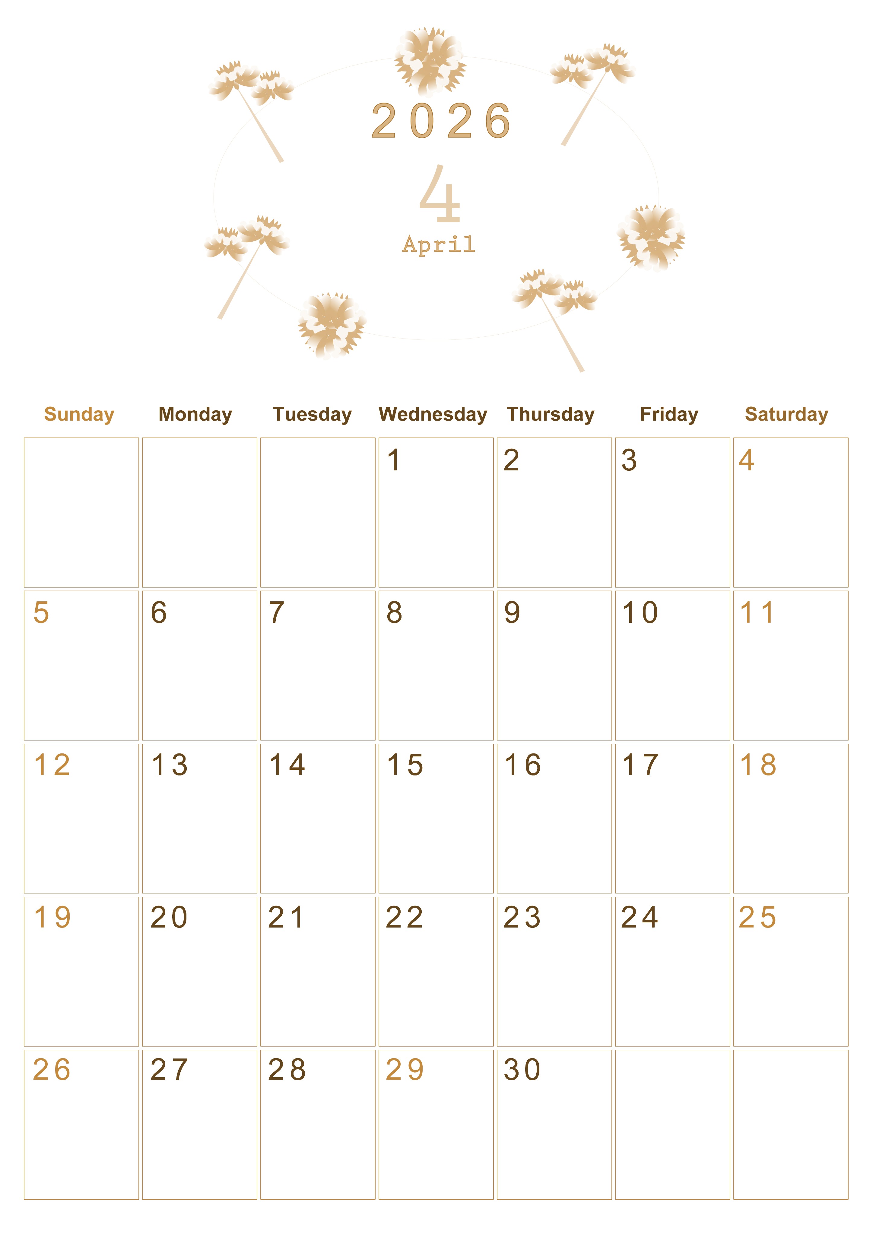 2026年4月縦型レトロな日曜始まりの無料テンプレートセピア調カレンダーです。牡丹桜のイラストがかわいいシンプルテイストのセピア調カレンダーとなっています。書き込みできるフォーマットなので手書きがおすすめです。(2026-00630410)