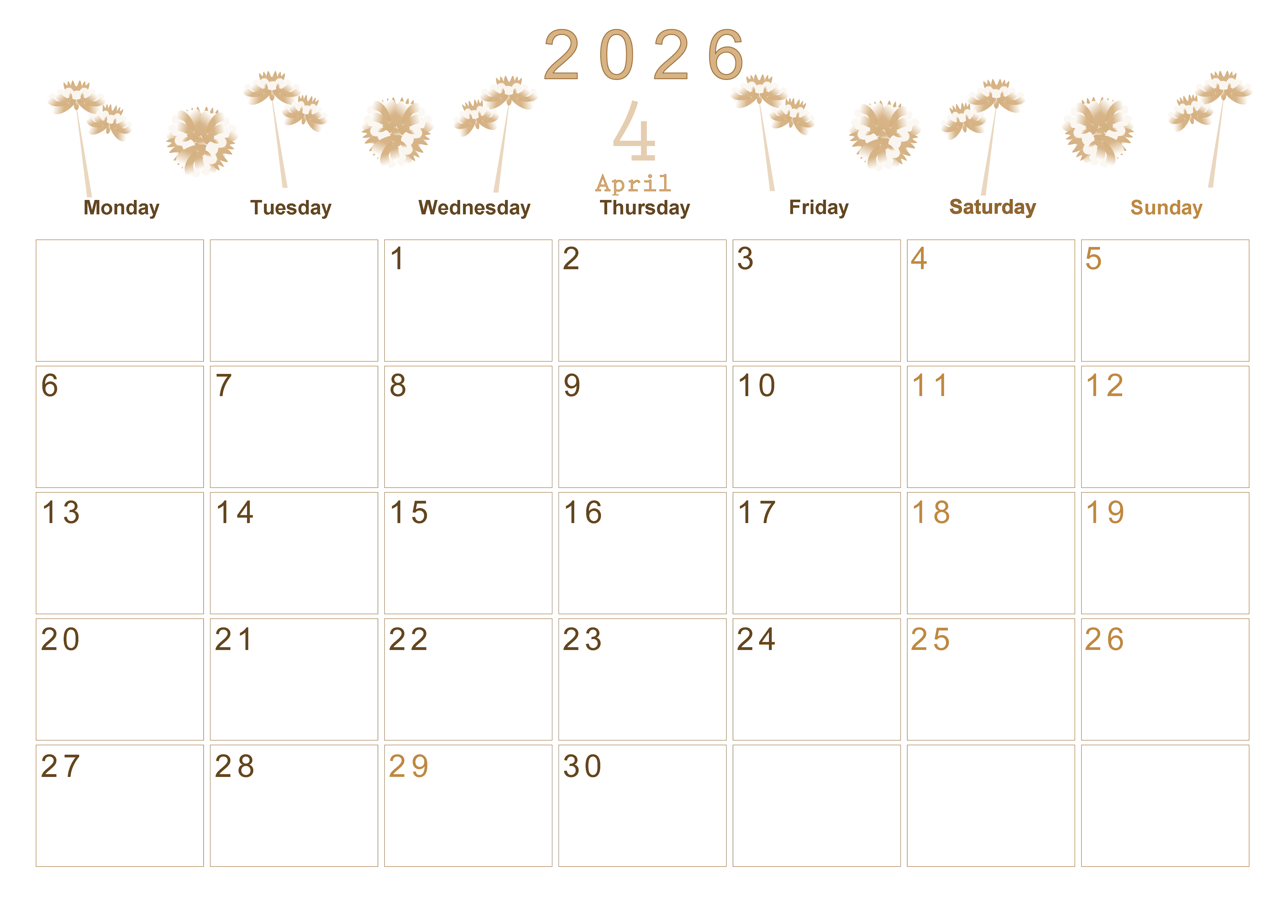 2026年4月横型レトロな月曜始まりの無料テンプレートセピア調カレンダーです。上品なフォントと牡丹桜のかわいいイラストが使う人を楽しませてくれるようなレイアウトの見やすいセピア調カレンダー素材となっています。(2026-00630401)