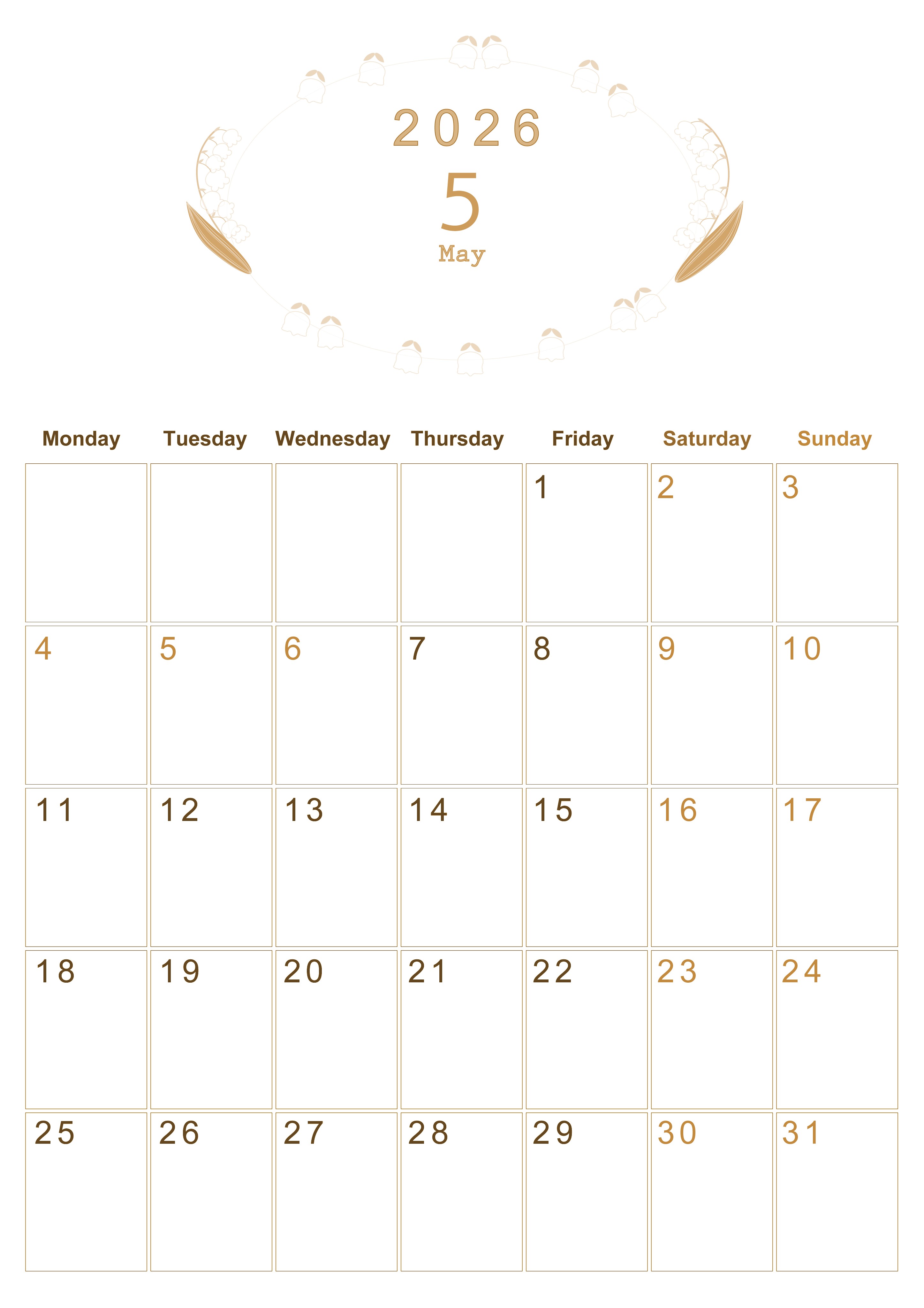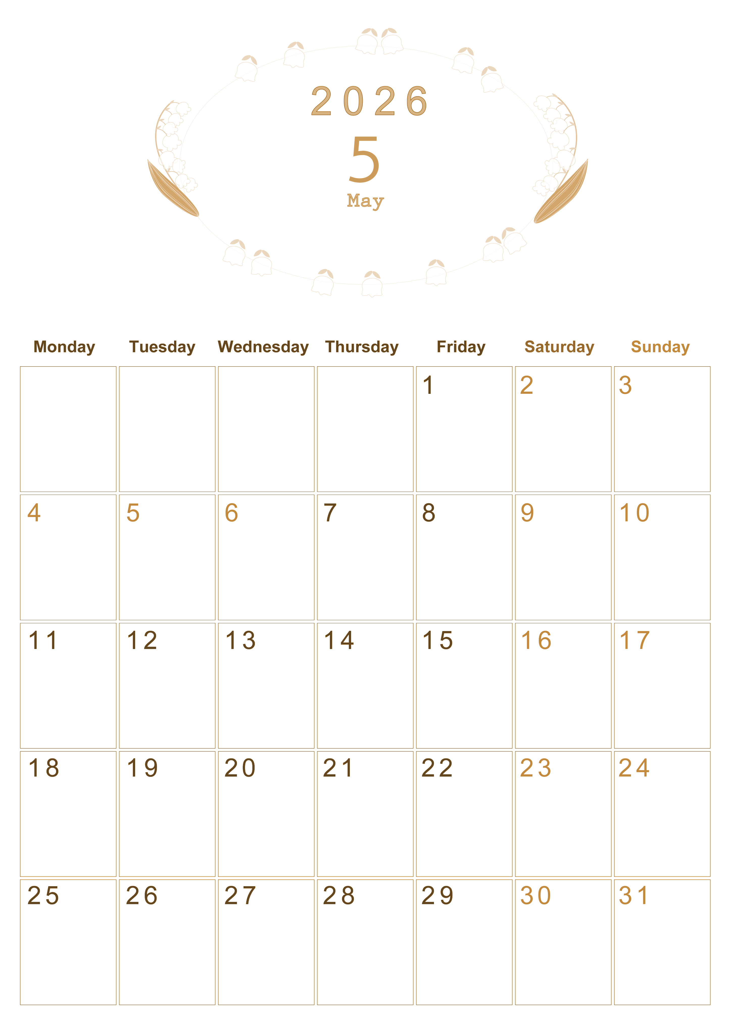 2026年5月縦型レトロな月曜始まりの無料テンプレートセピア調カレンダーです。月曜始まりで計画を立てやすいセピア調カレンダー素材はすずらんのシンプルかつボタニカルなかわいいイラストもあって癒しポイントが高いです。(2026-00630511)