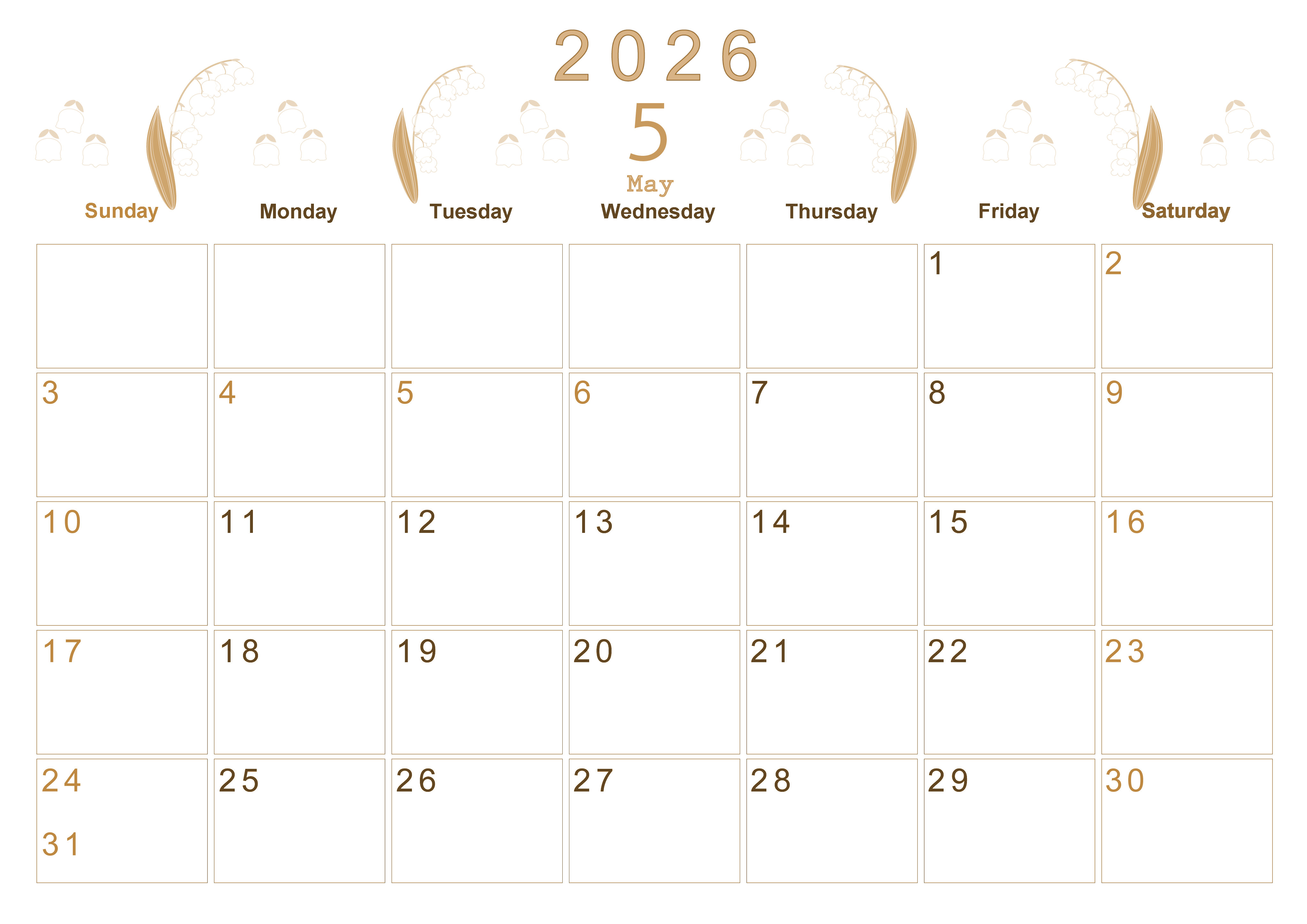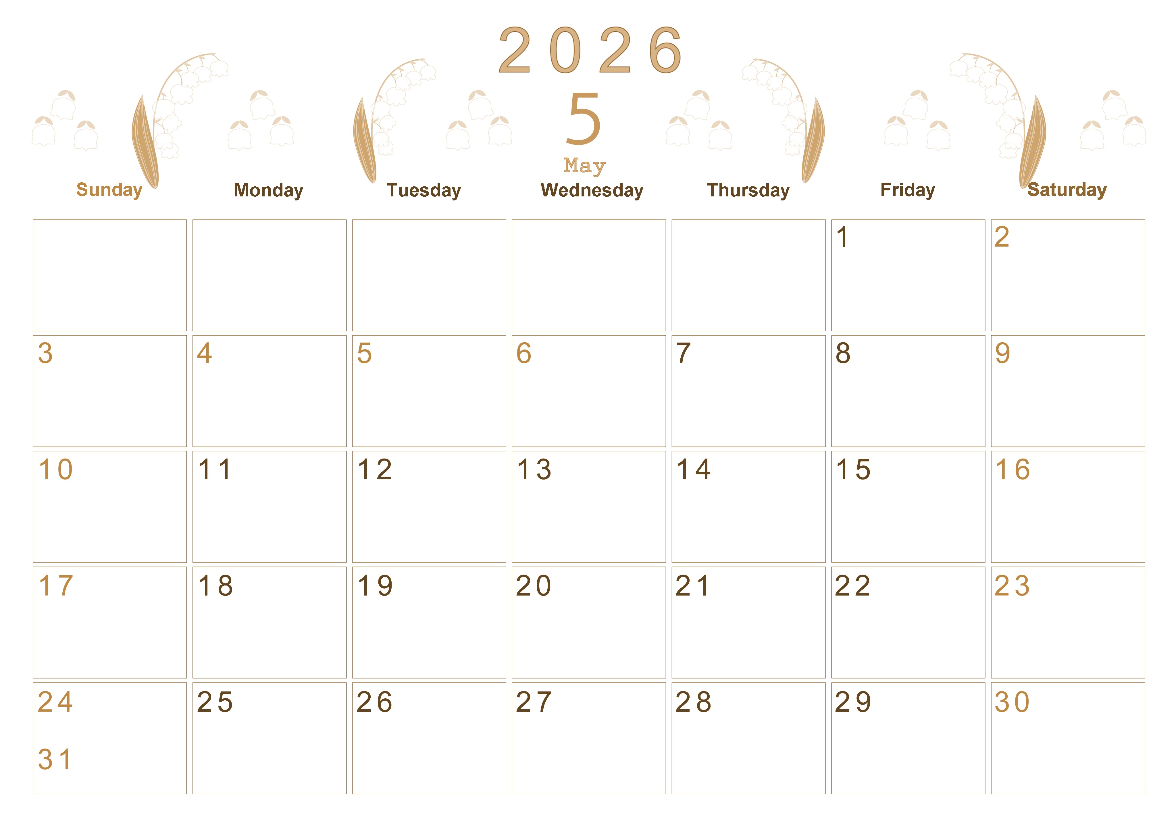 2026年5月横型レトロな日曜始まりの無料テンプレートセピア調カレンダーです。素朴でシンプルさが魅力的なすずらんのイラストが小ぶりでかわいいイラストセピア調カレンダーです。白紙に印刷する時にインクが少なくて済む経済的なデザインです。(2026-00630500)