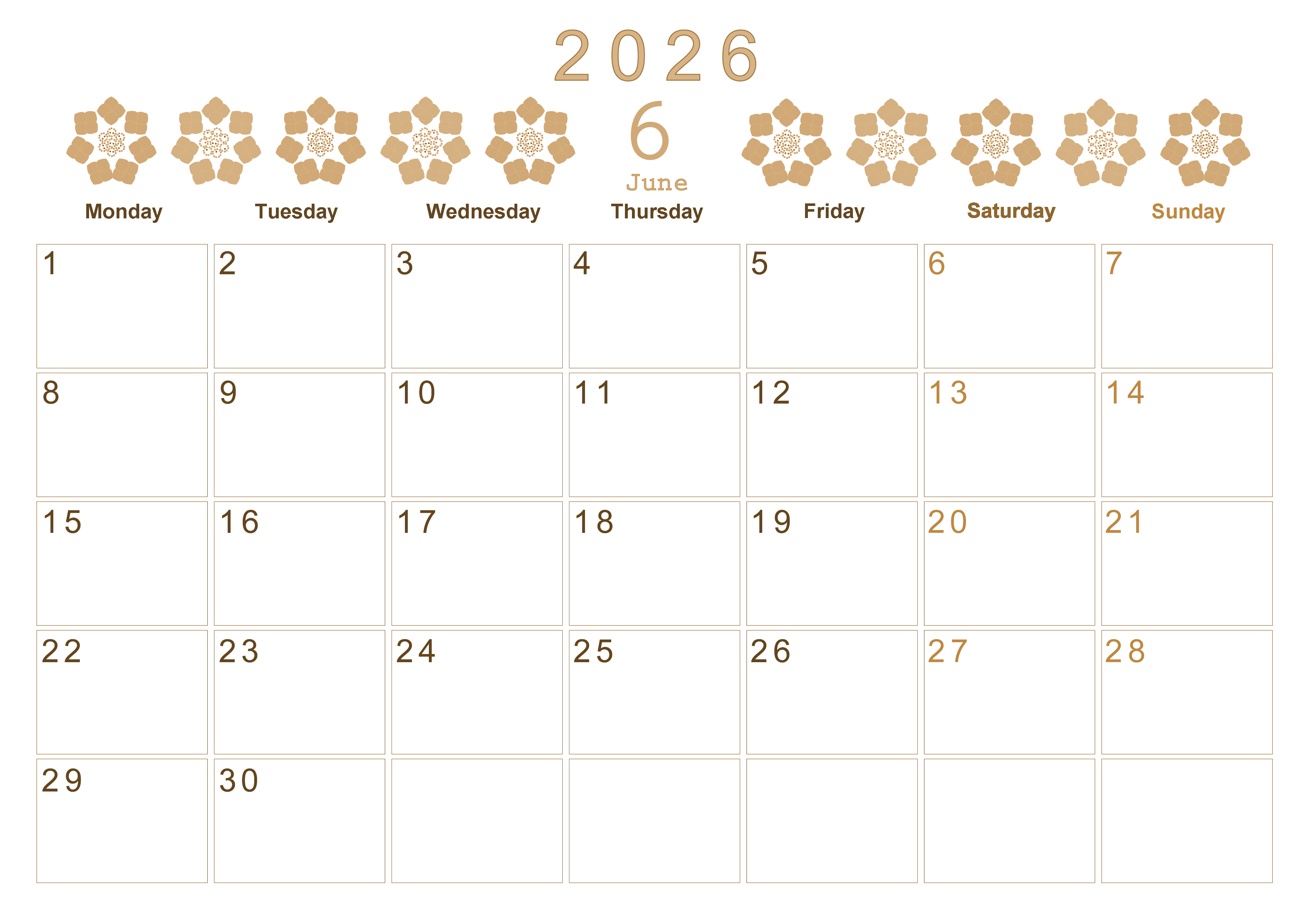 2026年6月横型レトロな月曜始まりの無料テンプレートセピア調カレンダーです。大人っぽくてかわいいあじさいのイラストが上の方についている実用性の高いフォーマットの無料セピア調カレンダーは月曜始まりです。(2026-00630601)