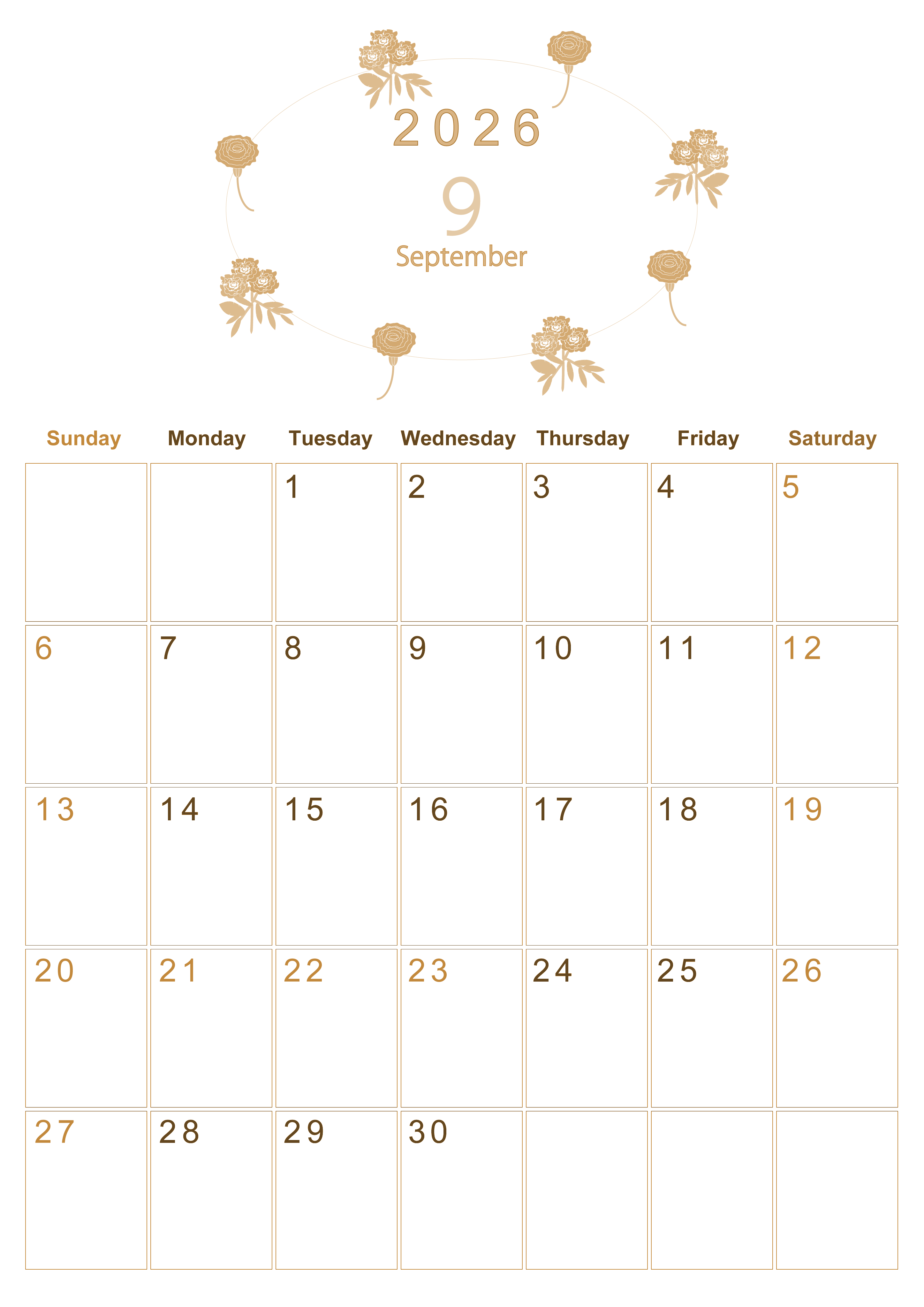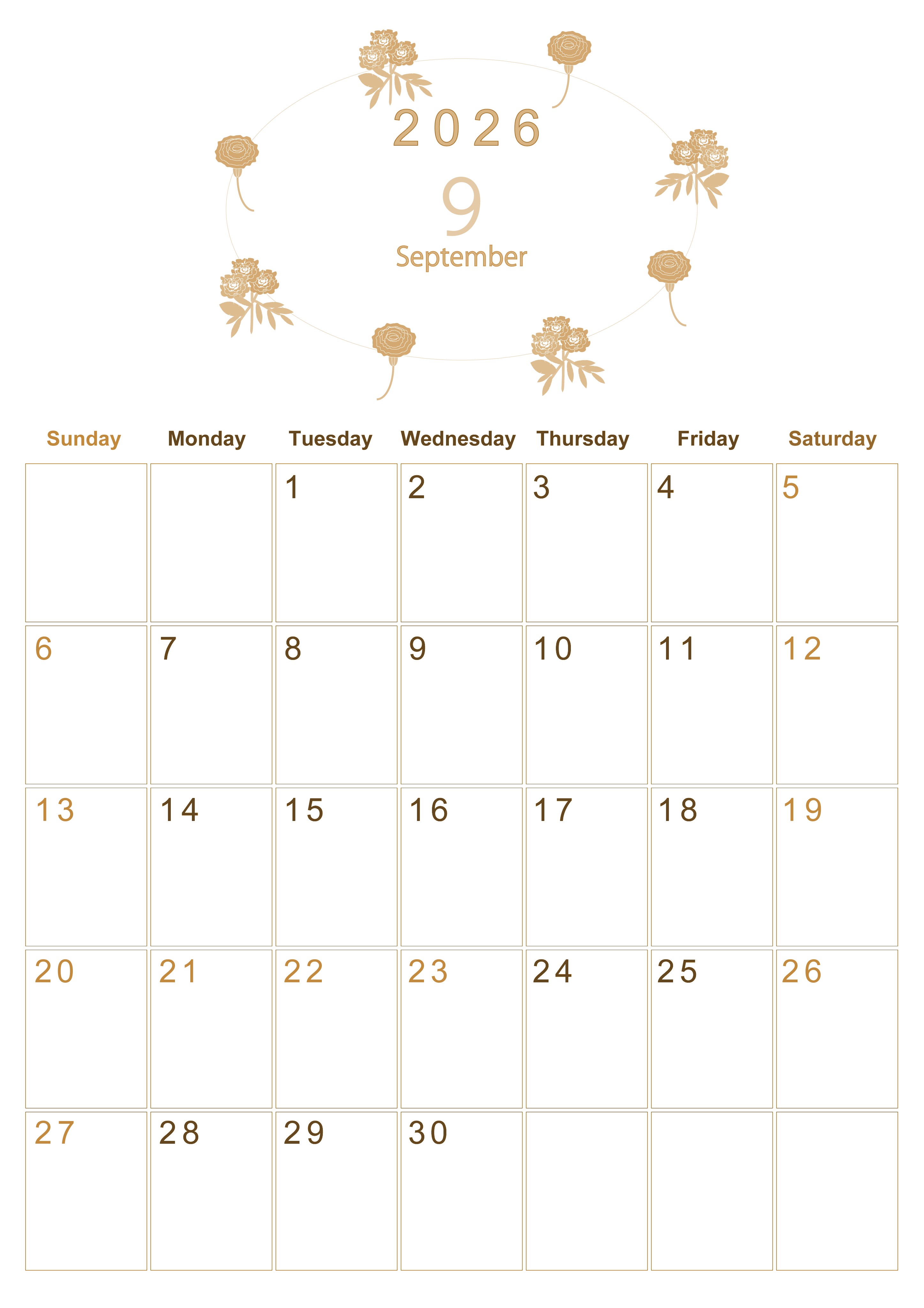 2026年9月縦型レトロな日曜始まり 花イラストのかわいいA4無料セピア調カレンダー(2026-00630910)