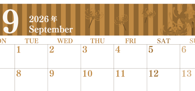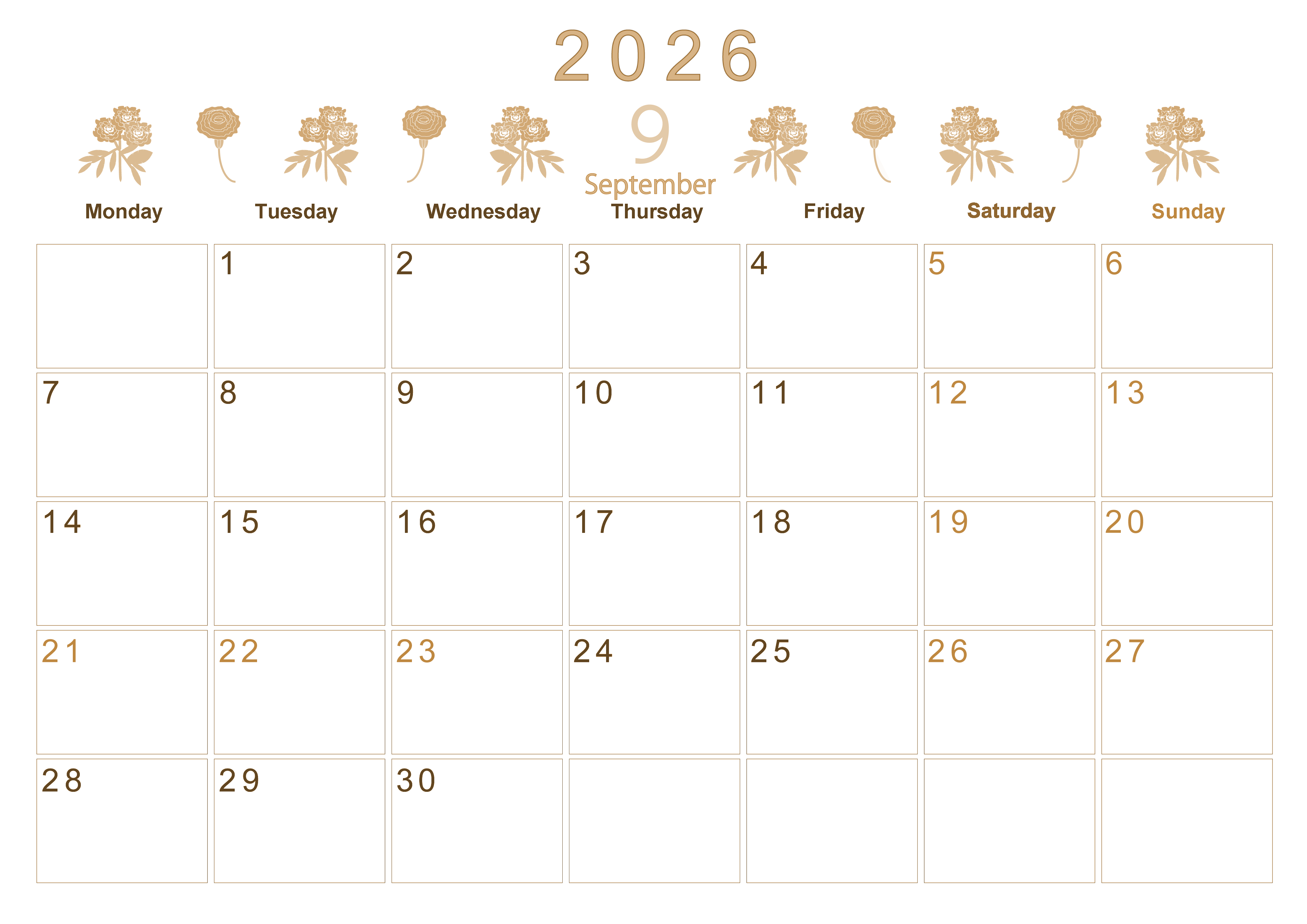 2026年9月横型レトロな月曜始まりの無料テンプレートセピア調カレンダーです。花のイラストがシンプルに小さく描かれたかわいいイラストです。かわいいのはもちろんですが月曜始まりなので実用性も高い便利な素材です。(2026-00630901)