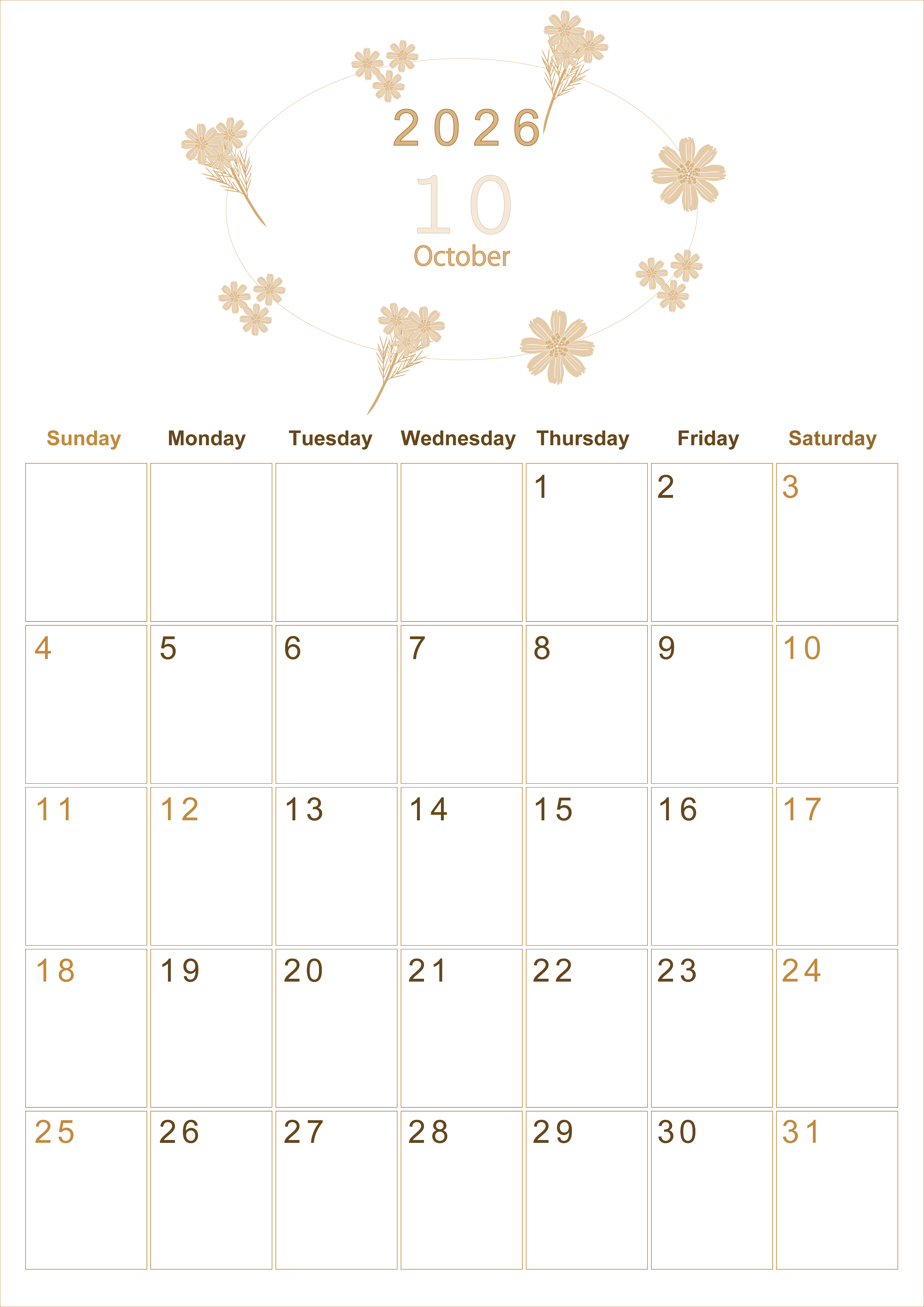 2026年10月縦型レトロな日曜始まりの無料テンプレートセピア調カレンダーです。お花好きの人に無料ダウンロードをおすすめしたいかわいいイラストセピア調カレンダーに仕上がっています。罫線も見やすいので便利です。(2026-00631010)