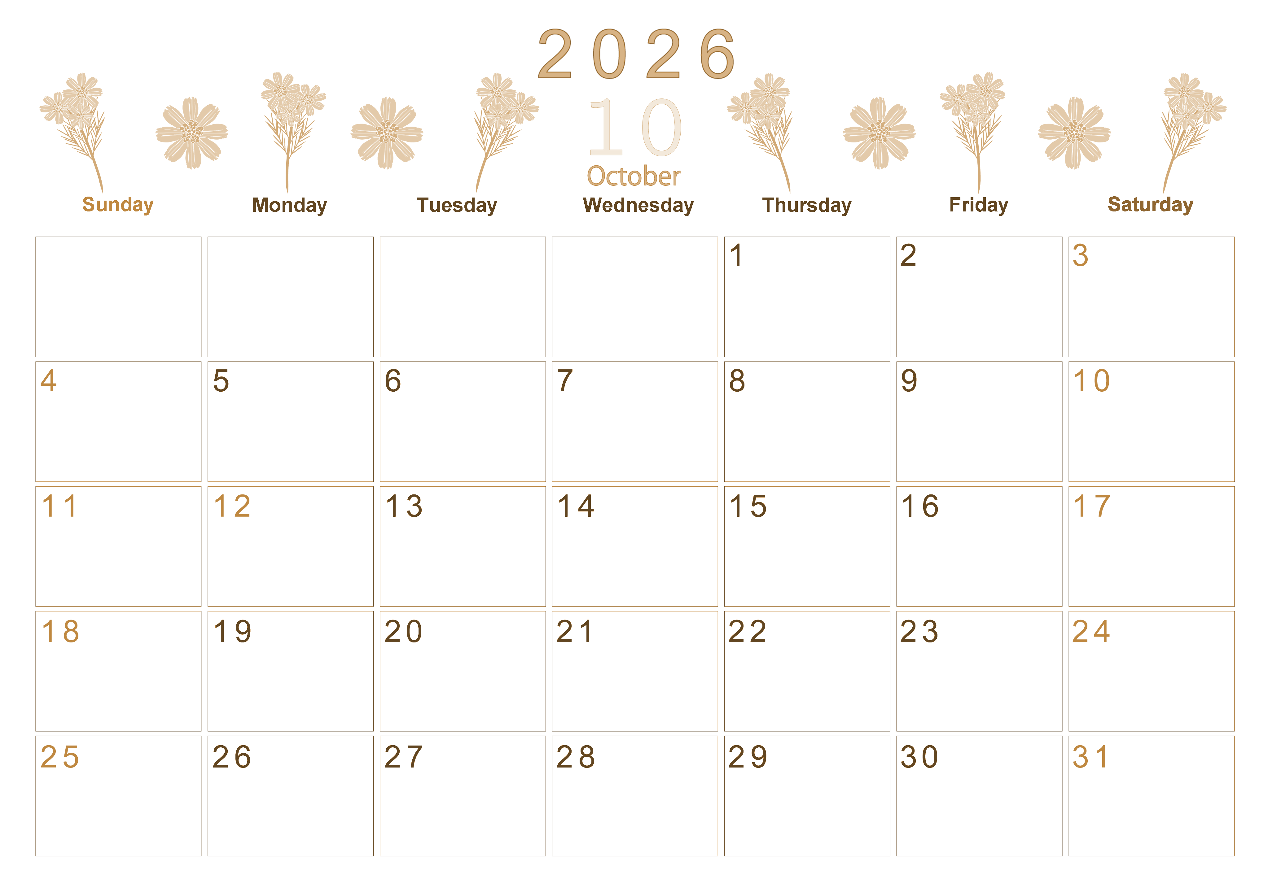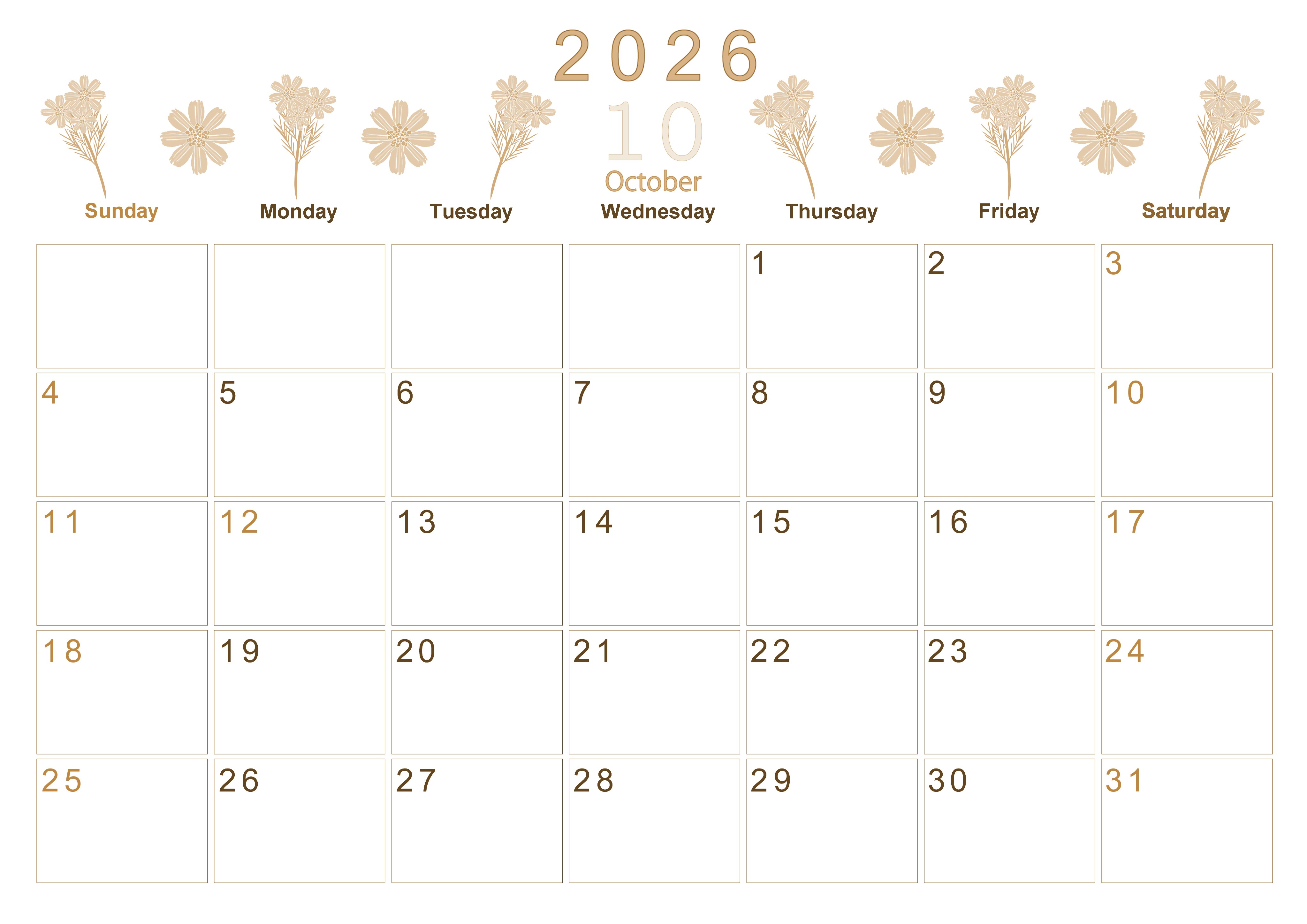 2026年10月横型レトロな日曜始まりの無料テンプレートセピア調カレンダーです。季節の花をぽつんぽつんと描く事で大人の落ち着きとかわいいを両立させたイラストに仕上がっています。使いやすさや見やすさもばっちりです。(2026-00631000)