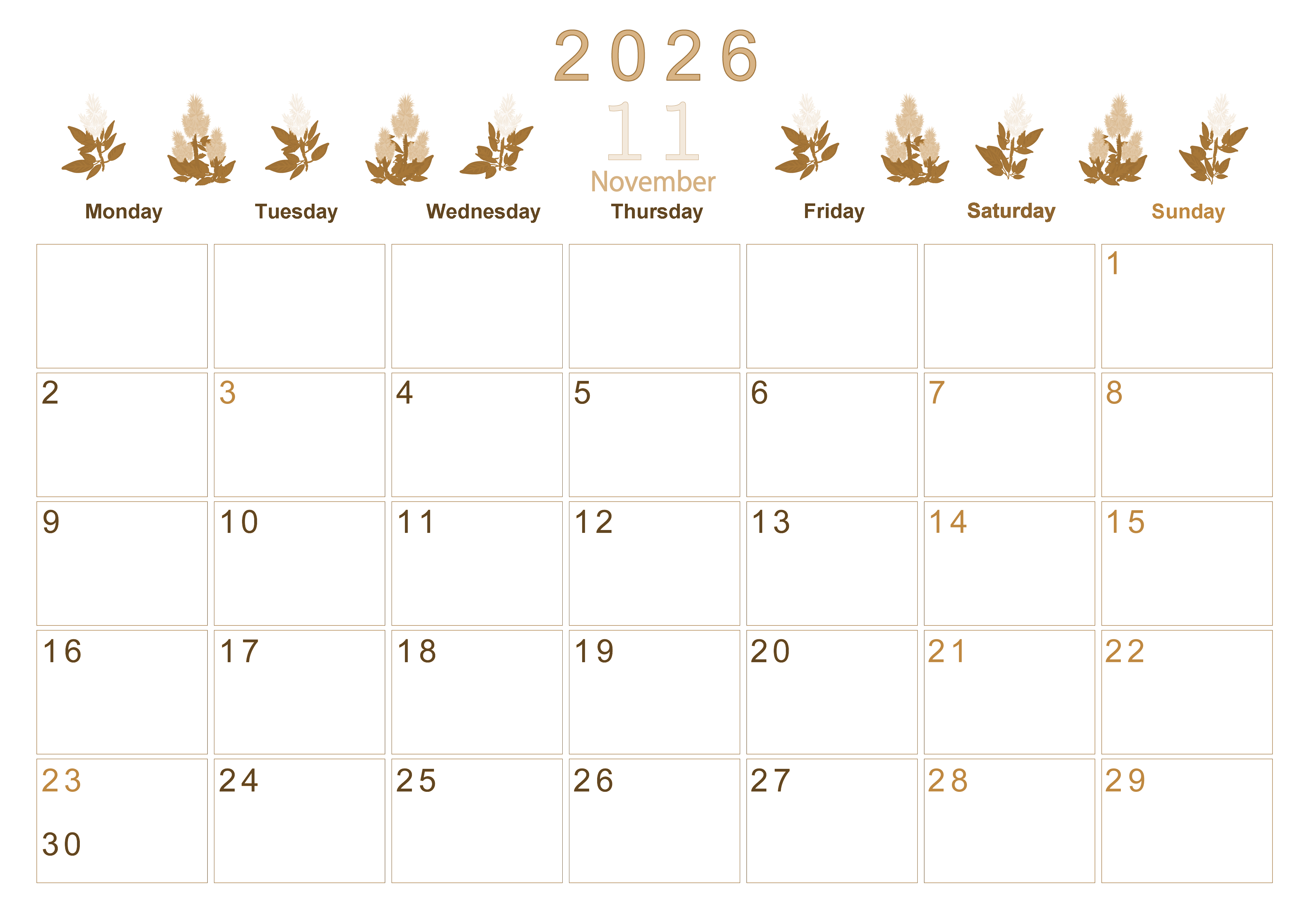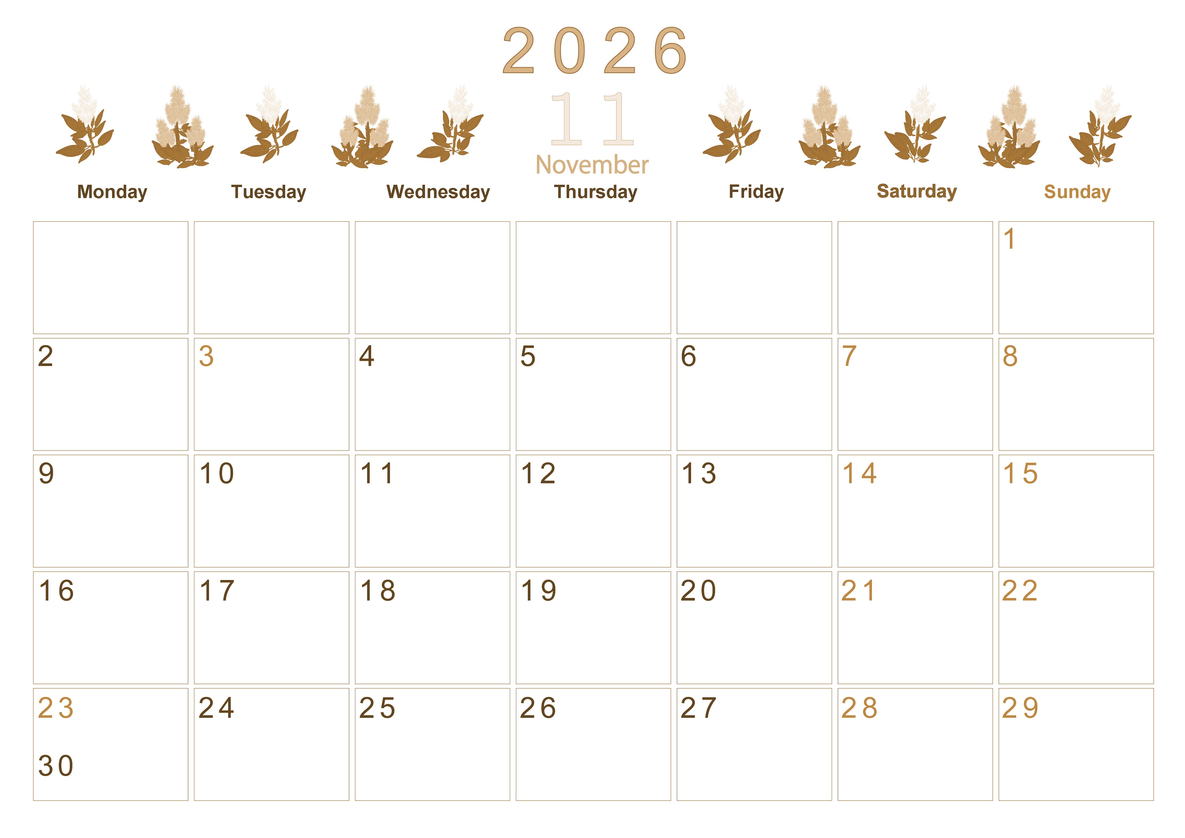 2026年11月横型レトロな月曜始まりの無料テンプレートセピア調カレンダーです。月曜始まりで曜日ごとに文字の色分けをしているので見やすいです。花のイラストもシンプルでかわいいので計画を立てるのに前向きになれます。(2026-00631101)