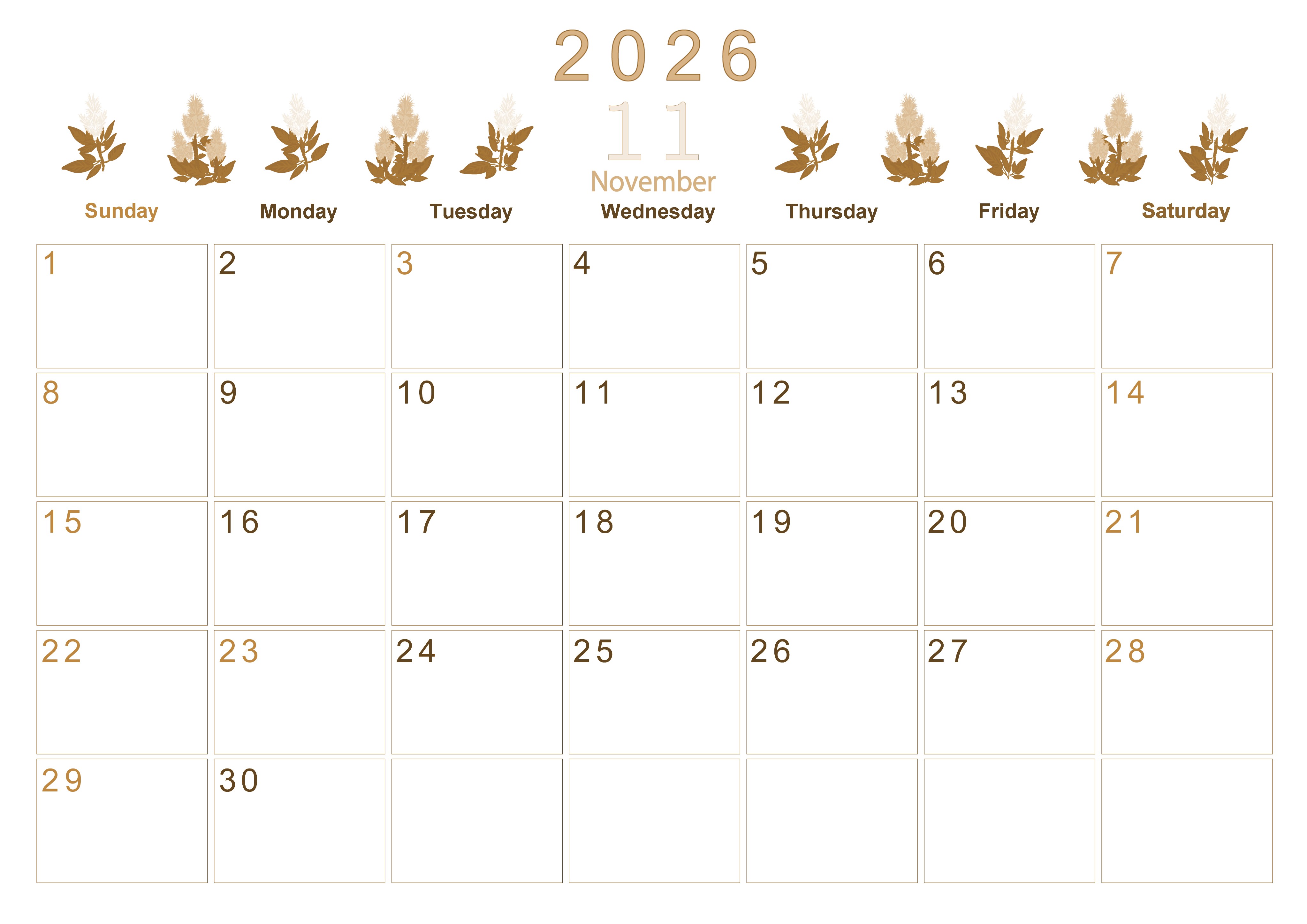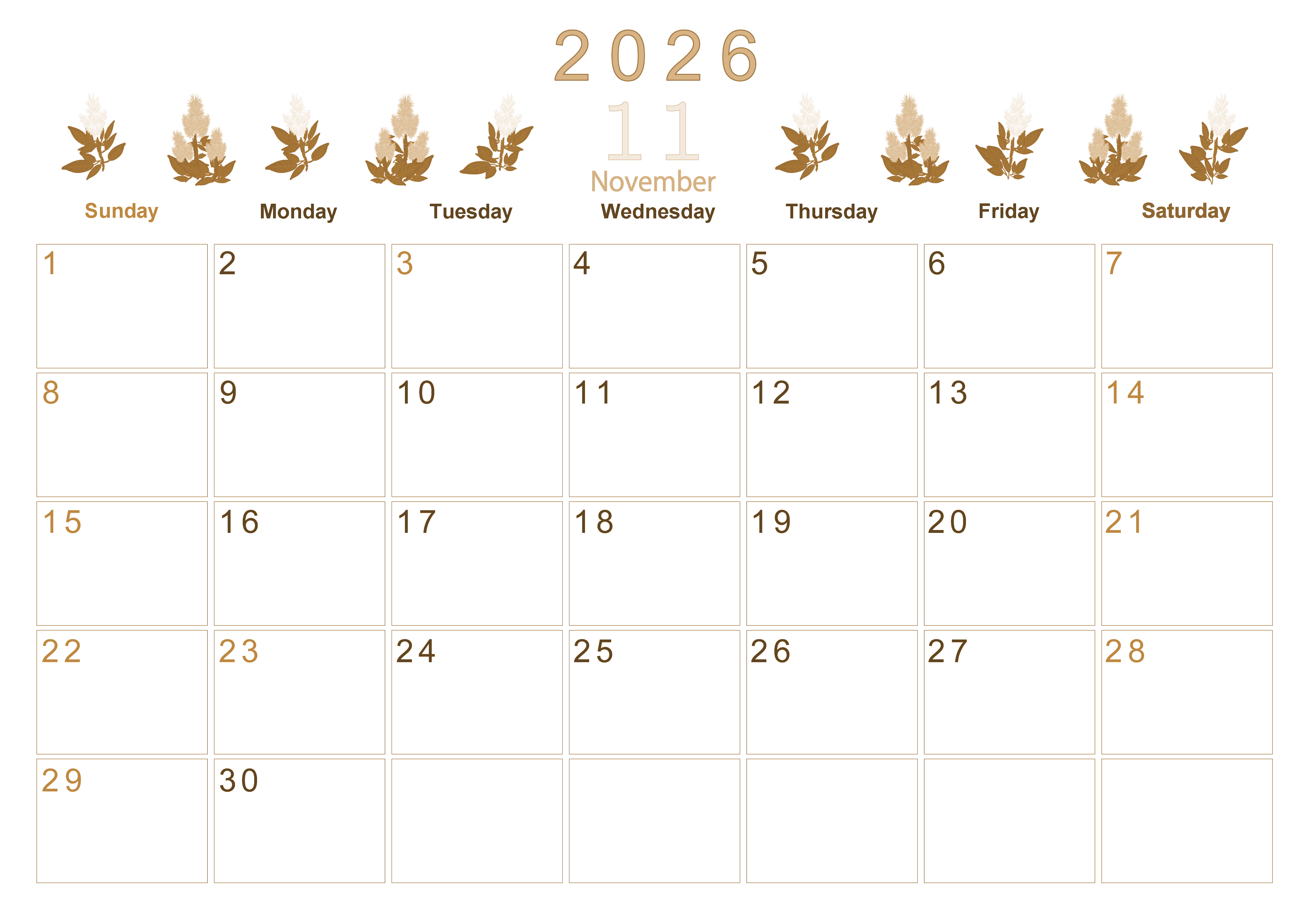 2026年11月横型レトロな日曜始まりの無料テンプレートセピア調カレンダーです。季節の花を並べて描いたデザインが素朴さとかわいさを両立している魅力的なイラストに仕上げました。無料にてダウンロードが行えます。(2026-00631100)