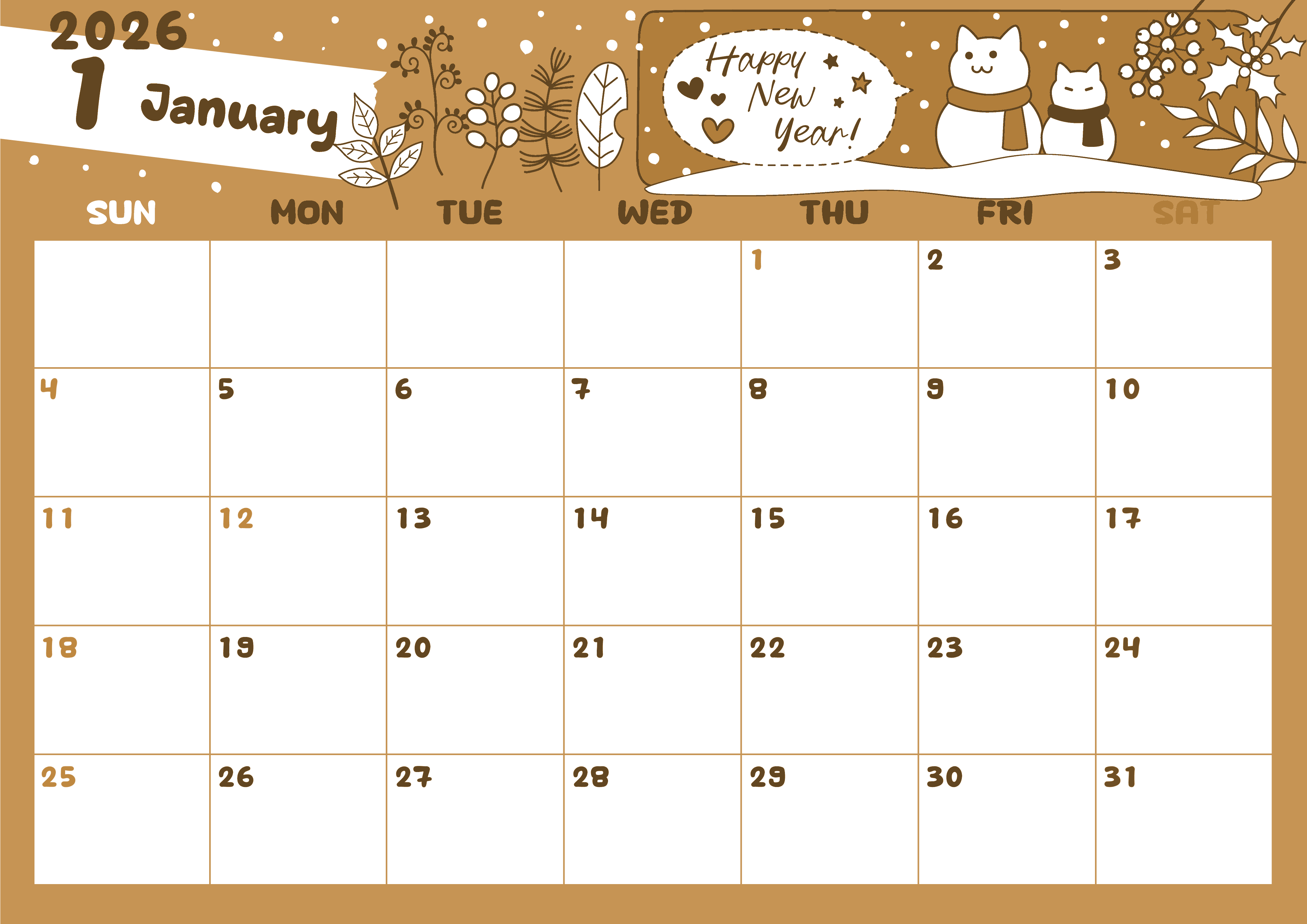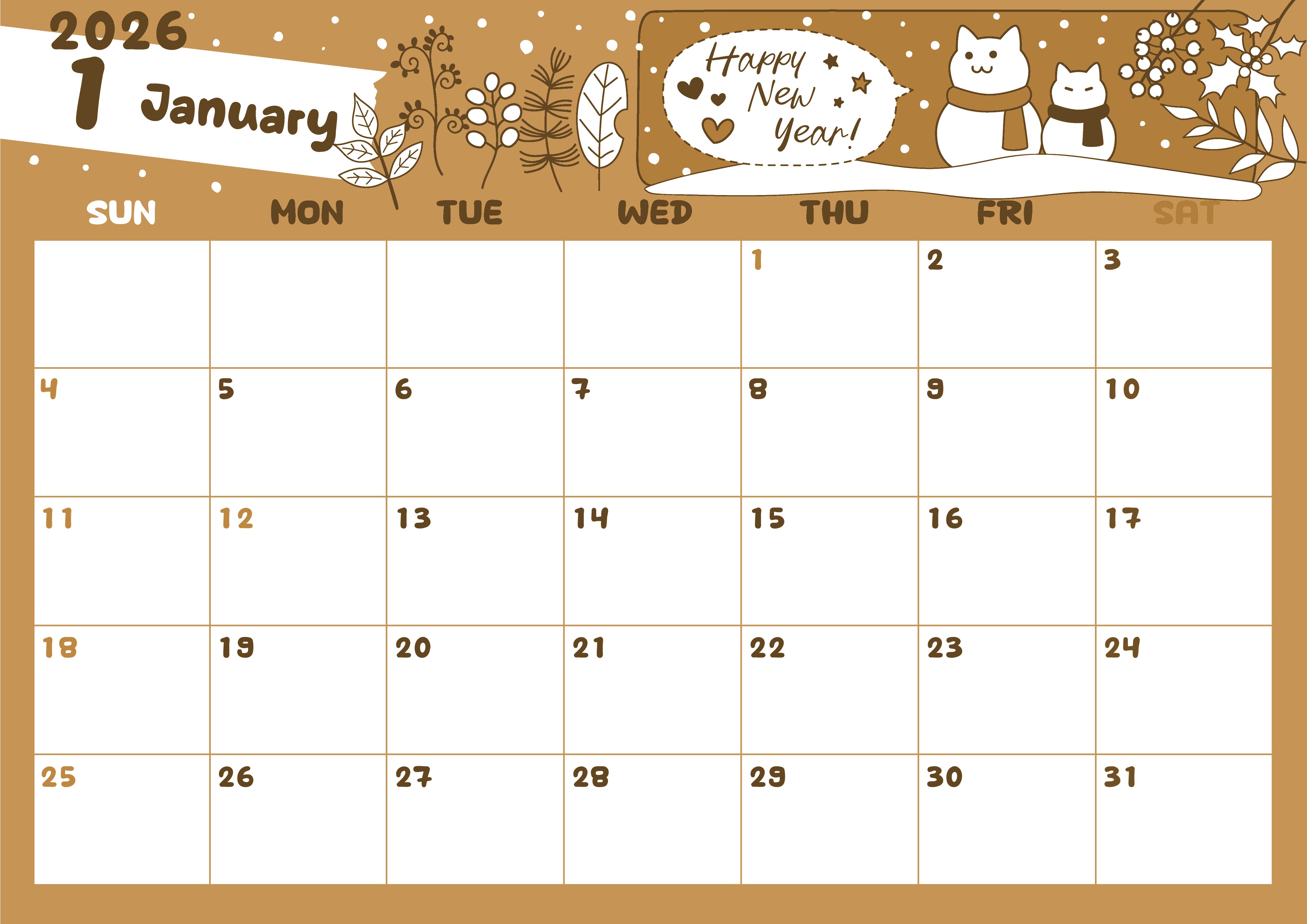 2026年1月横型レトロな日曜始まりです。ボタニカルな草花がモノトーンで描かれている一方、枠部分の背景はビビッドなイエローとコントラストがはっきりとしたかわいい背景のオリジナルセピア調カレンダーです。猫耳の雪だるまカップルがかわいいのがポイントです。(2026-00640100)