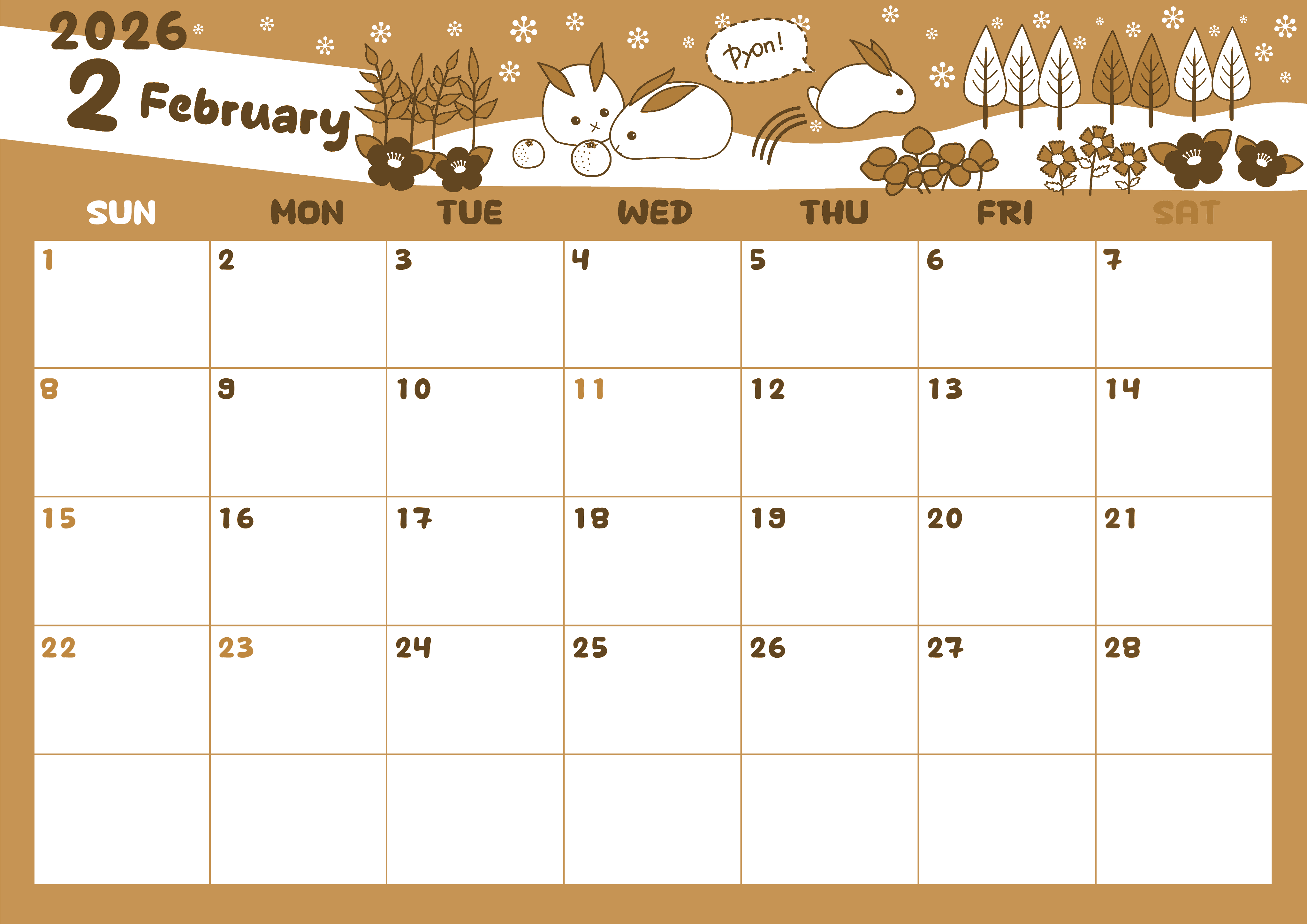 2026年2月横型レトロな日曜始まりの無料テンプレートセピア調カレンダーです。ポップで遊び心が詰まったかわいい元気を貰えるようなセピア調カレンダーです。ウサギや森のイラストを眺めているだけでも面白いフリー素材です。(2026-00640200)