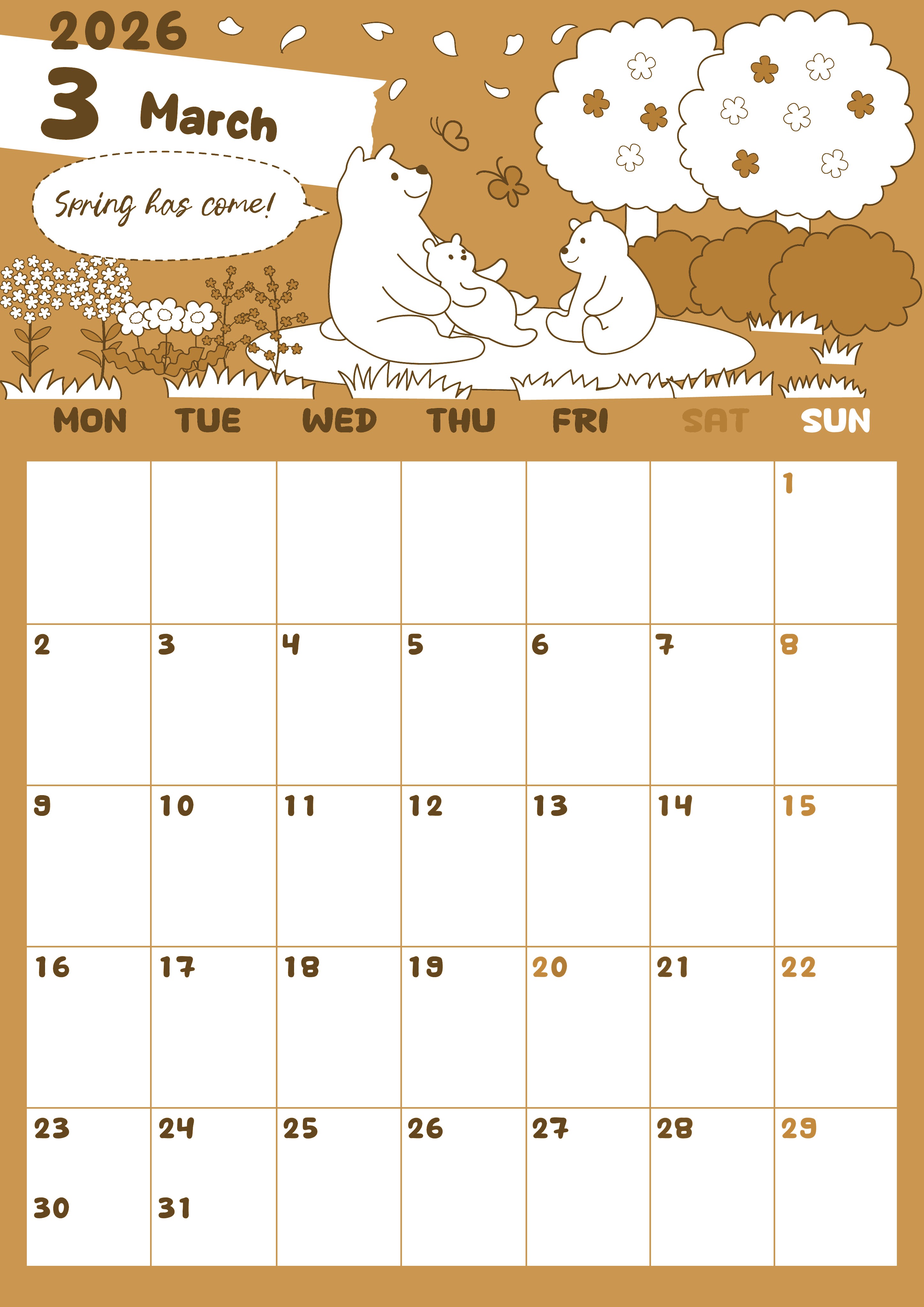 2026年3月縦型レトロな月曜始まりの無料テンプレートセピア調カレンダーです。月曜始まりなので行事の把握をするのにぴったりなイラストセピア調カレンダーです。白熊のポップなイラストもかわいいので使っていてワクワクします。(2026-00640311)