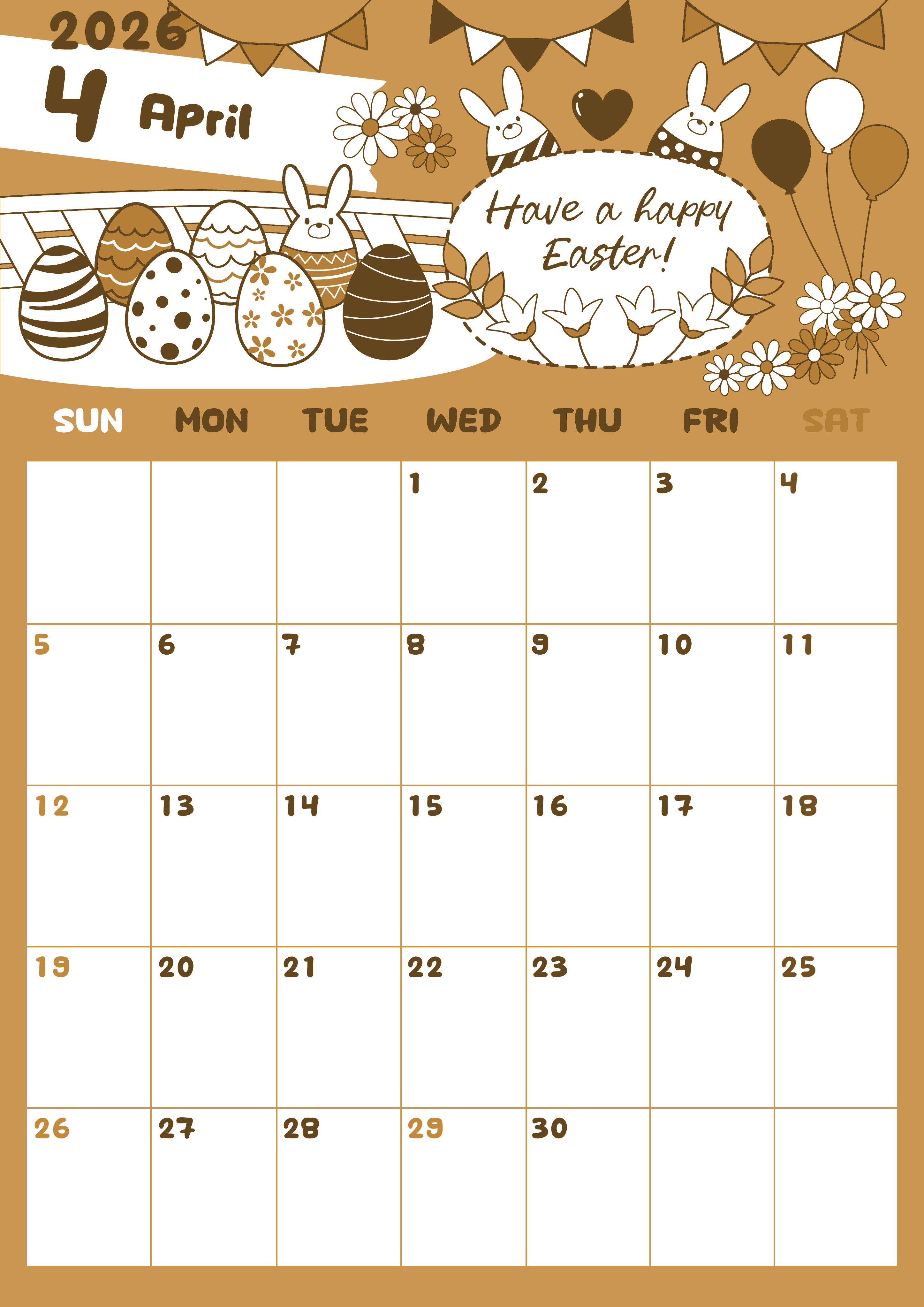 2026年4月縦型レトロな日曜始まりの無料テンプレートセピア調カレンダーです。ポップなうさぎとイースターエッグの組み合わせがかわいいセピア調カレンダーです。イラストだけでなく予定を書き込む部分も見やすいようなフォーマットとなっています。(2026-00640410)