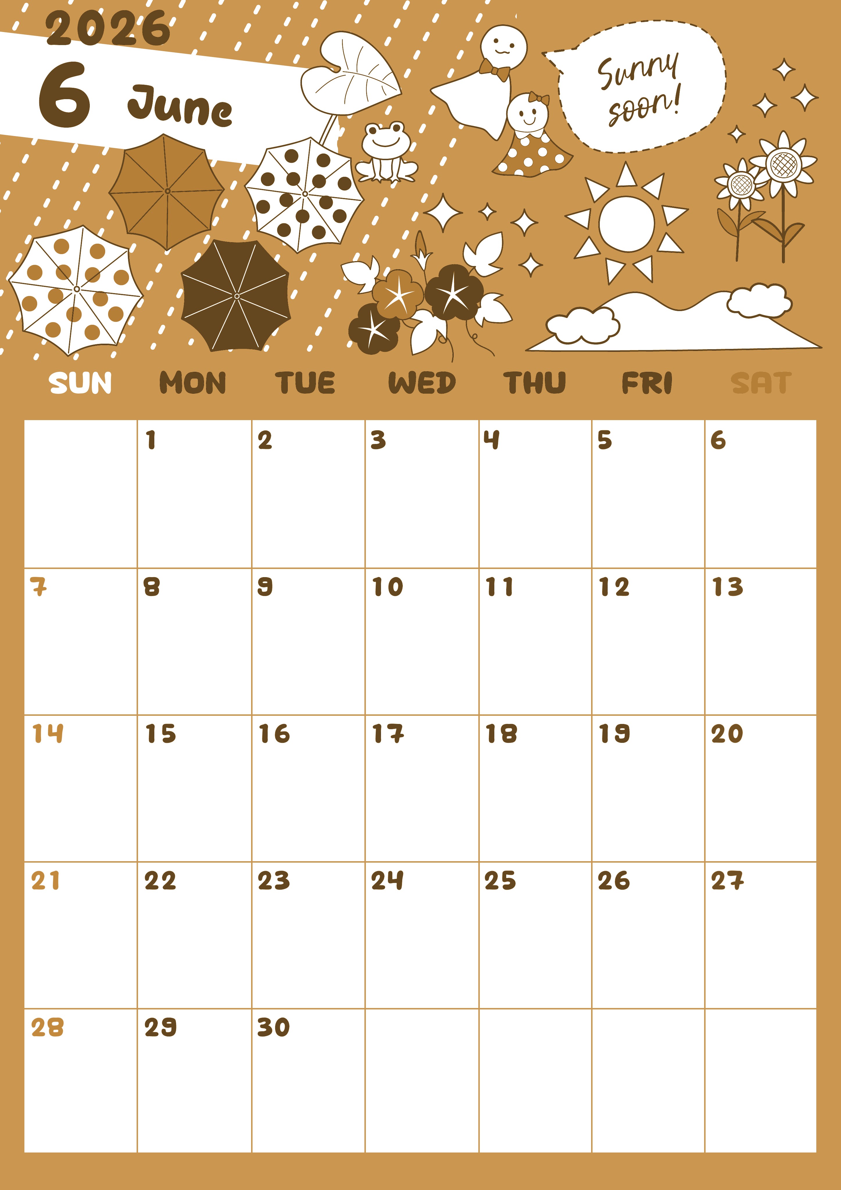 2026年6月縦型レトロな日曜始まりの無料テンプレートセピア調カレンダーです。オリジナルイラストが季節物をテーマにしていてポップかわいいユーモアさもあるセピア調カレンダーです。字が大きいので便利で見やすいです。(2026-00640610)