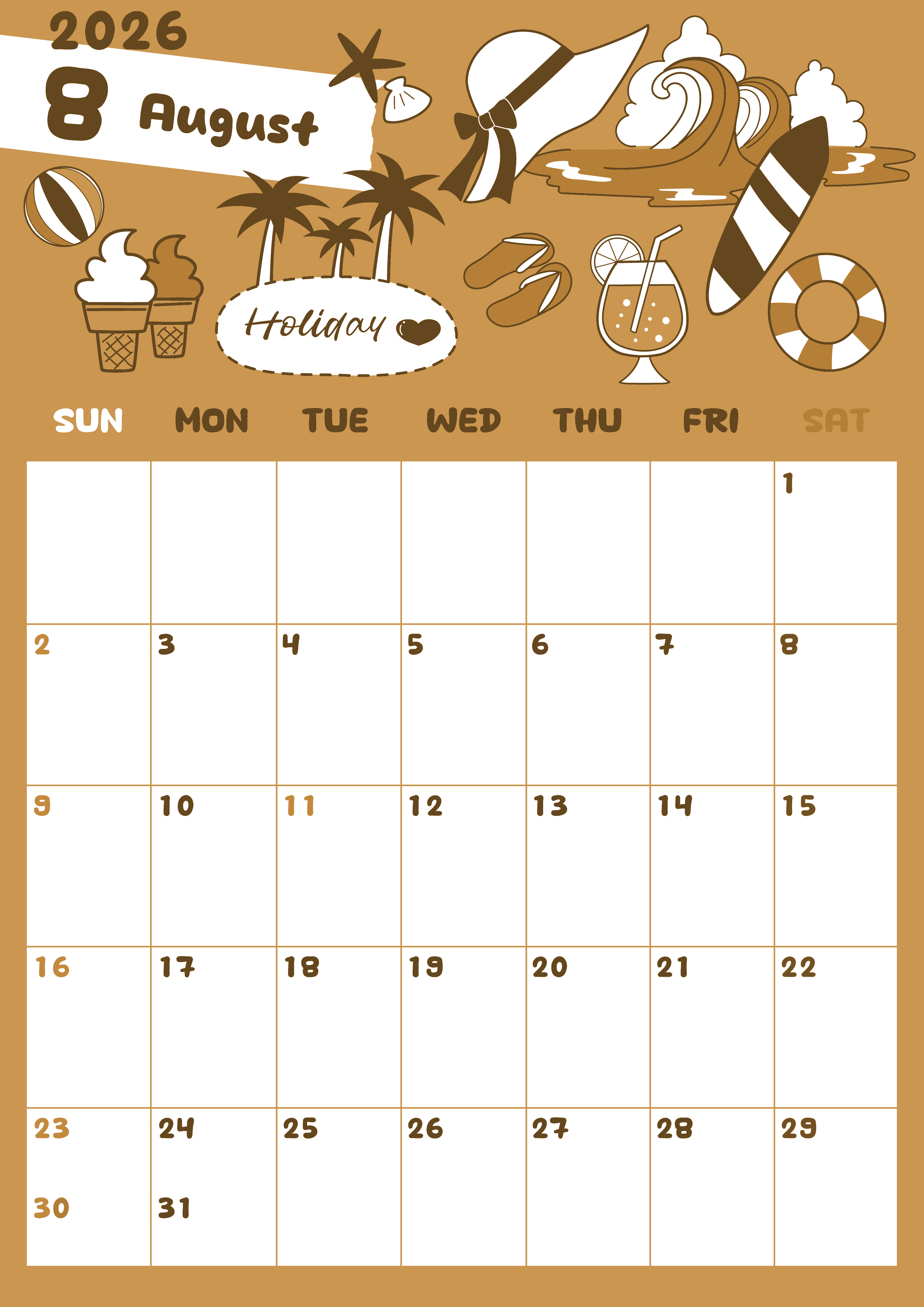 2026年・無料のカレンダーテンプレート 2026年8月縦型レトロな日曜始まり 海岸イラストのかわいいA4無料セピア調カレンダー(2026-00640810) 素材状デザイン王 2025年4月2日 2026年8月縦型レトロな日曜始まりの無料テンプレートセピア調カレンダーです。夏休みの海岸のバケーション感を表現したイラストがポップでかわいいセピア調カレンダーです。元気が出そうです。(2026-00640810) 8月 縦型のカレンダー 日曜始まり セピア カレンダーデザイン-0064