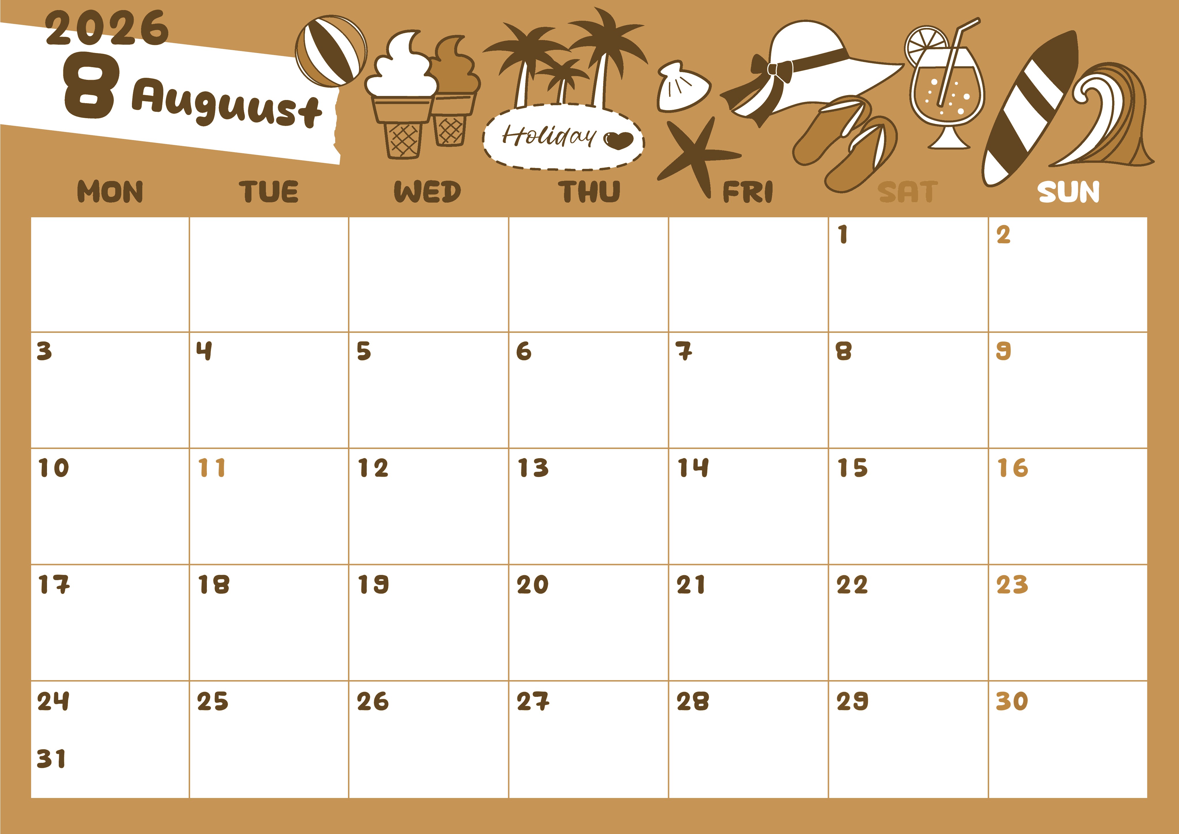 2026年8月横型レトロな月曜始まり 海岸イラストのかわいいA4無料セピア調カレンダー(2026-00640801)