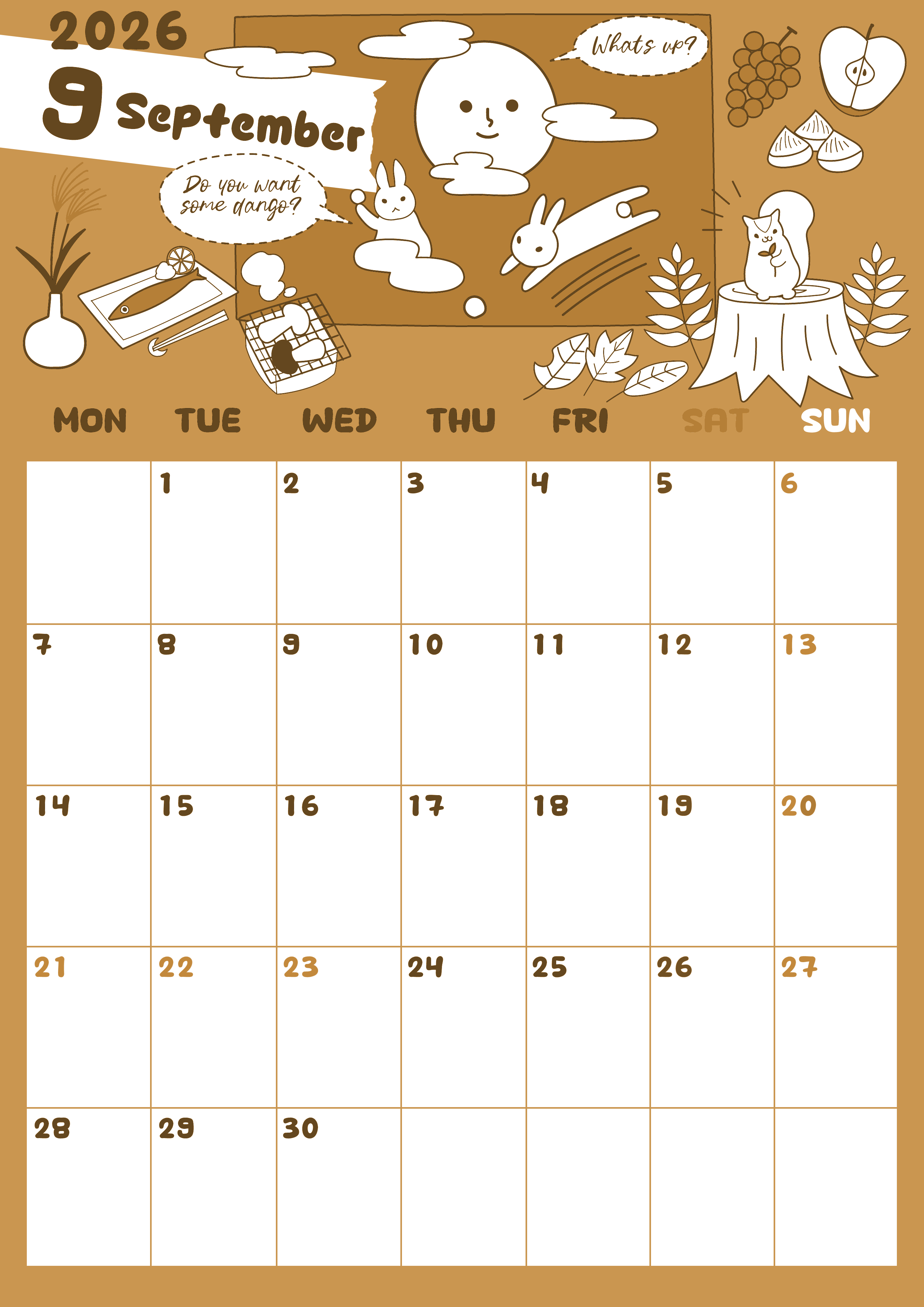 2026年9月縦型レトロな月曜始まりの無料テンプレートセピア調カレンダーです。森の動物たちが食欲の秋や十五夜をエンジョイしているとても充実した毎日を連想させてくれるかわいいイラストセピア調カレンダーです。(2026-00640911)