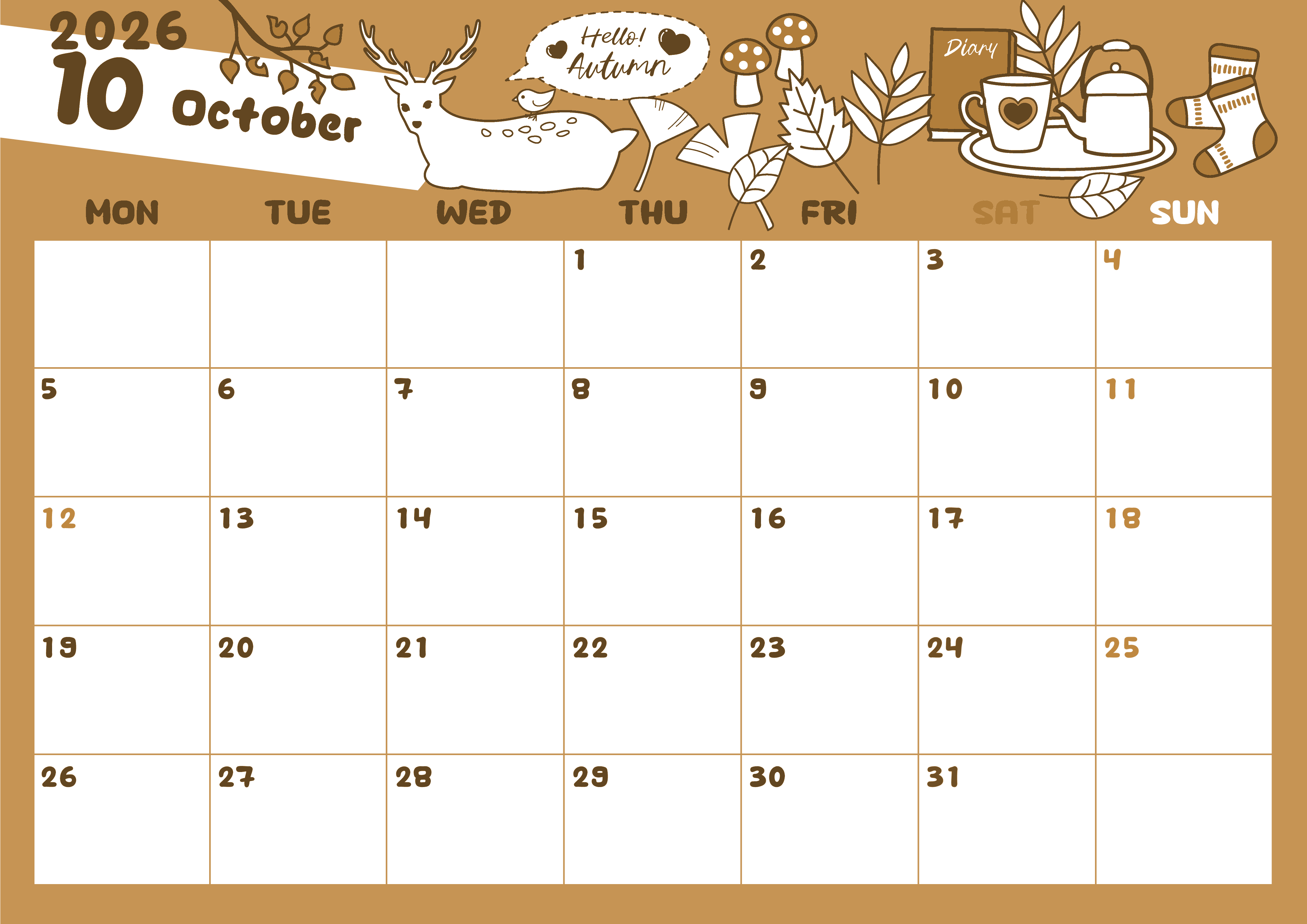 2026年10月横型レトロな月曜始まりの無料テンプレートセピア調カレンダーです。1匹の鹿がのっそりと座ってこっちを見ている様子のイラストがかわいいです。金運アップも期待できるセピア調カレンダーです。(2026-00641001)