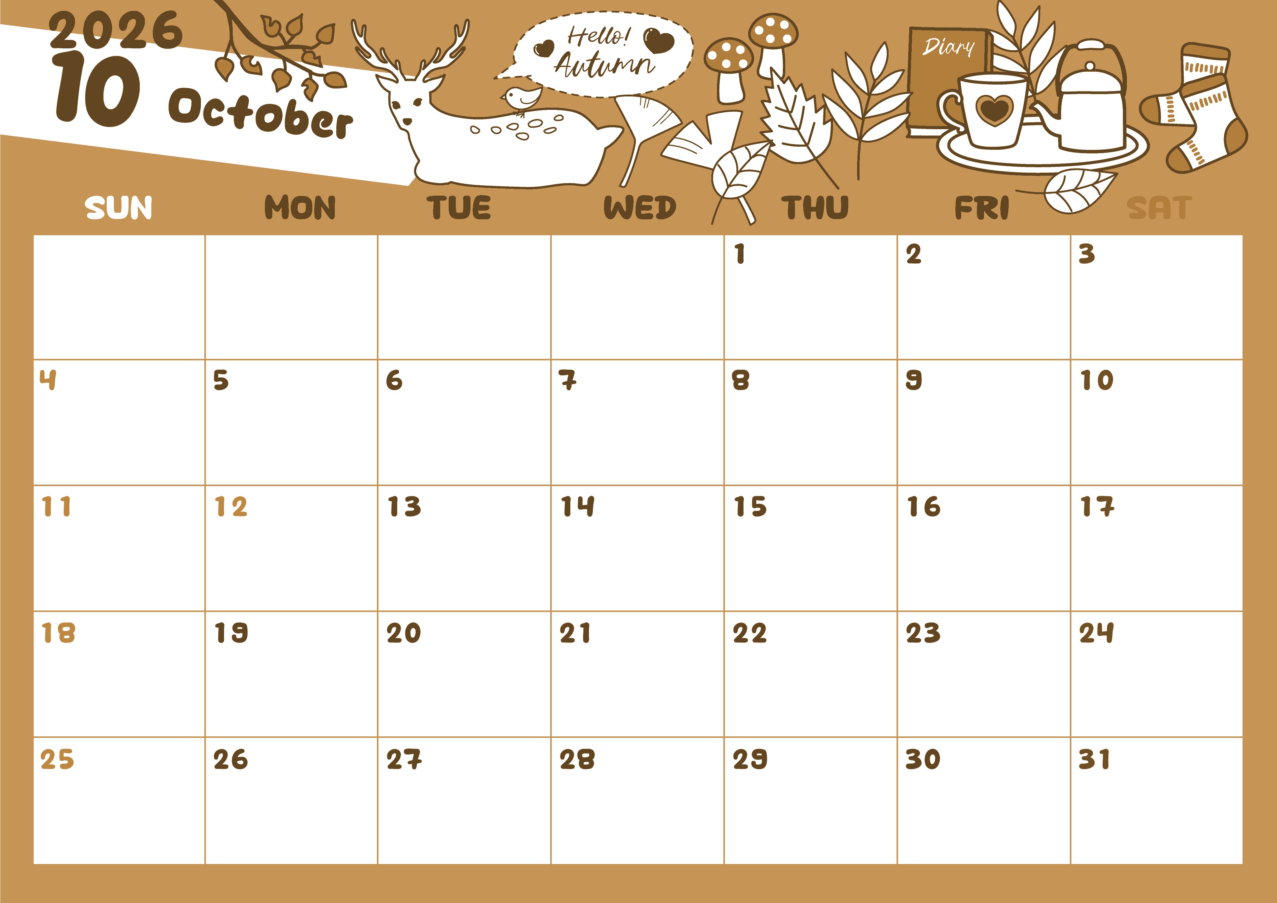 2026年10月横型レトロな日曜始まりの無料テンプレートセピア調カレンダーです。立派な角を持つ鹿がのんびりと秋の風情を感じながらくつろいでいる様子をコミカルに北欧テイストで描いたかわいいイラストです。(2026-00641000)