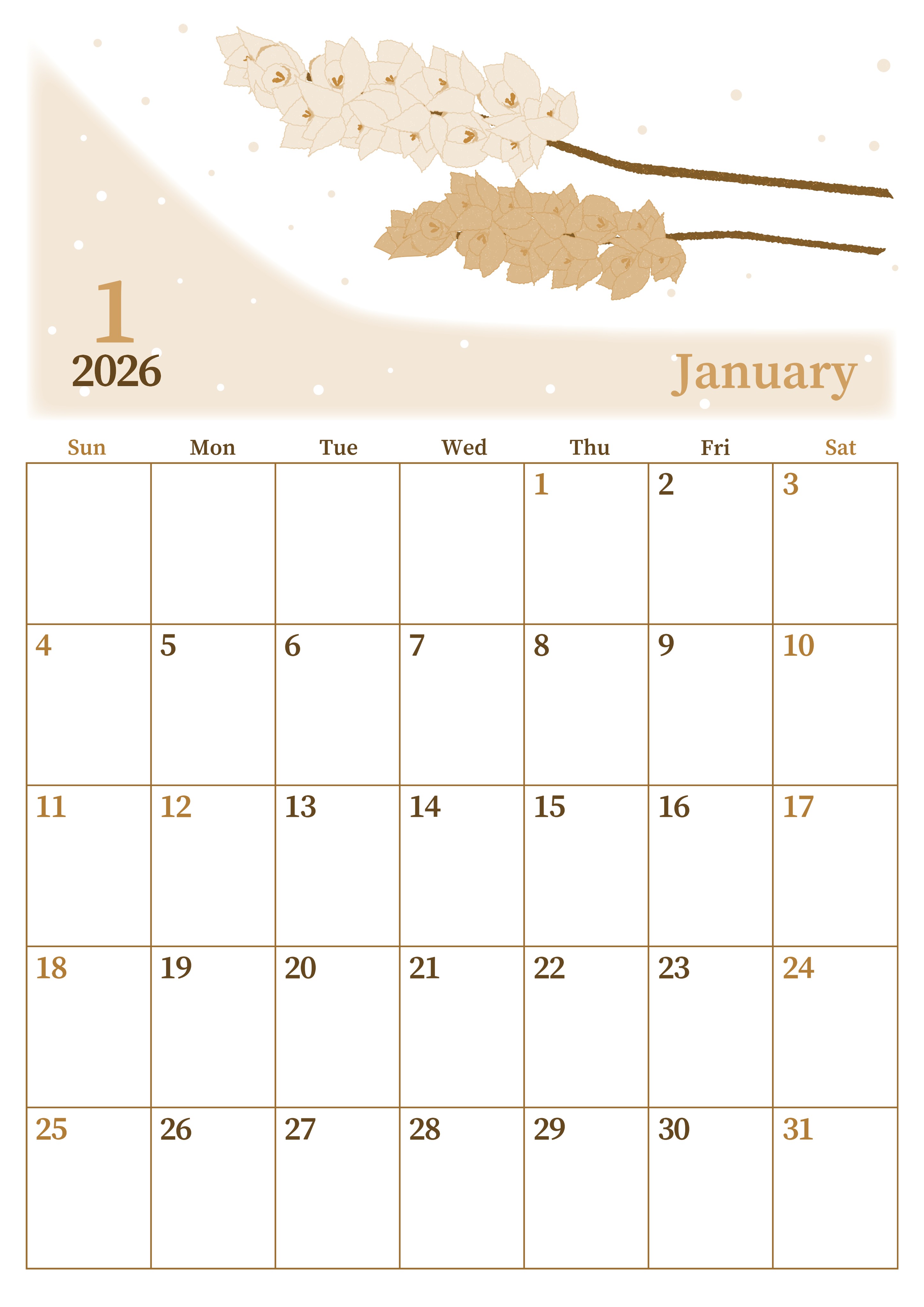 2026年1月縦型レトロな日曜始まりセピア調カレンダーです。花に癒されるという方におすすめしたいセピア調カレンダーです。ガーリーでありながらもシックでおしゃれなオリジナルイラストです。罫線もくっきりと引かれているので便利です。(2026-00650110)