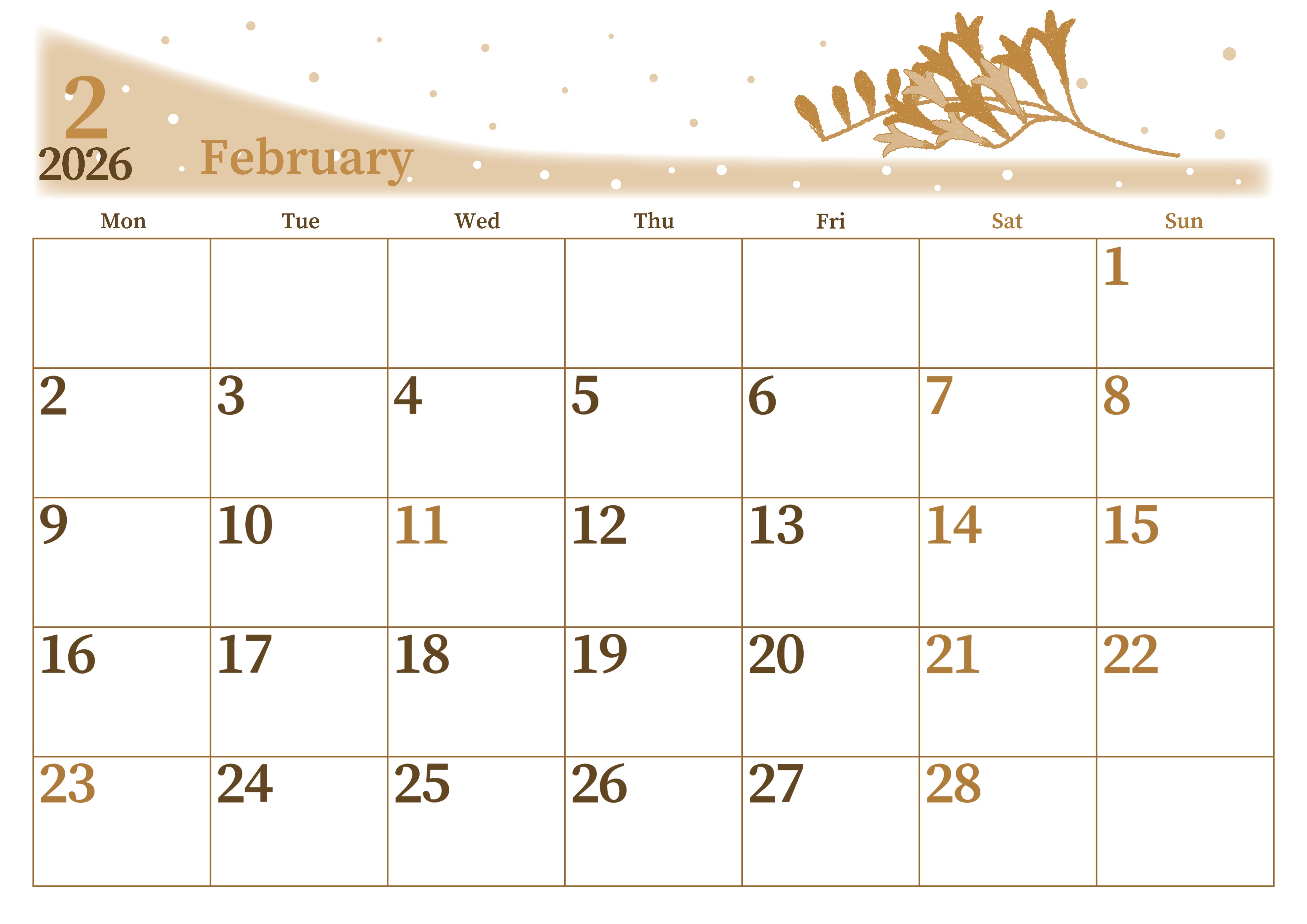 2026年2月横型レトロな月曜始まりの無料テンプレートセピア調カレンダーです。月曜始まりで勉強のモチベーションを上げるためにスケジュールをしっかり組みたいという学生さんにとてもおすすめできるおしゃれなセピア調カレンダーです。(2026-00650201)