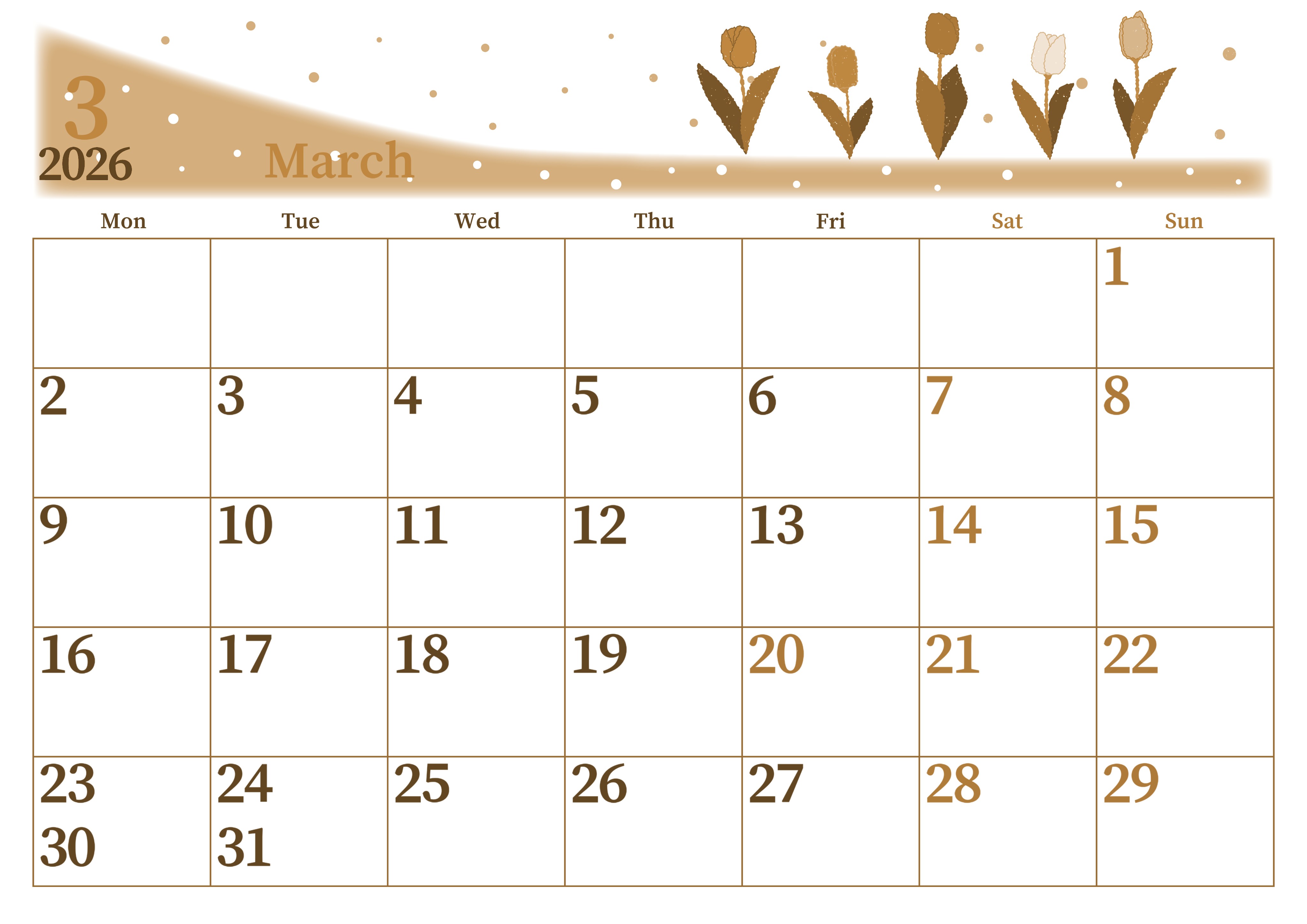 2026年3月横型レトロな月曜始まりの無料テンプレートセピア調カレンダーです。鮮やかなチューリップが生き生きと割いている様子が大人おしゃれなイラストセピア調カレンダーです。月曜始まりでA4サイズ用紙に印刷するだけなので汎用的です。(2026-00650301)