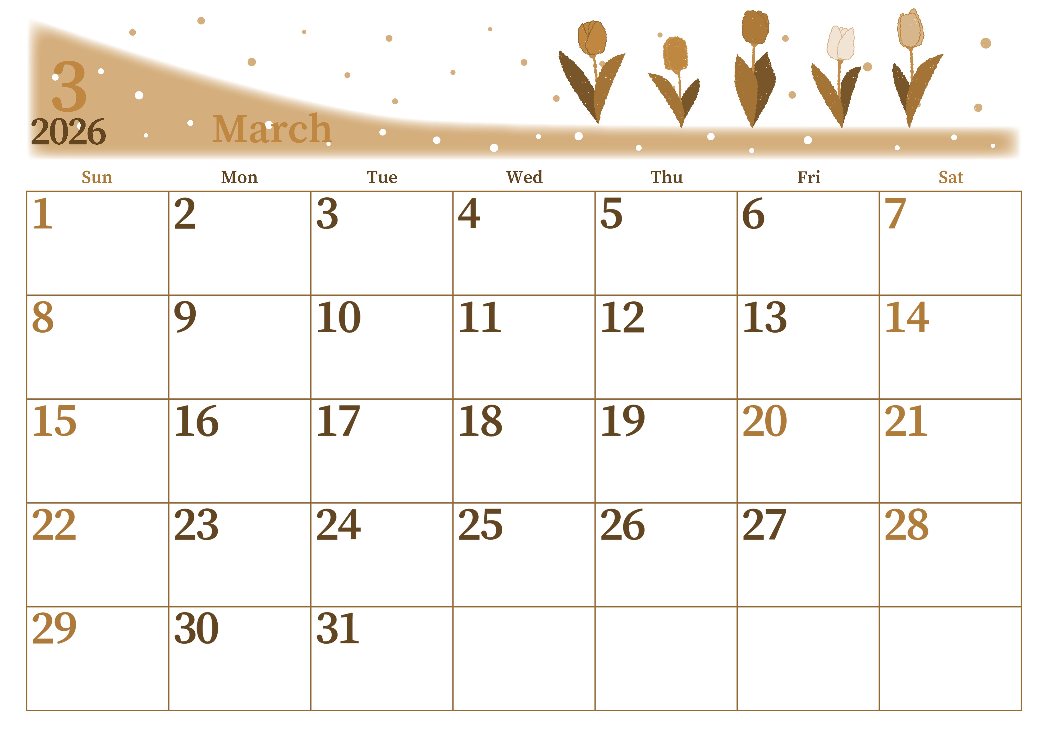 2026年3月横型レトロな日曜始まりの無料テンプレートセピア調カレンダーです。チューリップが並んでいるおしゃれで季節感の溢れるセピア調カレンダーです。レイアウトは1日1日を広めに確保しているので使いやすい素材です。(2026-00650300)