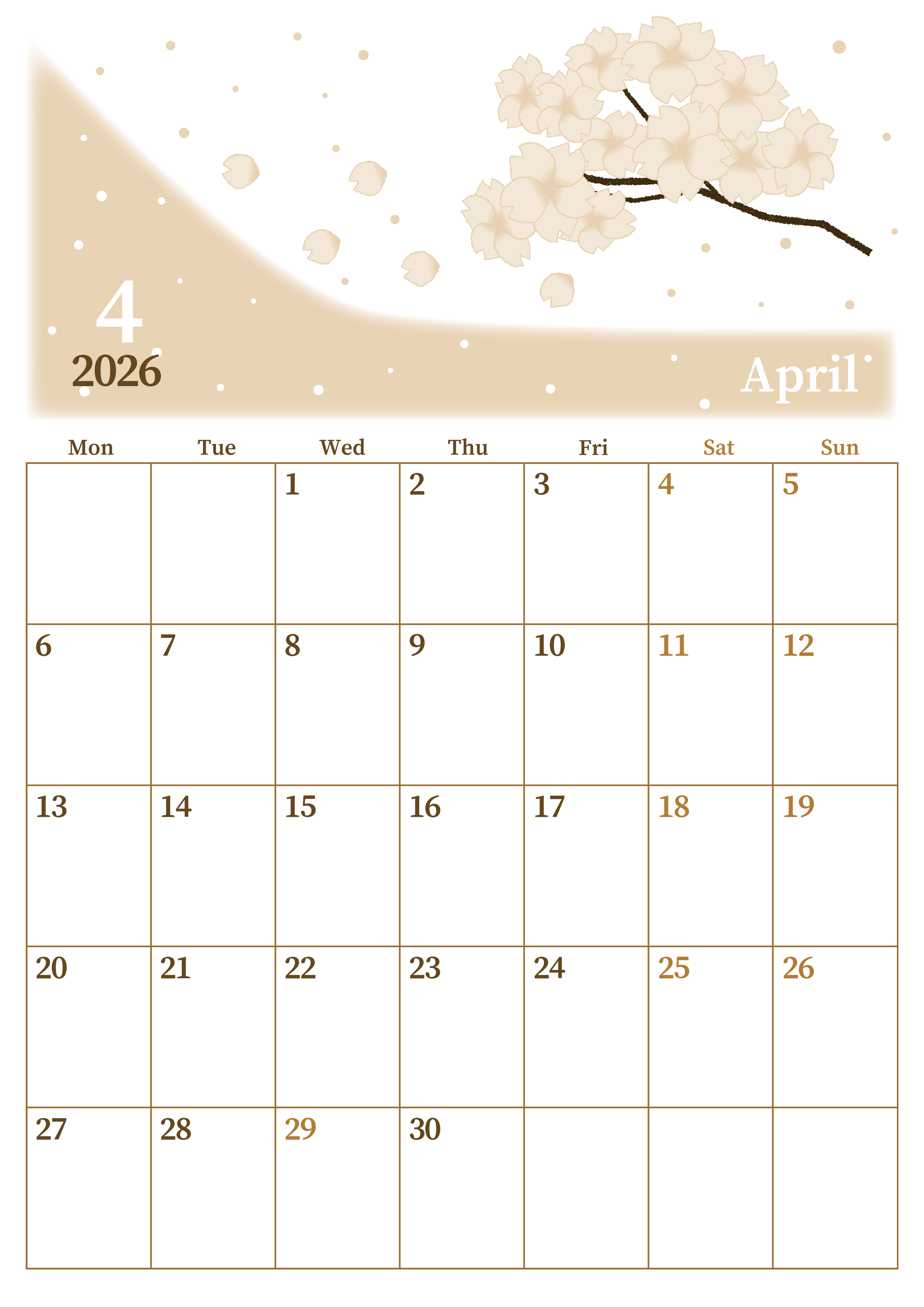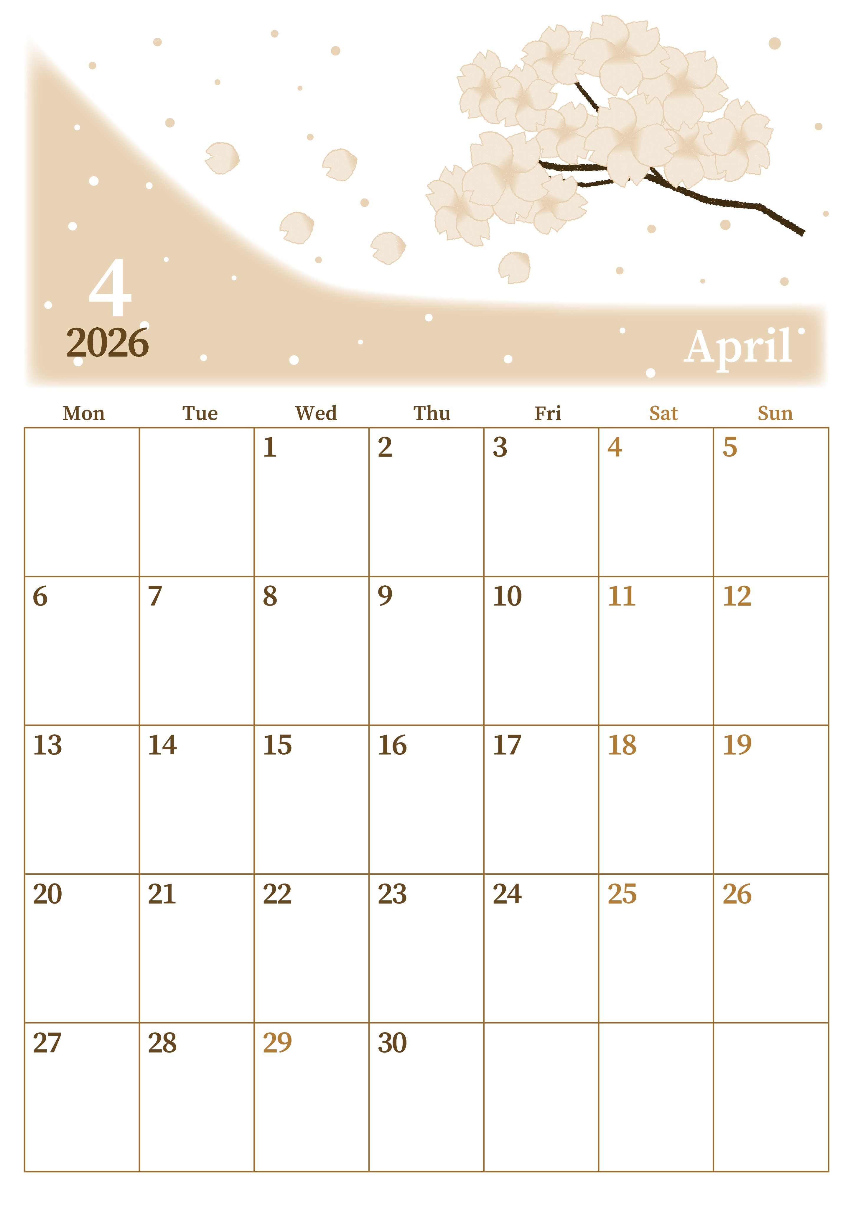 2026年4月縦型レトロな月曜始まりの無料テンプレートセピア調カレンダーです。月曜始まりのセピア調カレンダーなのでスケジュールを見やすいです。イラストは春の切なさと儚さを思わせる雰囲気とかわいいテイストの両方が入り混じっています。(2026-00650411)
