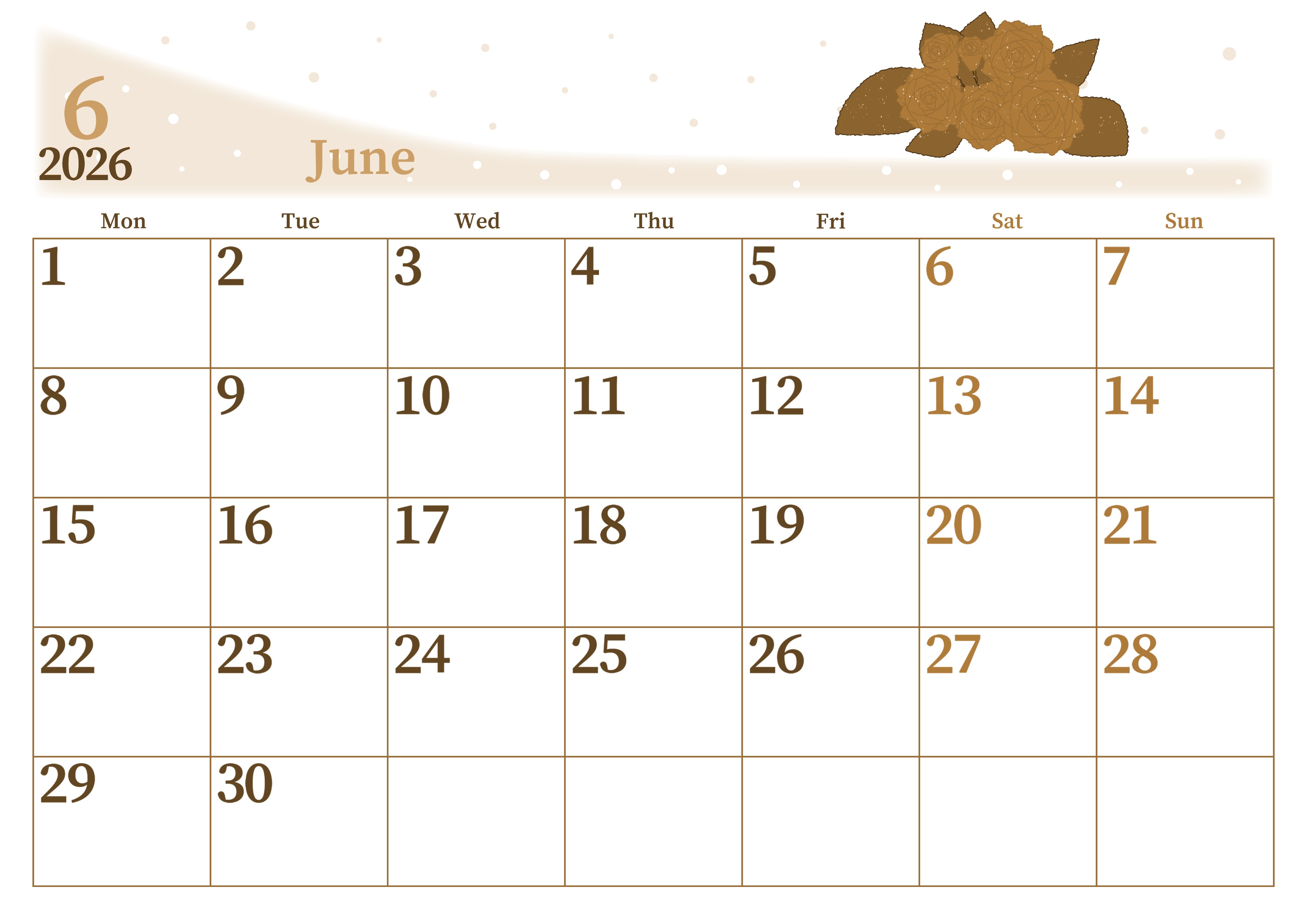 2026年6月横型レトロな月曜始まりの無料テンプレートセピア調カレンダーです。月曜始まりで勉強や仕事の計画を立てやすいセピア調カレンダーです。薔薇がセクシーでおしゃれで大人びたデザインのイラストです。(2026-00650601)