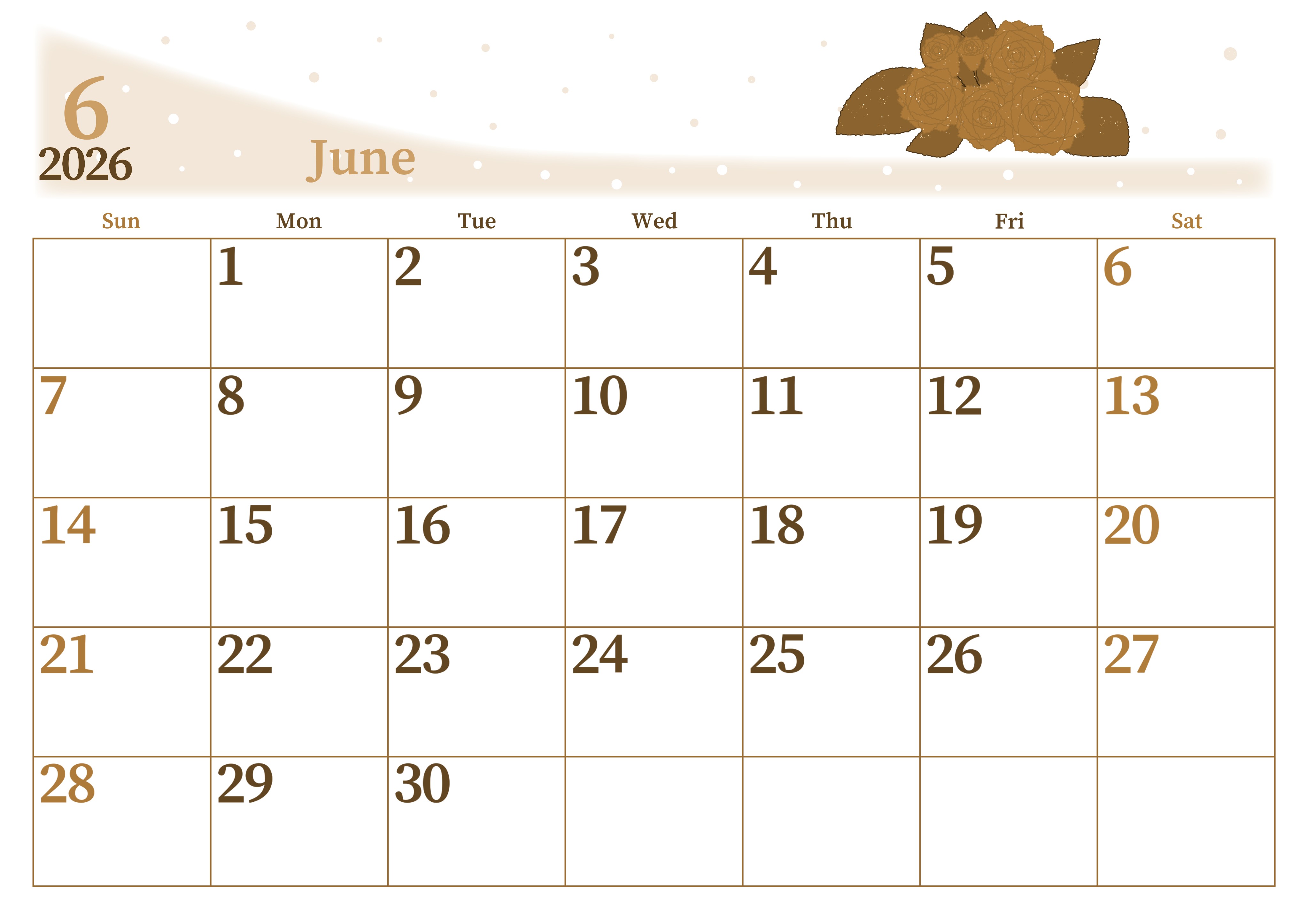 2026年6月横型レトロな日曜始まりの無料テンプレートセピア調カレンダーです。薔薇のイラストがおしゃれで大人っぽいイラストのセピア調カレンダーです。曜日によって文字の色分けが成されているので見やすいフリー素材といえます。(2026-00650600)