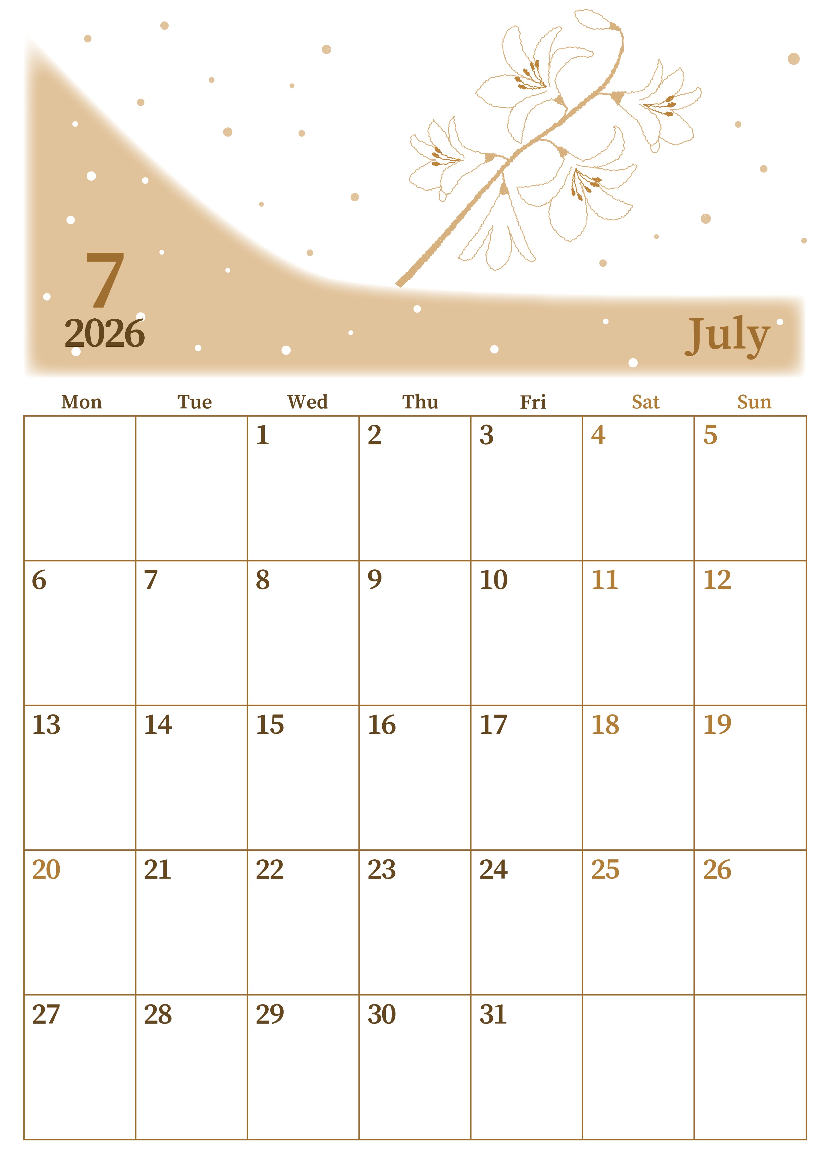 2026年7月縦型レトロな月曜始まりの無料テンプレートセピア調カレンダーです。おしゃれなセピア調カレンダーを探している人にダウンロードをおすすめしたい無料セピア調カレンダーです。イラストには白ユリをとりあげていて落ち着いたおしゃれ感が漂います。(2026-00650711)